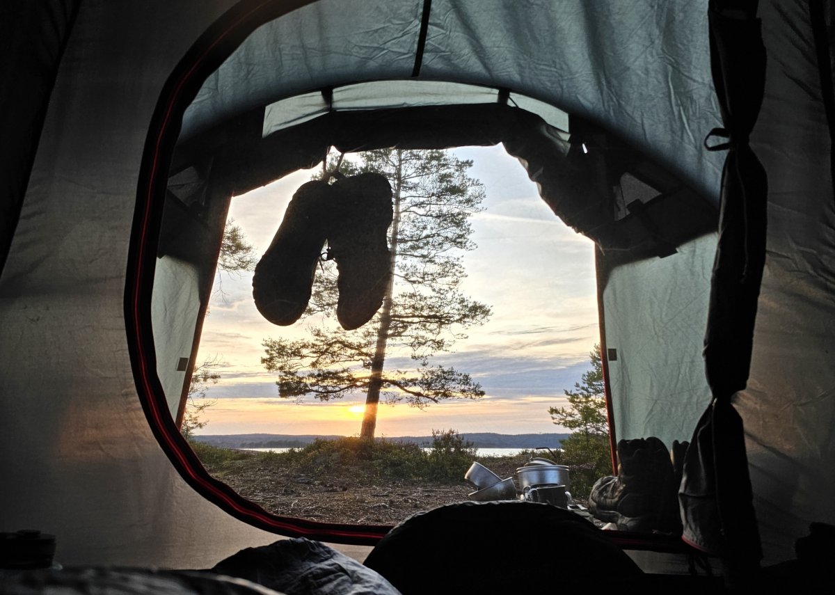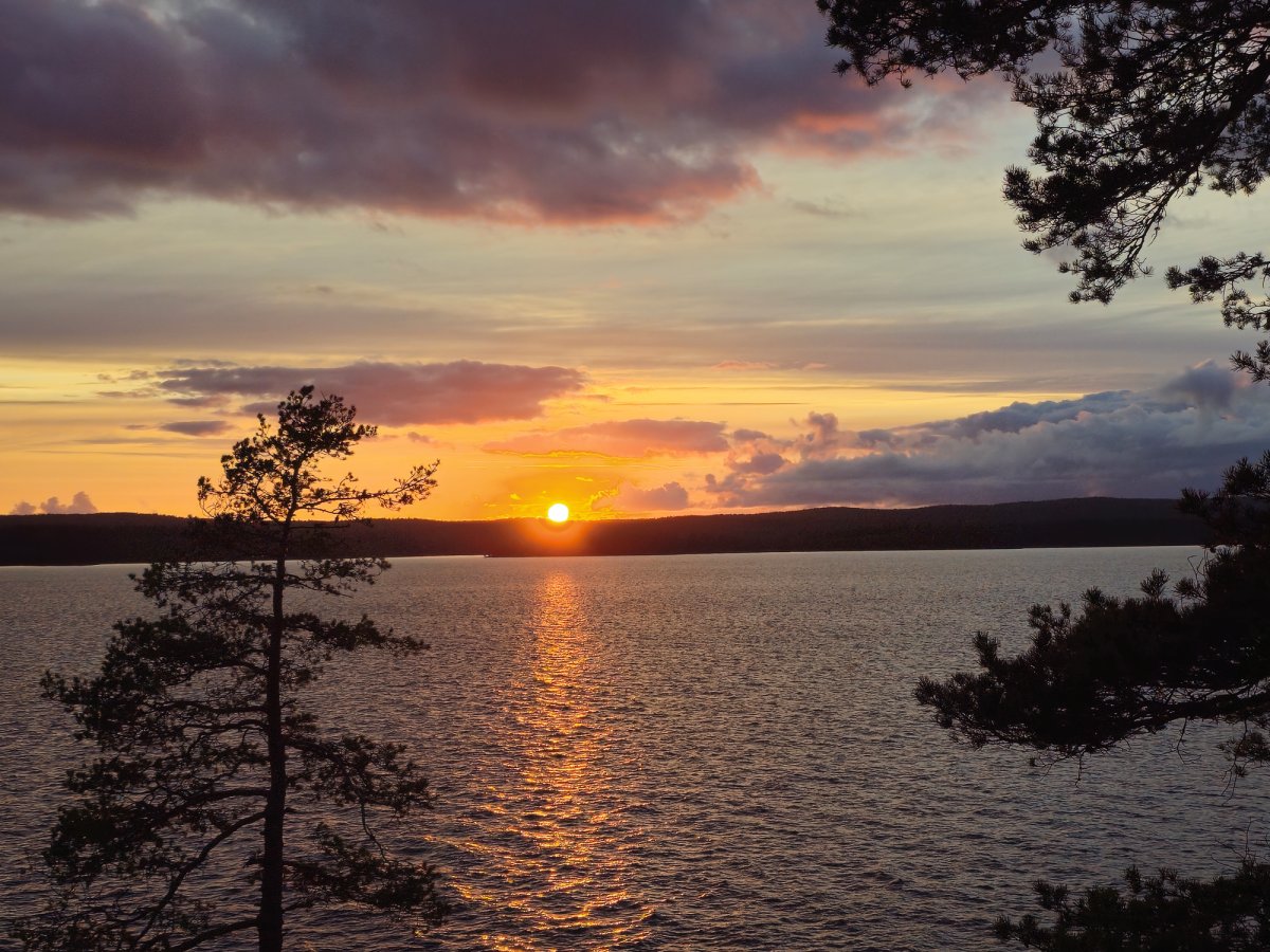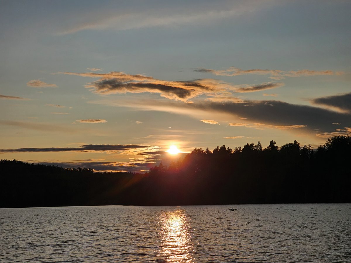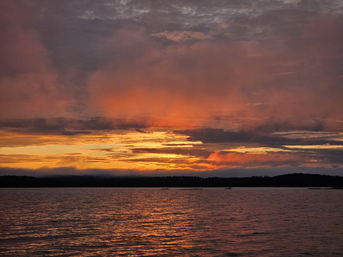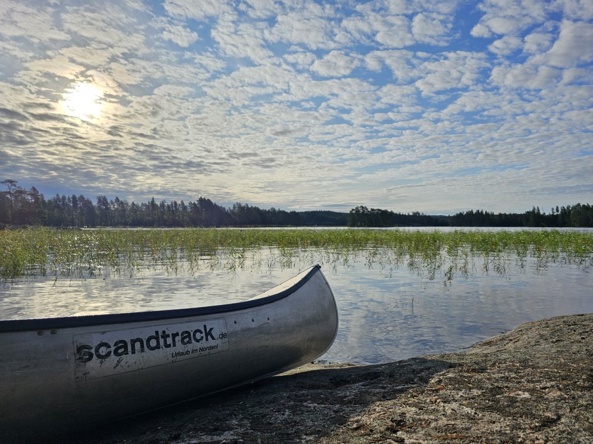 Diese Reise unterschied sich völlig zu den bisherigen Kanutouren im See Foxen. Zunächst einmal muss man das Wetter nehmen, wie es eben kommt. Das führte dazu, dass unser Anreisetag geplagt von heftigen Regenfällen war. So stark, dass Lennartsfors für ein paar Tage von der Außenwelt abgeschnitten war. Der Strand am Basiscamp war völlig überflutet, die Boote wurden über einen wackeligen Steg aus be- und entladen. Organisatorisch muss es eine Mammutaufgabe gewesen sein fürs Team, doch sie haben alle Paddler sicher ins Boot bekommen und hatten stets gute Stimmung verbreitet. Chapeau dafür an das Orga-Team! Zusätzlich zum Starkregen erteilten uns nachts unerwartet heftige Orkanböen. Die Ausrüstung hat ordentlich gelitten, unser Tarp ist gerissen, es war alles nass. Nicht einmal das Toilettenpapier hat die erste Nacht überlebt (Tipp an dieser Stelle: sofort das Klopapier in einer Plastiktüte sicher verstauen ;)). Seit Corona wissen wir ja, wie wertvoll ein Stück Papier des weißen Goldes sein kann. Auch so kann Schweden sein. Wie sagt jedoch ein schöner Spruch: "Wer den Regenbogen will, muss den Regen in Kauf nehmen.". Im Anschluss der ersten harten zwei Tage wurden wir wettertechnisch mit ganz viel Sonne und malerischen Sonnenuntergängen belohnt.