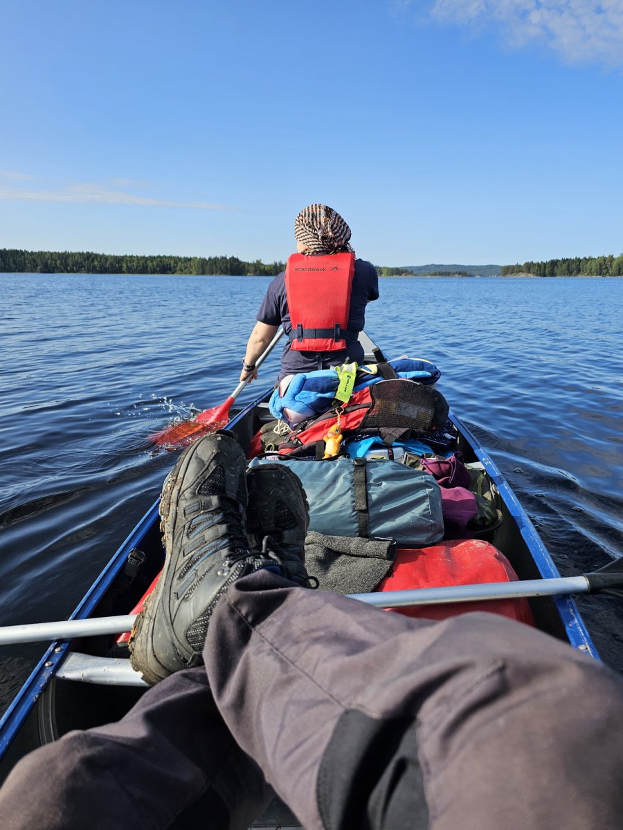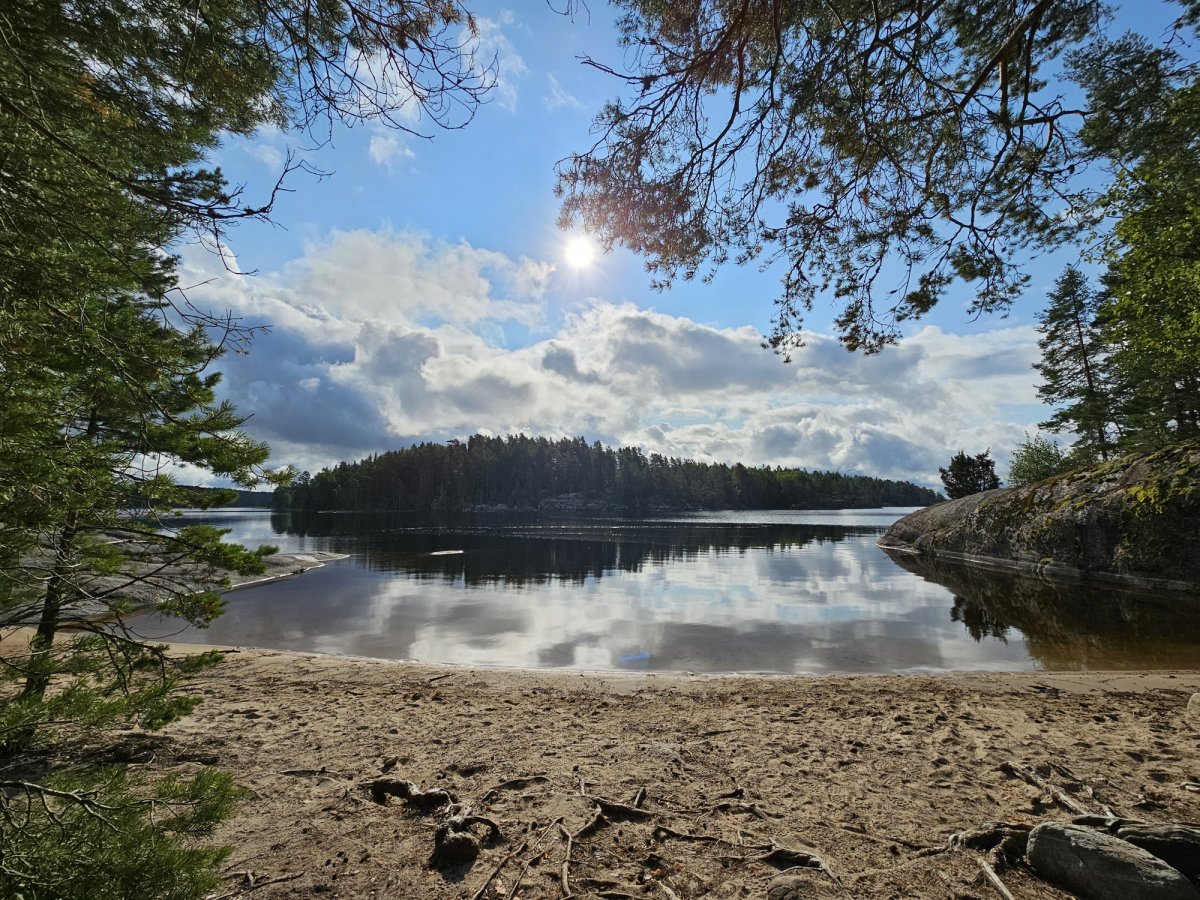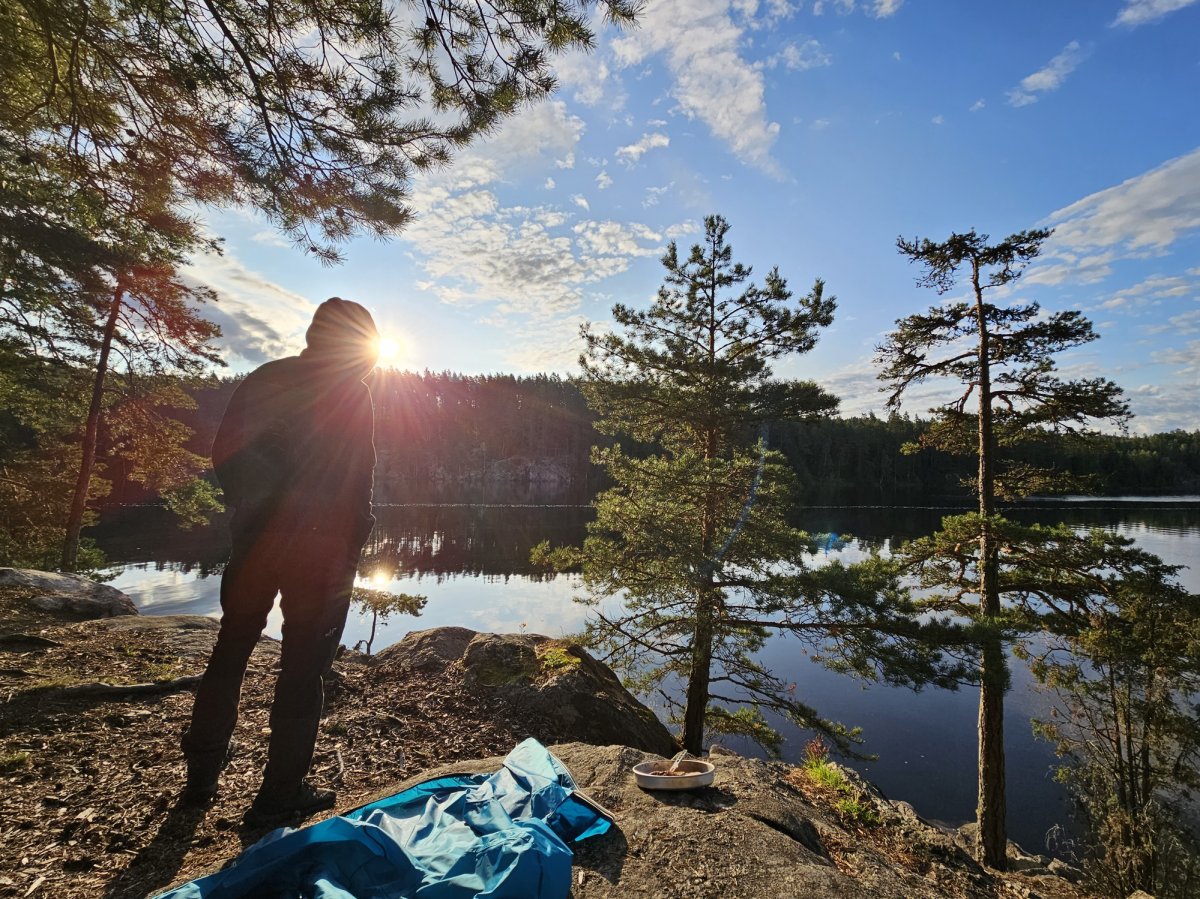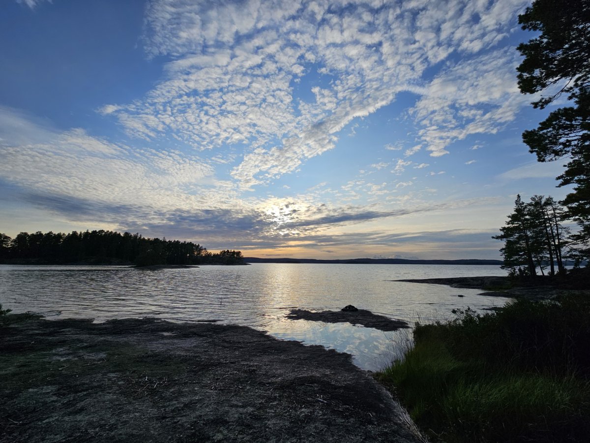 Diese Reise unterschied sich völlig zu den bisherigen Kanutouren im See Foxen. Zunächst einmal muss man das Wetter nehmen, wie es eben kommt. Das führte dazu, dass unser Anreisetag geplagt von heftigen Regenfällen war. So stark, dass Lennartsfors für ein paar Tage von der Außenwelt abgeschnitten war. Der Strand am Basiscamp war völlig überflutet, die Boote wurden über einen wackeligen Steg aus be- und entladen. Organisatorisch muss es eine Mammutaufgabe gewesen sein fürs Team, doch sie haben alle Paddler sicher ins Boot bekommen und hatten stets gute Stimmung verbreitet. Chapeau dafür an das Orga-Team! Zusätzlich zum Starkregen erteilten uns nachts unerwartet heftige Orkanböen. Die Ausrüstung hat ordentlich gelitten, unser Tarp ist gerissen, es war alles nass. Nicht einmal das Toilettenpapier hat die erste Nacht überlebt (Tipp an dieser Stelle: sofort das Klopapier in einer Plastiktüte sicher verstauen ;)). Seit Corona wissen wir ja, wie wertvoll ein Stück Papier des weißen Goldes sein kann. Auch so kann Schweden sein. Wie sagt jedoch ein schöner Spruch: "Wer den Regenbogen will, muss den Regen in Kauf nehmen.". Im Anschluss der ersten harten zwei Tage wurden wir wettertechnisch mit ganz viel Sonne und malerischen Sonnenuntergängen belohnt.