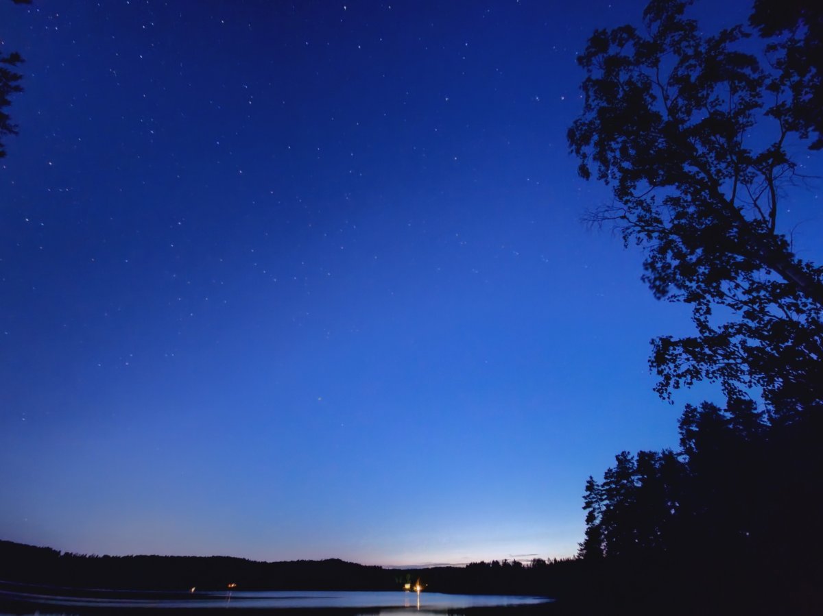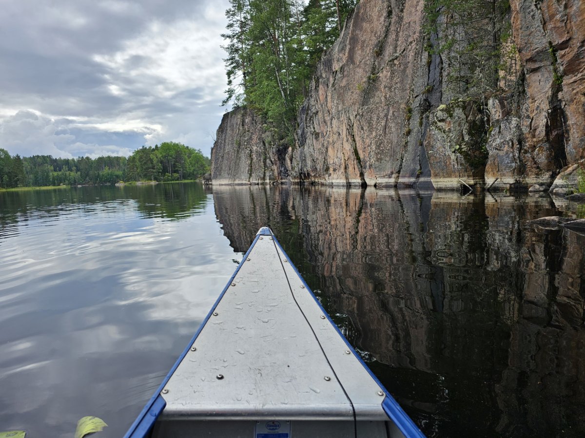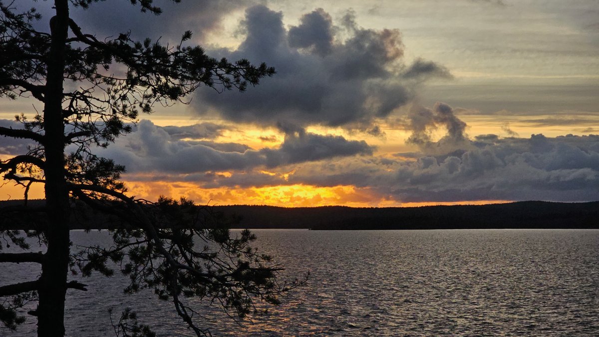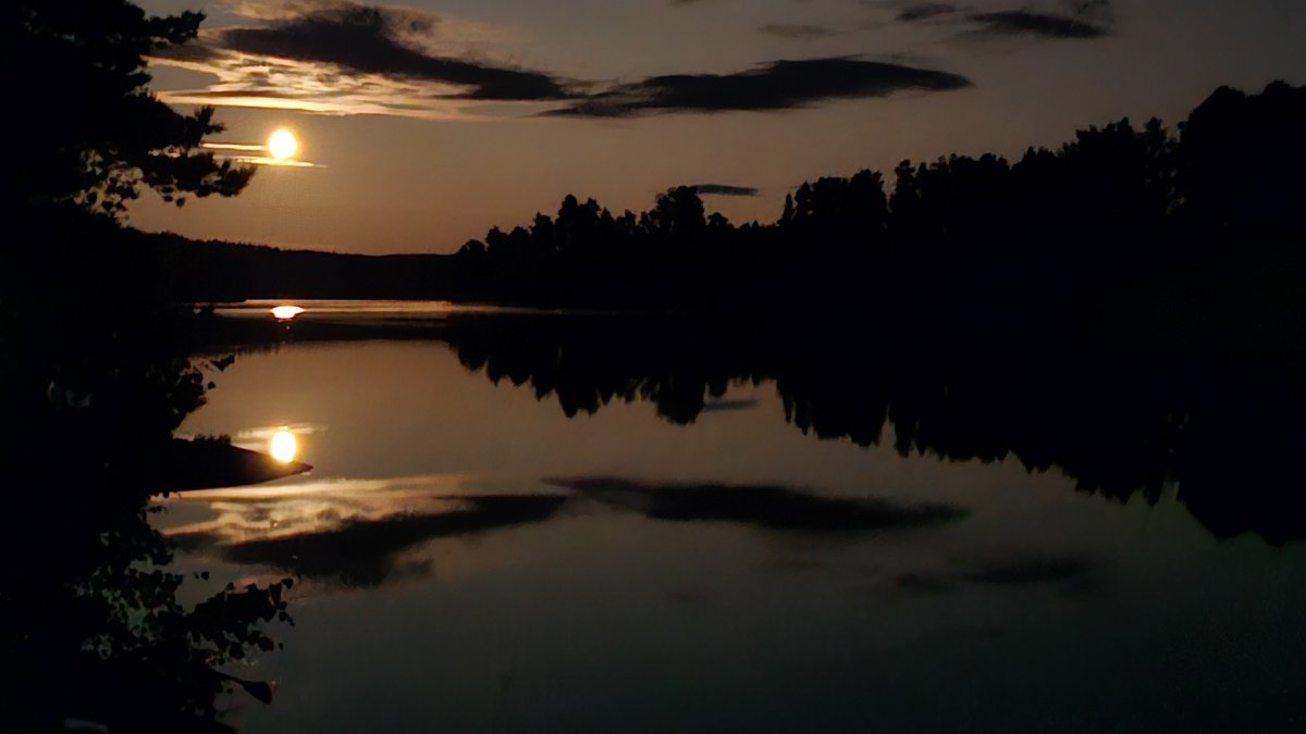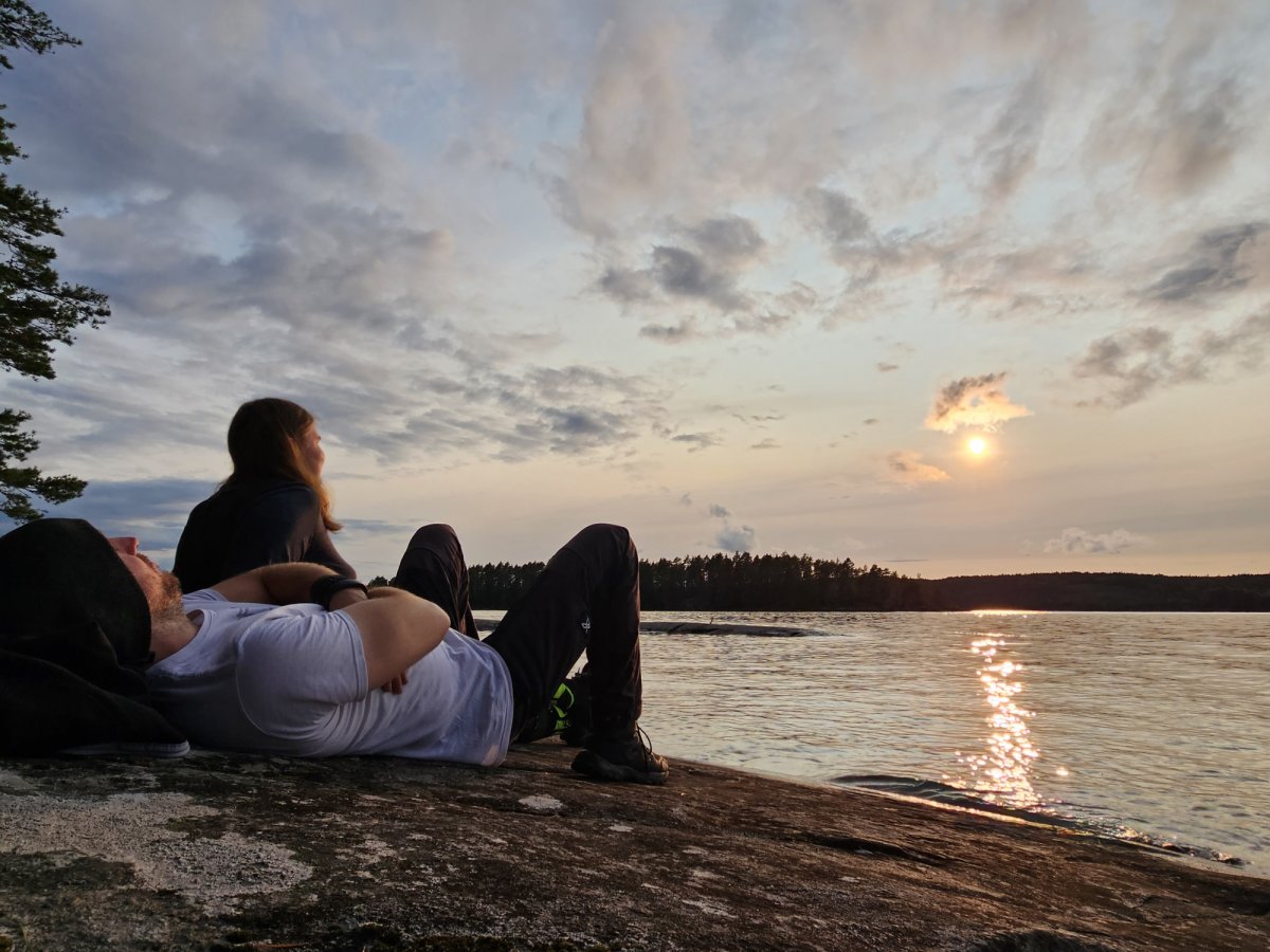 Diese Reise unterschied sich völlig zu den bisherigen Kanutouren im See Foxen. Zunächst einmal muss man das Wetter nehmen, wie es eben kommt. Das führte dazu, dass unser Anreisetag geplagt von heftigen Regenfällen war. So stark, dass Lennartsfors für ein paar Tage von der Außenwelt abgeschnitten war. Der Strand am Basiscamp war völlig überflutet, die Boote wurden über einen wackeligen Steg aus be- und entladen. Organisatorisch muss es eine Mammutaufgabe gewesen sein fürs Team, doch sie haben alle Paddler sicher ins Boot bekommen und hatten stets gute Stimmung verbreitet. Chapeau dafür an das Orga-Team! Zusätzlich zum Starkregen erteilten uns nachts unerwartet heftige Orkanböen. Die Ausrüstung hat ordentlich gelitten, unser Tarp ist gerissen, es war alles nass. Nicht einmal das Toilettenpapier hat die erste Nacht überlebt (Tipp an dieser Stelle: sofort das Klopapier in einer Plastiktüte sicher verstauen ;)). Seit Corona wissen wir ja, wie wertvoll ein Stück Papier des weißen Goldes sein kann. Auch so kann Schweden sein. Wie sagt jedoch ein schöner Spruch: "Wer den Regenbogen will, muss den Regen in Kauf nehmen.". Im Anschluss der ersten harten zwei Tage wurden wir wettertechnisch mit ganz viel Sonne und malerischen Sonnenuntergängen belohnt.