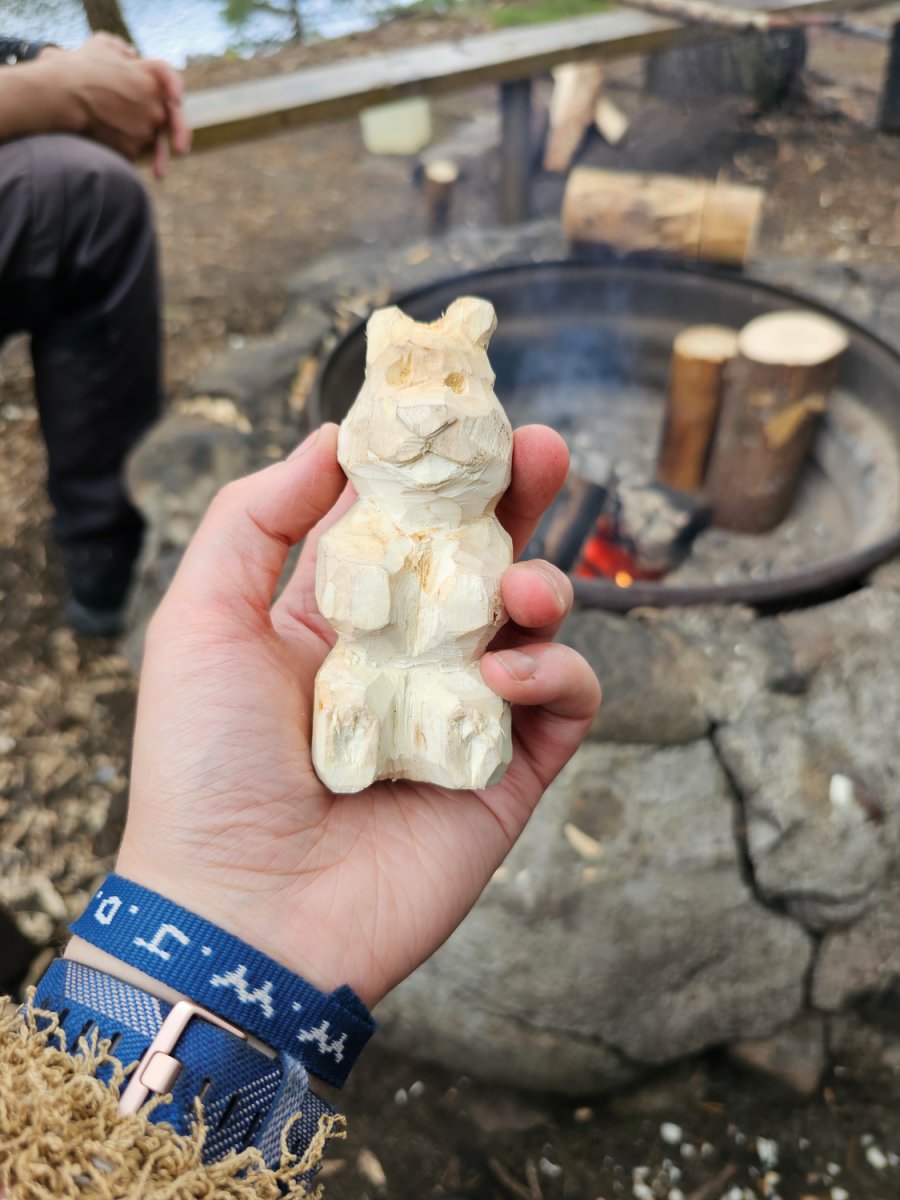 Wer mag, kann die freie Zeit - besonders an Tagen, wo man keine Feuerstelle ergattern konnte - zum Angeln nutzen oder ganz entspannt aus der Hängematte heraus die Ruhe der Natur genießen. Oder die Kreativader wird angeregt und man schnitzt eine süße Bärenfigur. Die Natur hat so viel zu bieten :). Smartphone Fernseher, Computer oder sonstige elektronische Geräte vermisst man erst wieder ab der langen Busfahrt - hust.