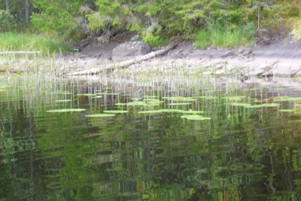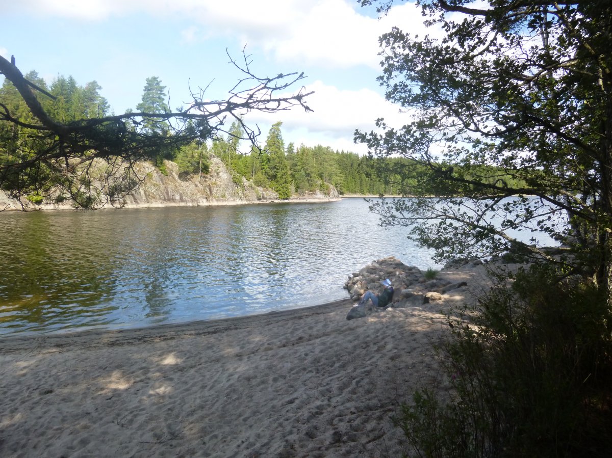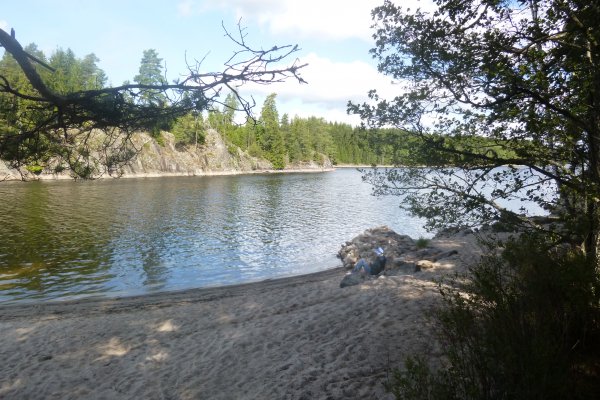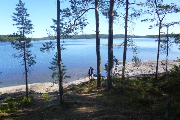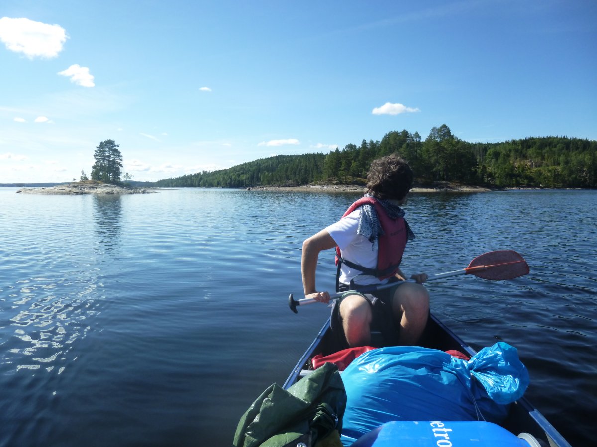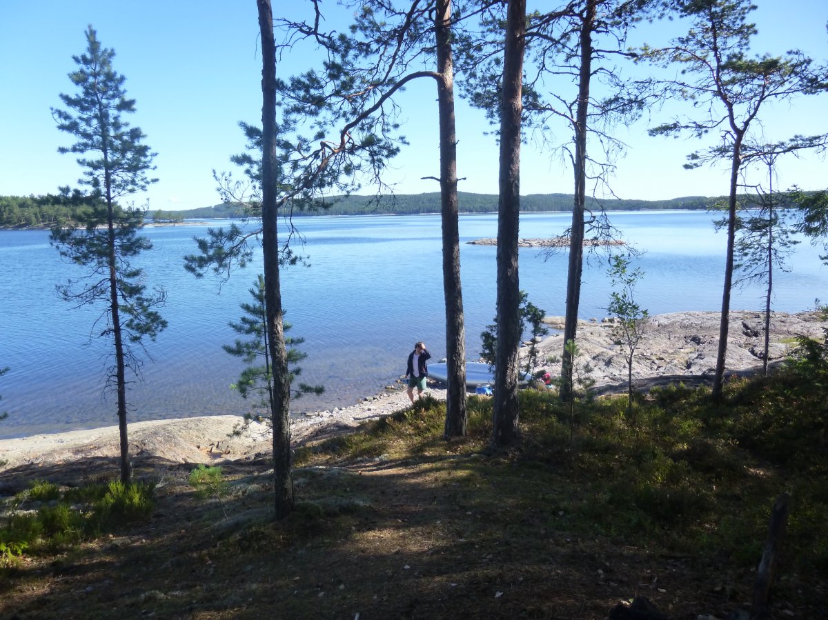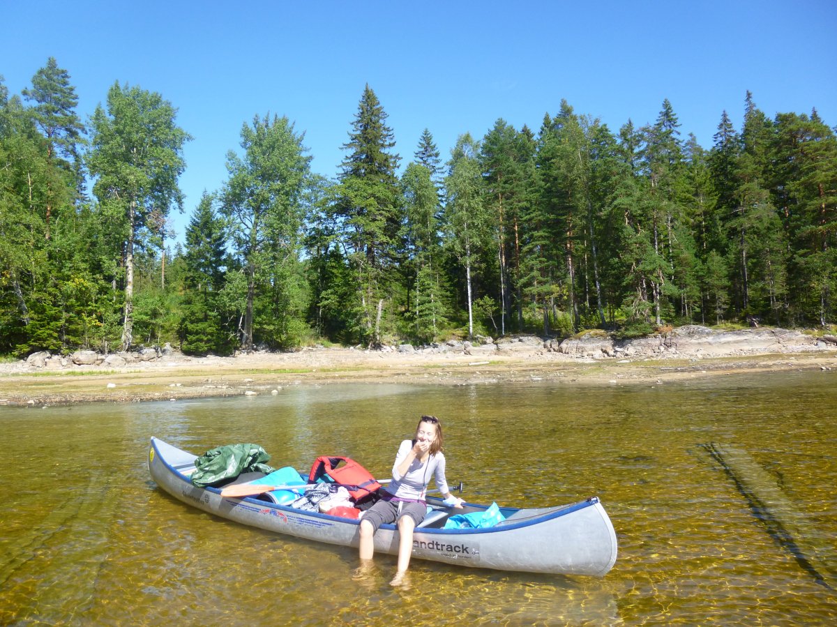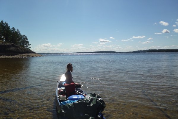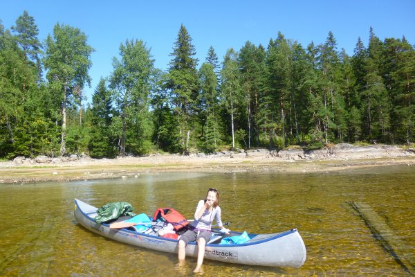 Jetzt heißt es erstmal wieder Schlafsack einpacken, Isomatte zusammenrollen, Zelt zusammenbauen, Boot umdrehen und bepacken. Das Wetter ist heute besser als gestern, also nehmen wir uns vor eine ganze Strecke gen Norden zurückzulegen. Ich schaffe es wieder ohne nasse Füße ins Boot zu kommen. Wir fahren los. Mein Freund hatte Kanufahren schon in der Schule und kann deswegen gut lenken und sitzt daher immer hinten. Wir fahren ein ganzes Stück bis wir an einer unglaublich schönen Bucht vorbei kommen. Dort machen wir Pause. Mein Freund geht dort schwimmen und ich geniesse die Sonne.