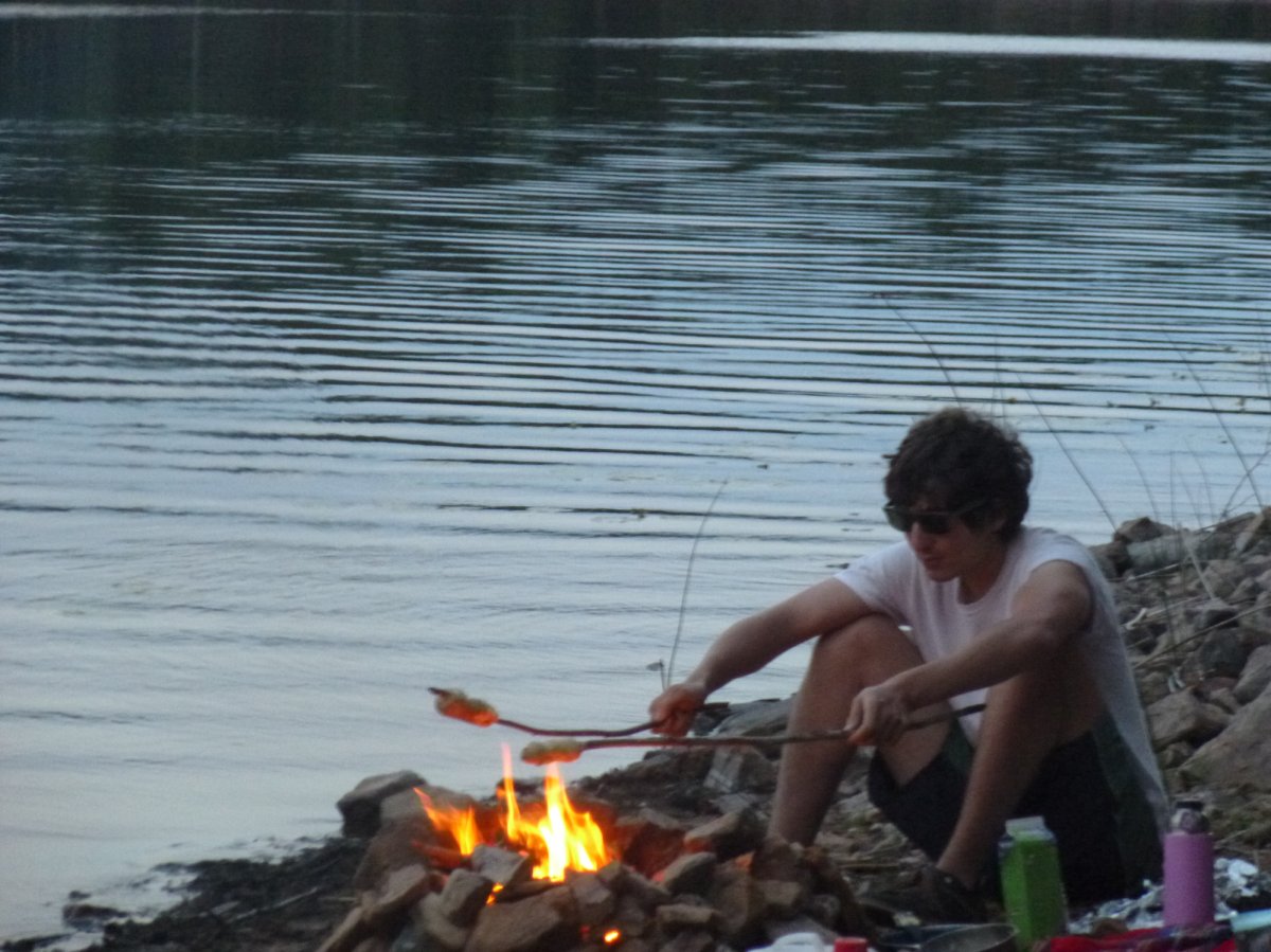 Dann geht es weiter. Richtung Schleuse. Ich habe Angst vor der Schleuse. Überall wurde vor Schleusen gewarnt. Bleibt immer in der Mitte, sonst werdet ihr abgedrängt; passt auf die großen Schiffe auf, denn die werden nicht auf euch aufpassen und der Schleusenwärter schaut sowieso nicht nach euch. Mein Freund meint noch, dass wir Seile bekommen, an denen wir uns festhalten müssen. Einer bekäme von rechts ein Seil und der andere von links. Dann muss man mit den Beinen das Boot grade halten, während man das Seil mit den Händen festhält. Eine etwas beängstigende Vorstellung. So finde ich es gar nicht so schlimm, als uns der Schleusenwärter mitteilt, dass die Schleuse für heute zu hat und, dass wir am nächsten Morgen um 9 Uhr wieder da sein sollen. Also paddeln wir ein Stück zurück und suchen uns einen geeigneten Schlafplatz. Wir finden einen kleinen Strand und naja ihr wisst schon, laden das Boot aus, drehen es rum, bauen das Zelt auf..... Same procedure as every day. Obwohl wir an keinem offiziellen DANO sind entscheiden wir uns, ein kleines Feuer und Stockbrot zu machen. Ich baue eine Feuerstelle ganz nah am Wasser, so dass auch wirklich keine Waldbrandgefahr besteht, knete den Teig und mache Knobibutter. So endet der Tag gemütlich am Lagerfeuer. Also nicht ganz, denn man muss ja immer noch abwaschen, Sachen zuammenräumen... Das müssen wir dieses mal ganz im Dunkeln tun, da wir erst so spät angekommen waren. Mein Plan war es eigentlich immer um spätestens 6 Uhr irgendwo anzukommen, um noch in Ruhe kochen und abwaschen zu können. Ich glaube, das hat nie geklappt. Nicht zuletzt deshalb, weil der Akku des Handys leer ist und wir deshalb nie wussten, wie spät es war.