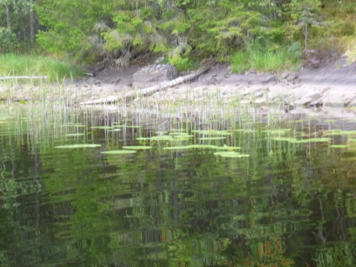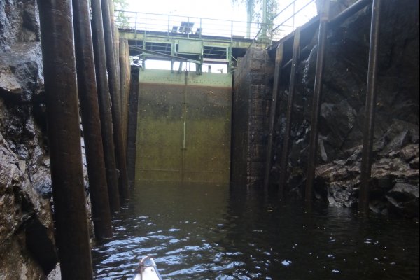 Wir wachen-zum Glück ganz trocken- auf und sind dankbar, dass unser Zelt so gut durchgehalten hat. Meine, zum Trocknen aufgehängte, Wäsche ist durchnässt. Von nun an reisen wir also mit einer Plastiktüte voller nasser Klamotten weiter. Wir frühstücken gemütlich und dann heißt es schon wieder, Boot bepacken und los geht’s. Da wir jetzt bei der Hälfte der Woche angekommen sind, beschliessen wir den Rückweg anzutreten. Wenn wir frühzeitig in der Nähe des Camps sind, dann können wir ja noch einen Abstecher Richtung Osten machen, denn da sind auch noch sehr süße kleine Flüsse. Dass daran später gar nicht mehr zu denken ist, ahnen wir noch nicht. Wir fahren also den wunderschönen Weg wieder zurück und treffen unterwegs zwei Mitreisende. Zusammen schippern wir zur Schleuse. An der Schleuse angekommen, sind wir ein bisschen ratlos, denn der Schleusenwärter scheint bei der anderen Kammer zu sein. Woher weiß er dann, dass wir hier sind? Die drei Jungs beschliessen zur anderen Kammer zu rennen, um den Schleusenwärter zu holen. Ich kann mir nicht vorstellen, dass dies der einzige Weg ist, ihm bescheid zu geben und suche nach einer Klingel. Mein Freund findet eine und sagt dem Schleusenwärter durch eine Art Telefon, dass wir da sind. So wurde den Jungs ein 2 Kilometermarsch erspart. Wir müssen ein bisschen warten, da noch andere Kanufahrer von der anderen Seite durch die Schleuse durchfahren. Die Zeit nutzen wir um unseren Müll bei Coop zu entsorgen und uns mit den Mitreisenden auszutauschen. Wir stellen fest, dass die beiden Jungs schon einige Tage vor uns im Norden ankamen. Sie waren viel schneller als wir. So wie jeder. So oft sehen wir andere Kanufahrer an uns vorbei rauschen und fragen uns, wie die das wohl machen. Der Schleusenwärter erzählt uns, dass es dieses Jahr keine Blaubeeren gibt, da es zu wenig geregnet hatte. Aha. Das erklärt also, warum wir bisher jede Nacht auf Blaubeerstrauchinseln geschlafen haben, aber keine Blaubeeren gesehen haben. Das Schleusentor öffnet sich und wir fahren zusammen mit dem anderen Kanu in die Kammer. Mit einem anderen Kanu zu schleusen macht noch mehr Spaß, denn so muss nur das äußere Kanu das Seil festhalten und klemmt das innere Kanu quasi ein. Unser Kanu steht aussen und so bekommen wir die Seile zugeworfen. Ich erinnere mich noch an die Hinfahrt und weiß, das Seil muss immer kürzer werden und ich muss es immer straff nachziehen. Das stellt sich dieses mal aber viel komplizierter dar. Ich ziehe und ziehe an diesem Seil. Mein Freund meinte später, es sah aus, als würde ich bald abheben. Irgendwann kapiere auch ich, dass die Schleuse dieses mal ja Wasser ablässt, da wir ja auf dem Rückweg sind. Das Seil muss also länger statt kürzer werden.