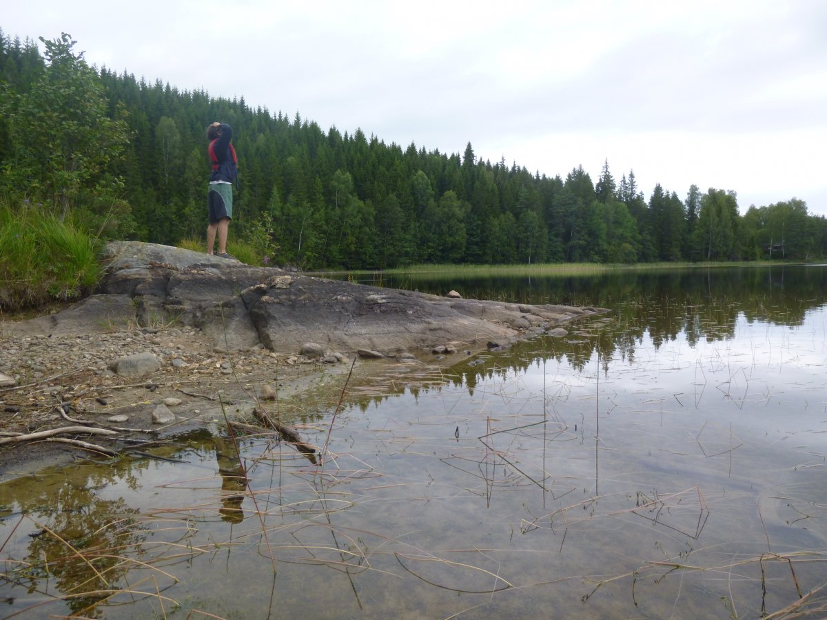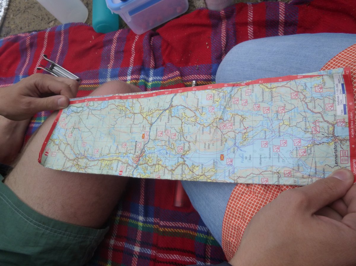 Der erste richtige Kanutag. Gemütlich frühstücken wir und stellen fest, dass das Eiweißbrot von Scandtrack gar nicht so schlecht schmeckt. Wir freuen uns total loszufahren. Aber zuerst wollen wir die Insel ein bisschen erkunden. Ein Grund, warum ich mich auf Schweden einließ war, dass Schweden das Land der Blaubeeren ist. Und ich liebe Blaubeeren. Also laufen wir mit Tupperbox los, um Beeren zu pflücken. Da sind Blaubeersträucher. Überall! Wie schön! Und da ist sogar eine Blaubeere! Eine sehr kleine. Und nur eine. Mh wo sind die anderen? Naja, vielleicht haben wir auf einer anderen Insel mehr Glück. Statt Blaubeeren findet mein Freund Pilze. Wir haben beide keine Ahnung von Pilzen! Mein Freund glaubt aber, Ahnung zu haben. Ich bestehe darauf, dass wir den Pilz mit der Abbildung aus dem Outdoorbuch vergleichen, das wir von Scandtrack bekommen haben. Nein, die sehen sich nicht ähnlich. Also weg mit den Pilzen.