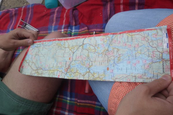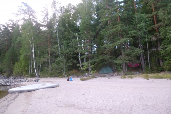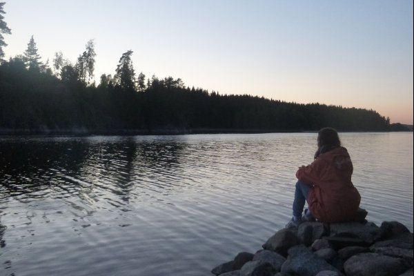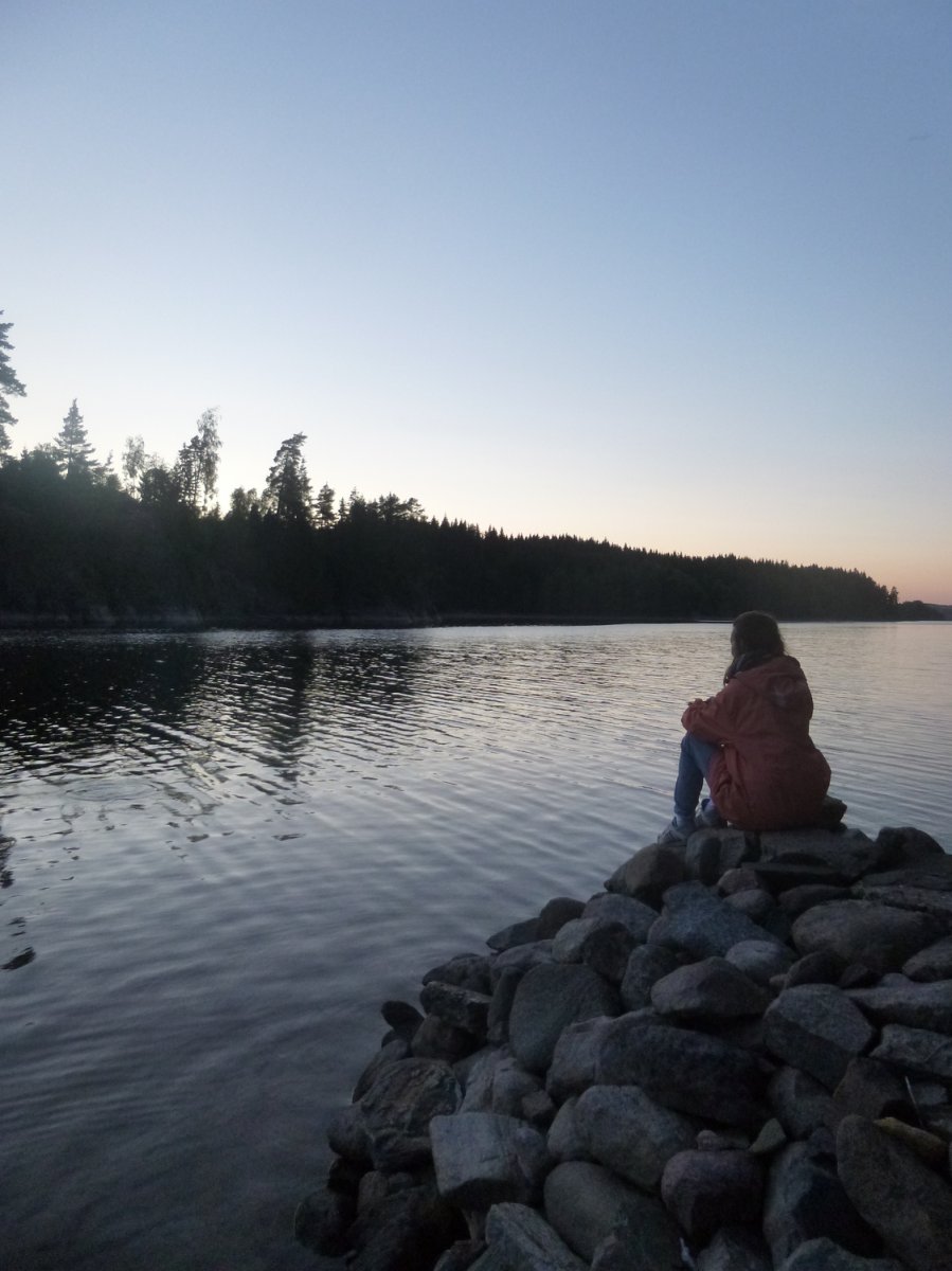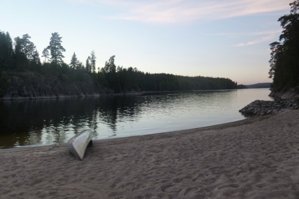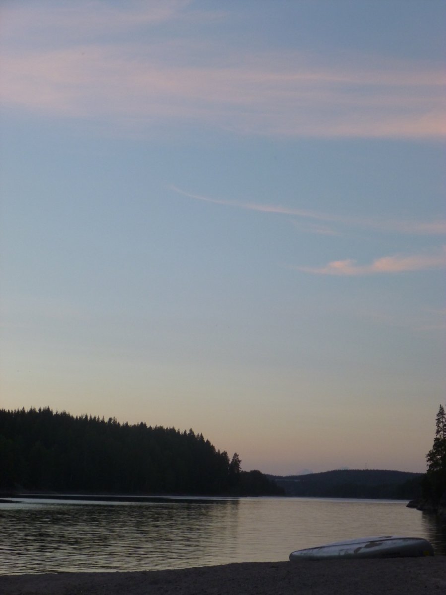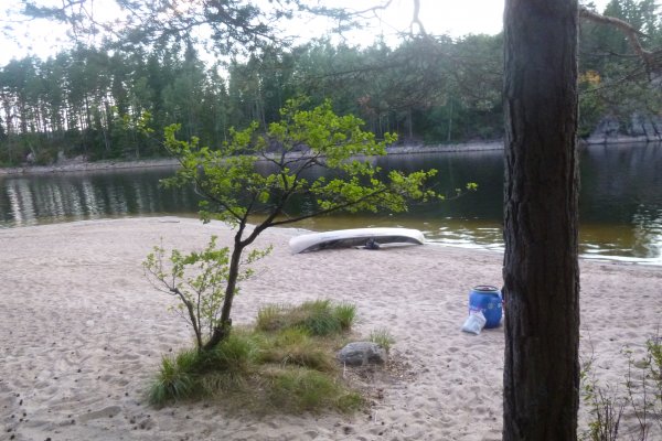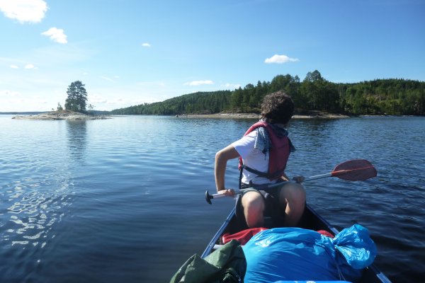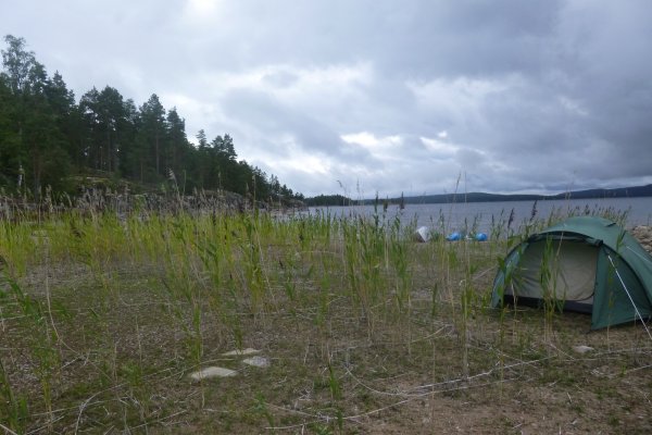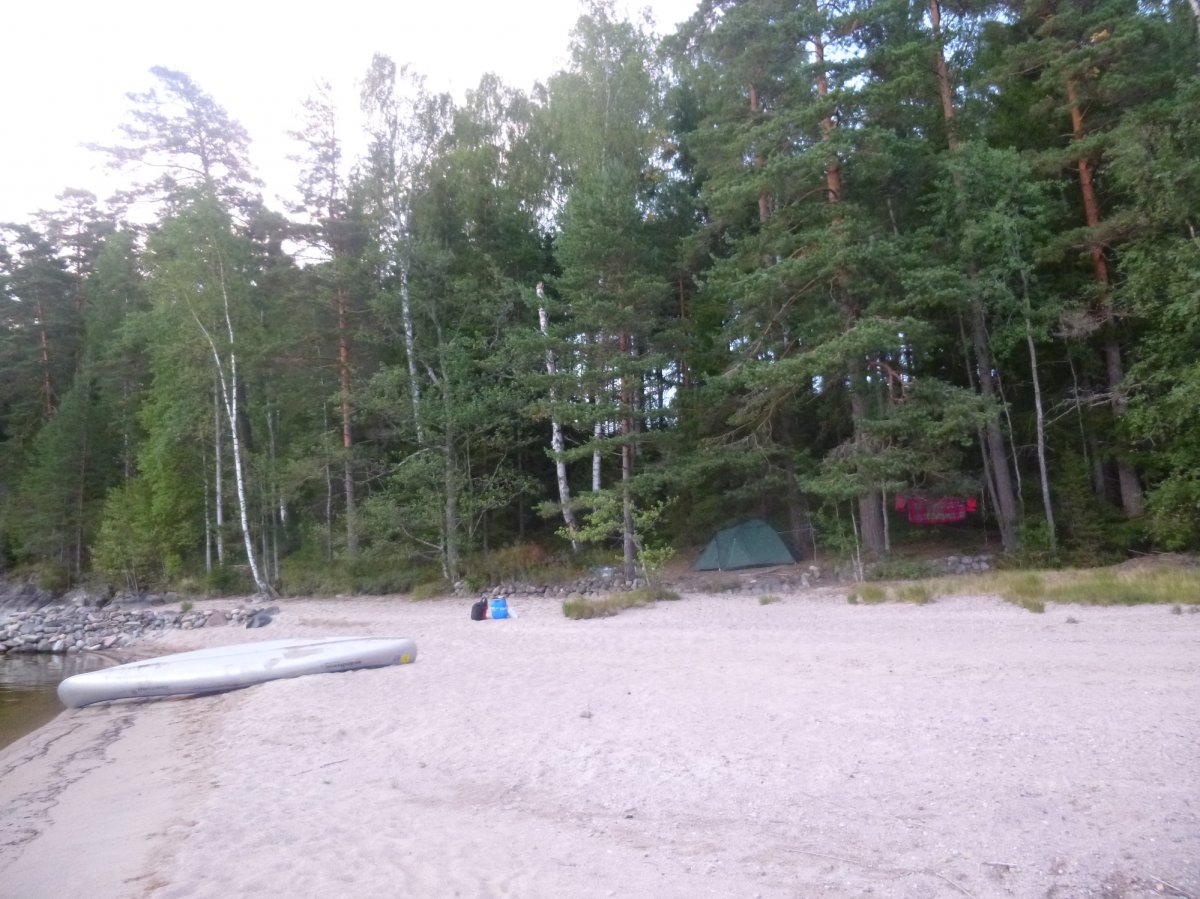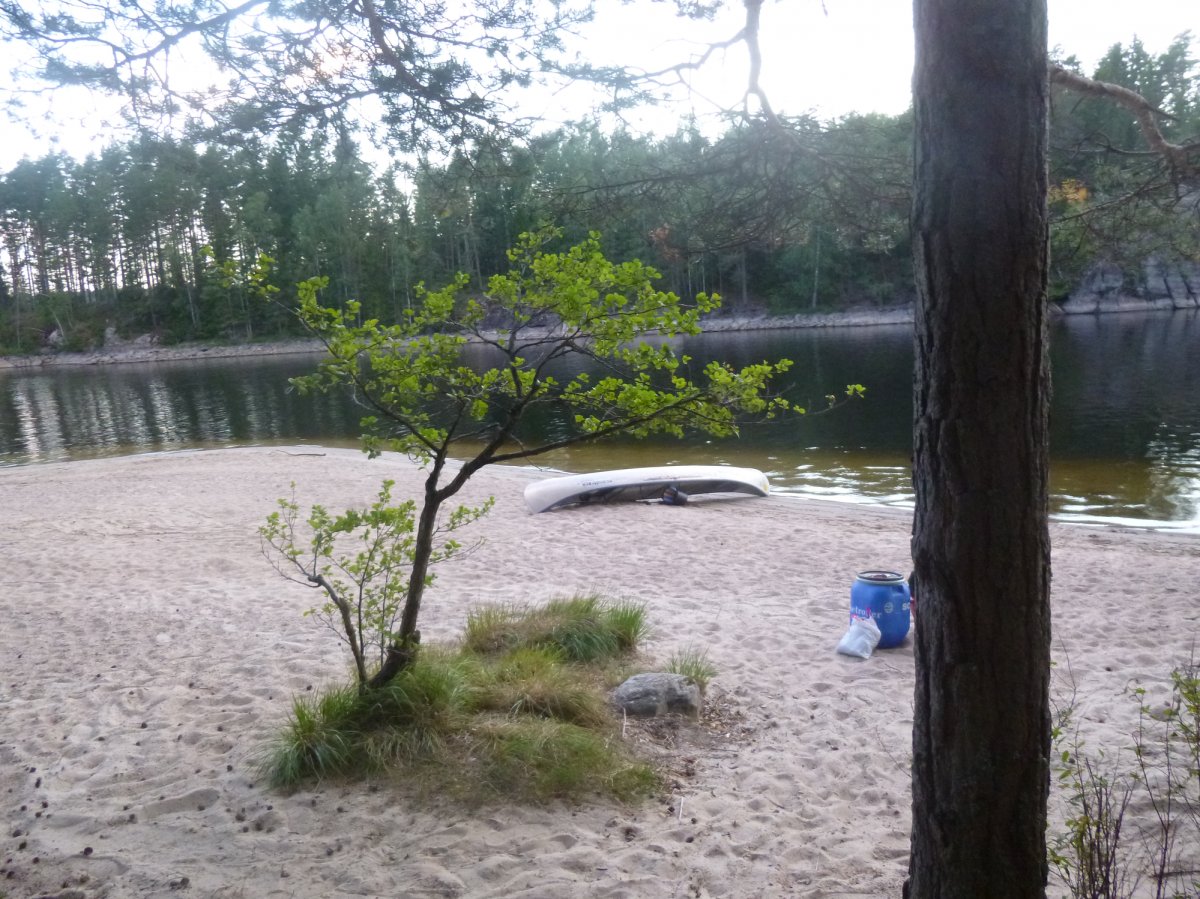 Da es in der Bucht sehr windstill ist, nutzt mein Freund die Gelegenheit um mir das Lenken beizubringen. Also sitze ich hinten als wir weiterfahren. Als die Wellen etwas stärker werden fahre ich irgendwie immer in Eierform. So entscheiden wir uns wieder Plätze zu tauschen. Gott sei Dank wie sich später herausstellen sollte. Wir wissen, dass links von uns die Insel Bäron liegt, aber was ist das was danach kommt? Es sieht aus als wären wir in einer Sackgasse. Erst später sollten wir lernen, dass alles aus der Entfernung wie eine Sackgasse aussieht und man die Wege einfach noch nicht sehen kann, wenn man zu weit weg ist. Wir fragen vorbeifahrende Scandtracker, wo wir sind. „Bei der Insel Bäron glauben wir“. Mh ja soweit waren wir auch, aber geht es da vorne weiter? „Keine Ahnung“. Als wir an der Insel vorbei fahren werden die Wellen erheblich größer und der Wind stärker. Ohje, wir haben keine Ahnung mehr, wo wir hin müssen und ich bekomme Angst, da die Wellen so stark sind, dass sie uns locker zum kentern bringen könnten, falls wir seitlich zu ihnen stehen sollten. Da die Wellen von Westen kommen, fahren wir ihnen einfach entgegen, um nicht die ganze Zeit seitlich zu ihnen zu fahren. Das bedeutet, dass wir auf dem Weg sind, den ca 3 km breiten Fluss zu überqueren. Mein Vater hatte mir vor Abreise Nahe gelegt, dass wir maximal 15 Meter vom Ufer entfernt entlang fahren sollten. Jetzt befinden wir uns auf der Mitte des Sees. Das Ufer hinter uns ist ca 1,5 km von uns entfernt, das Ufer vor uns auch. Und das bei den Wellen. Klasse! Mit aller Kraft paddeln wir der Strömung entgegen, aber irgendwie scheinen wir dem Ufer nicht näher zu kommen. Dafür löst sich aber unsere Plane und fliegt fast weg. Mein Freund fängt sie grade noch auf, während er akrobatisch dafür sorgt, dass unser Kanu nicht seitlich zu den Wellen steht. Nach gefühlten (und wahrscheinlich auch tatsächlichen) 3 Stunden kommen wir an einer kleinen Insel an. Endlich! Sie besteht nur aus Felsen. Also fahren wir weiter. Die kleine Insel danach sieht schon grüner aus. Ich kann mir trotzdem nicht vorstellen, dass wir da einen Platz finden, um das Zelt aufzubauen. Aber wir finden einen. Und einen weiteren sehr schönen Platz, um die Picknickdecke auszubreiten. Ich habe das Gefühl, dass wir wirklich ein Schlaf- und ein Esszimmer haben. Die Insel gehört uns. Ein unglaubliches Gefühl! Jetzt heißt es wieder Boot ausladen, umdrehen, Zelt aufbauen, in der Essenstonne wühlen, Kocher aufbauen... Heute essen wir Reis mit Möhrchen und Erbsen und natürlich Zwiebeln. Das Essen schmeckt uns super gut. Nach dem Abwasch geht es erschöpft ins Zelt.