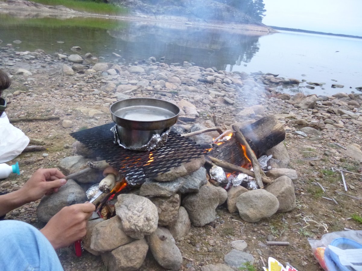 Als wir uns umschauen, bemerken wir, dass wir sogar an der angesteuerten Buch sind. Wir tragen unsere Sachen über die Felsen zu der Bucht. Noch voller Adrenalin beschliesse ich prüde Frostbeule, in den See zu springen und zu baden. Ich bin grade dabei mich auszuziehen als ups da kommen Kajakfahrer. Schnell wieder anziehen. Sie bleiben nur eine viertel Stunde, aber das reicht, um mein Adrenalin so weit zu senken, dass ich danach nicht mehr in den kalten See springe. Wir nutzen die frühe Tageszeit, um Himbeeren zu pflücken, Feuerholz vorzubereiten und –Pilze zu suchen. Dieses mal erfüllen sie alle im Outdoorbuch genannten Kriterien. Ich habe also kein Gegenargument mehr. Heute Abend soll es Pilze geben. Wir bauen einen Steinkreis ganz nah am Wasser. In den Gluten machen wir Alufolienkartoffeln, die Pilze werden auf Stöcken um Feuer angebraten, genauso wie die Würstchen. Da ich denke, dass die Kartoffeln sehr lange brauchen, stelle ich aufs Gitter ein Töpfchen mit Nudelsuppe als Vorspeise. Die Kartoffeln, Pilze und Würstchen sind himmlisch. Die Nudelsuppe ist bis zum Ende nicht warm. Wahrscheinlich steht das Gitter zu hoch über den Flammen. So geht ein weiterer, sehr abenteuerlicher Tag zu Ende. -Natürlich muss erst wieder abgewaschen werden und die Sachen zusammengepackt... Die, durch unsere unsanfte Landung, nass gewordenen Klamotten hänge ich wieder über eine Leine. Wie immer regnet es auch in dieser Nacht. So verabschiede ich mich von dem Gedanken, dass nasse Klamotten jemals wieder trocken werden.