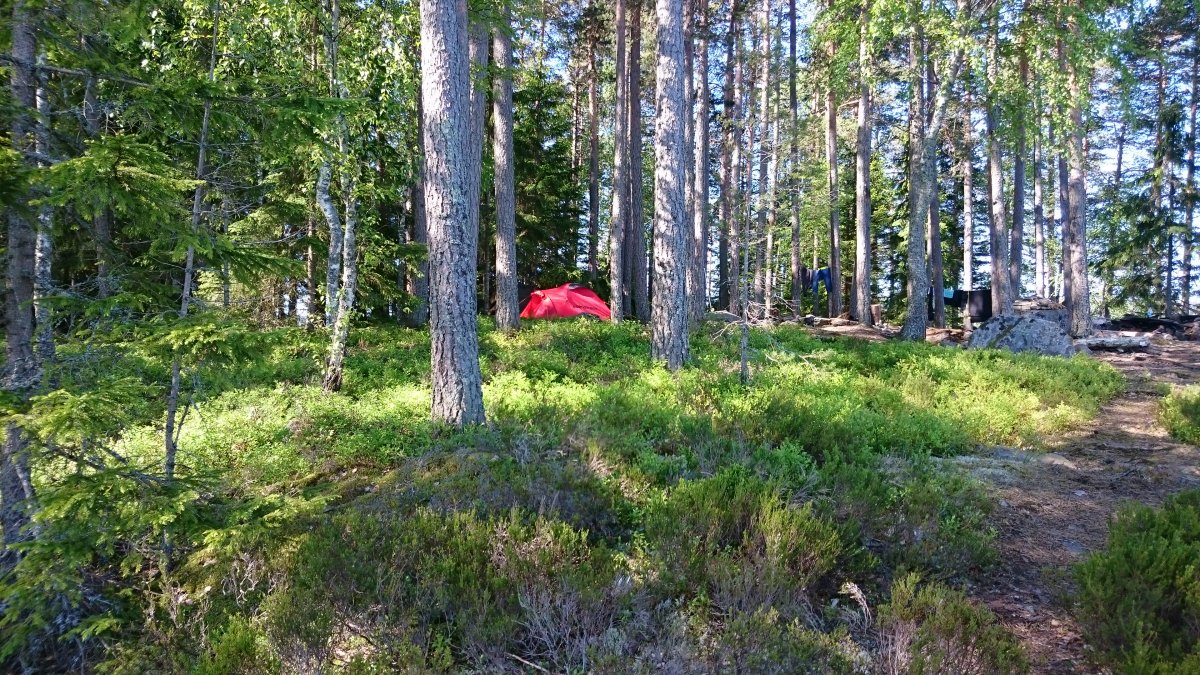 Als allererstes wollte ich einen Donnerbalken bauen, weil ich gelesen hatte dass wir für unsere Notdurft ein Loch buddeln müssen. Überraschung - im Wäldchen auf Bockön 1 befand sich ein Plumsloch mit einem kleinen Häuschen drum herum. Vielen Dank liebes Team von Scandtrack! Wir bauten aus dem Tarp, was zur Ausrüstung gehörte, erstmal ein A, so dass wir unser Hab und Gut im sicheren Trocken wussten. Wer wusste schon, was der Himmel noch so zu bieten hatte.