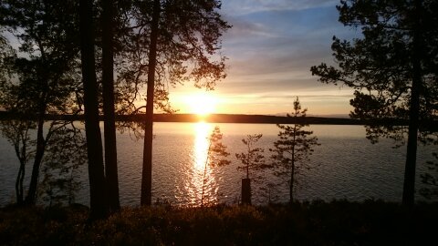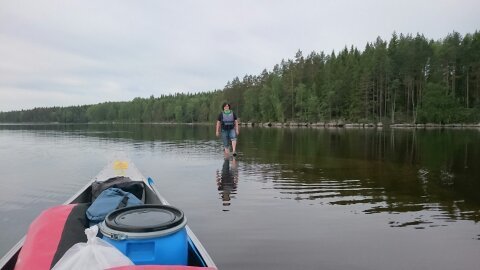 Dann der absolute Hammer - auf 10 Uhr steht eine Elchkuh, auf einer kleinen Insel vor dem Festland und knappert an einem Bäumchen. Wir waren mit einem Schlag mucksmäuschenstill, die Paddel rein und bloß nicht atmen! Der Wind und die Wellen trieben uns direkt in die Bucht immer näher zum Elch. Das Boot ließen wir treiben und wir hielten immer noch den Atem an. Sie hörte uns nicht, wir kamen immer näher, unsere Herzen pochten, leise leise - ja keine Geräusche machen. Jetzt trennten uns nur noch gefühlte 5m. Die Kuh sah auf, sie sah uns an, beobachtete uns, zögerte kurz und dann lief sie los. Einfach gigantisch und atemberaubend, zu erleben und so nah zu sehen, wie sie durch das Wasser flüchtete. Wir haben die Flucht auf Video aufnehmen können. Dieses schauten wir uns vor lauter Euphorie an diesen Abend immer und immer wieder an.