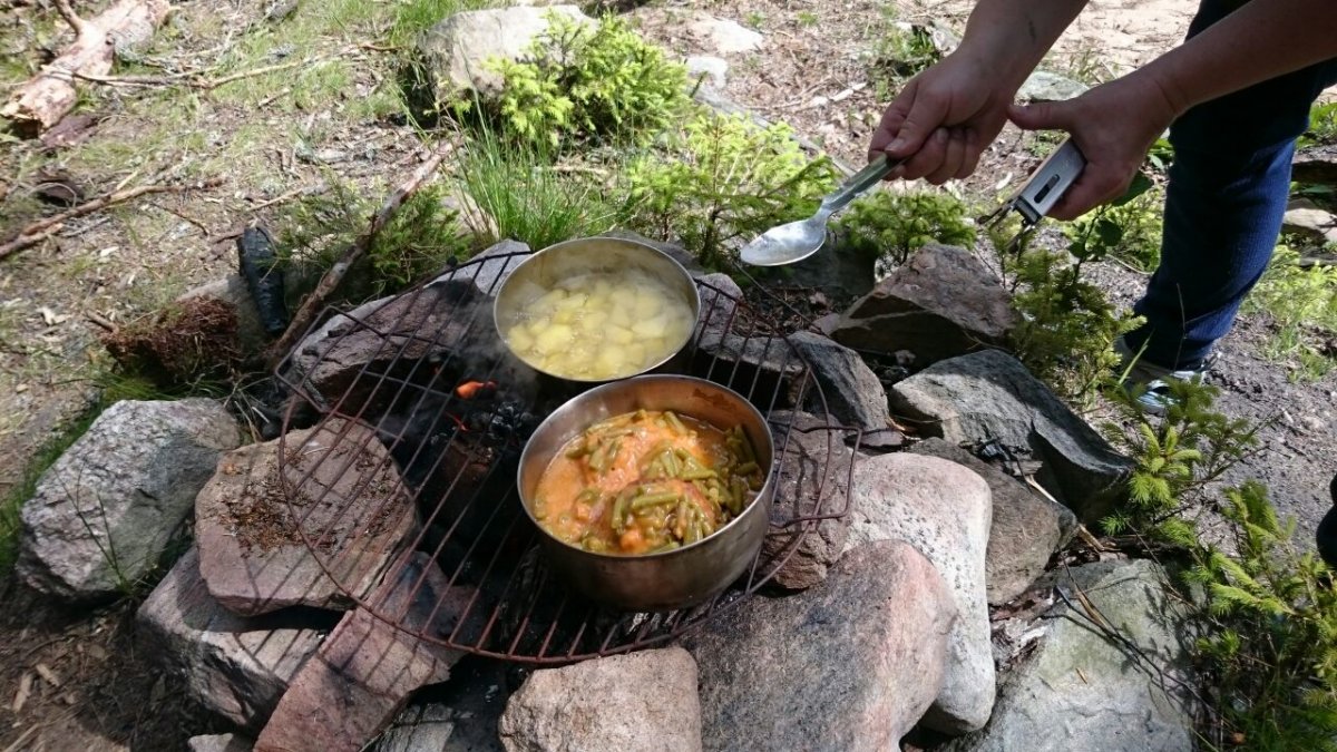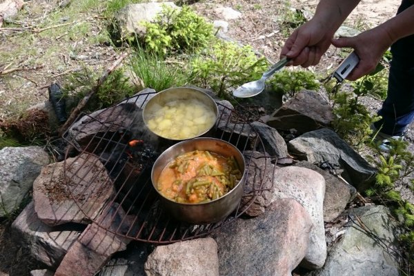 Einen geeigneten Platz für unser Zelt fanden wir neben einer umgekippten Fichte, die uns hervorragenden Windschutz bot. Wie vorausgesagt nahm der Wind noch erheblich zu, so dass wir am Sonntag wirklich nicht aufs Wasser konnten. Wir nutzten den Tag zum Holzsägen und -hacken, unsere Provianttonne zu durchleuchten und zu sortieren. Wir hatten dabei sehr viel Spaß und kamen uns vor wie kleine Kinder, die Geschenke auspackten. Die Tonne war sehr reichlich gefüllt, für jeden Gaumen was dabei. Wir erkundeten unsere Insel, wo wir hier und da auch ein windstilles Plätzchen am Wasser fanden. Nur das Feuer zu entfachen, das wollte uns nicht wirklich gelingen. Naja - die Voraussetzungen waren für uns Anfänger ja auch ehrlich gesagt nicht die Besten: Das Holz war nass und der Wind war stark. Damit können wohl nur Profis umgehen und wir wollten ja erst noch welche werden. Einen halben Tag dauerte es, bis wir unser Essen über dem Feuer zubereiten konnten, dabei waren unsere Bratkartoffeln recht kross und unsere heiße Schokolade lauwarm mit rauchigem Beigeschmack. Unser Spirituskocher ging immer wieder aus oder besser erst gar nicht an. Erstaunlicherweise machte uns das gar nicht ärgerlich, wir lachten noch darüber - uns trieb ja nichts -und für den Heißhunger gab es Kekse oder Äpfel.