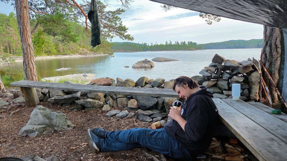 Am schönsten war es aber, einfach in den Tag hineinzuleben. Kein Programm, keine Uhr, keine Verpflichtungen. Stattdessen: Morgens gemeinsam Wasser kochen, lesen, kochen, schnitzen, malen, paddeln, staunen. Abends saßen wir dann mit unseren Heißgetränken auf dem Felsen, haben Sonnenuntergänge geschaut, geredet oder einfach geschwiegen. Es haben sich Routinen entwickelt, die sich sofort richtig angefühlt haben.