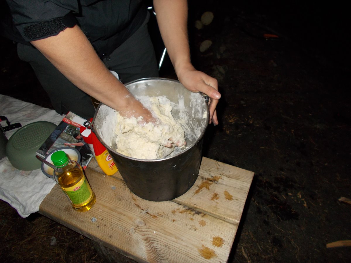 Fragten wir uns anfangs, was man im Wald mit so viel Mehl (10 Kilo) anfängt, mussten wir nun abwägen, wieviel des kläglichen Rests wir für das nächtliche Stockbrot verwenden und wie viel für die morgendlichen Pancakes bleiben soll.