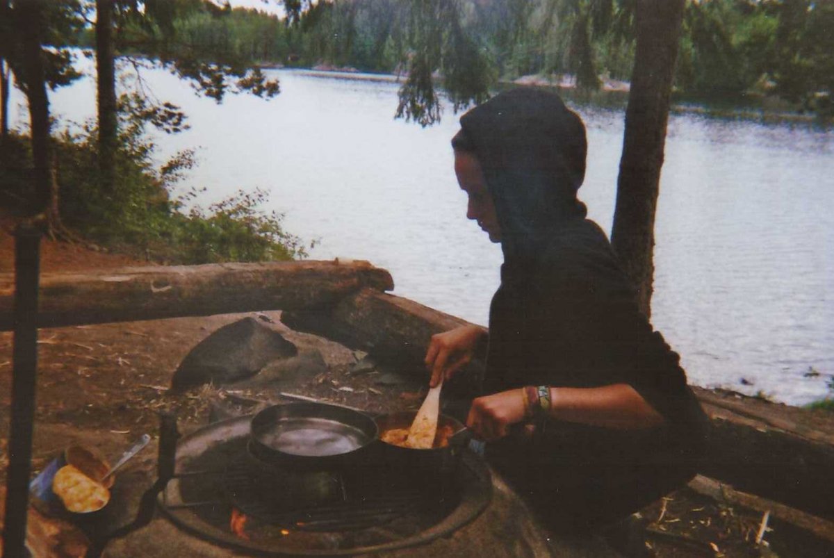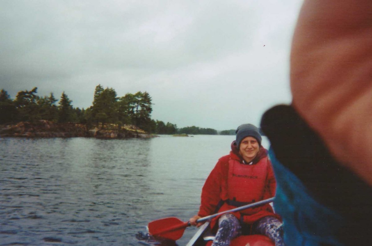Heute wurden wir leider nicht von der Sonne geweckt. Es war bewölkt. Wenigstens konnten wir unser Zelt noch trocken einpacken. Endspurt Richtung Camp. Eine letzte Nacht hatten wir noch vor uns. Unterwegs kamen wir wieder durch kleinere Regenschauer. Und überall war Nebel. Andere Kanufahrer sahen irgendwie aus wie kleine Seemonster. Wir kamen an einen Lagerplatz, zwar nicht der schönste, aber besser als nichts. Denn weiter wollte wir nicht mehr fahren. Wir pflückten Blaubeeren, machten ein Kompott daraus, fanden eine stark belaufenene Ameisenstraße und sahen ein kleines Mäuschen. Zum Glück schafften wir am letzten Abend, trotz feuchtem Holz ein Feuer zu machen. Zeit für Hot-Dogs. Die Sonne meldete sich noch einmal kurz zu Wort und verschwand mit einem orangenen Schein hinter den Baumwipfeln.