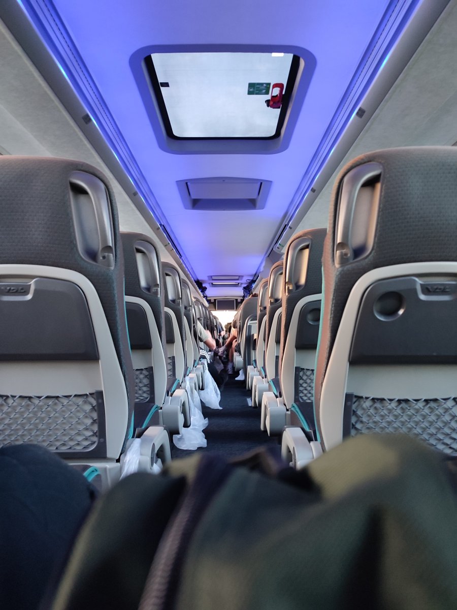 Am Mittag brachen wir voller Tatendrang auf, beladen mit Rucksäcken und einer gehörigen Portion Vorfreude. Da wartete bereits ein komfortabel ausgestatteter Reisebus auf uns. Die Organisation war top-notch, und Jakob sicherte sich seinen Prachtplatz in der Mitte der letzten Busreihe – ein kluger Schachzug, besonders für einen Kerl, der mit stolzen 2,04 Metern in die Höhe ragt. Die restlichen Plätze wurden je nach Buchungsgruppen verteilt, damit alle zusammenhockten.