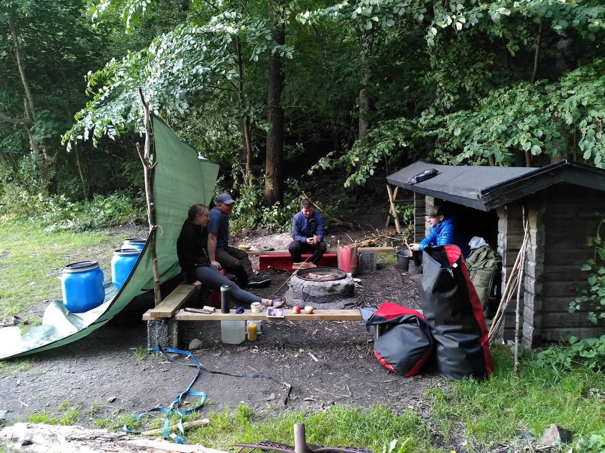 Das Übertragen eine spannende Angelegenheit ist, war die Lektion des heutigen Tages. Erstes Übertragen entpuppte sich als nicht einmal 50m Luftlinie, welche in Sichtweite hinter einer Landstraße lag. Unser heutiges im Gegensatz dazu entpuppte sich als echte Herausforderung. Strecke finden und festlegen, Kanus entladen und aus dem Wasser heben, Kanuwagen unterbauen und transportieren… drei Mal (Daumen drücken das die morgigen drei Stellen mehr der ersten ähneln) Schwedens Seen wurde zum heimischen Baggersee als wir uns nach der Ankunft die Sonne auf den Bauch scheinen ließen. Um zu verhindern dass der Rauch ins Dano zieht entwarfen wir einen Schutz gegen den Wind. Der Rauch zog nun zwar nicht mehr in die Richtung des Holz-verschlages, wirbelte sich aber nun zwischen beiden Seiten hin und her was uns in regelmäßigen Abständen dazu brachte mit der brotzeit in der Hand ein paar Schritte zurück zu treten