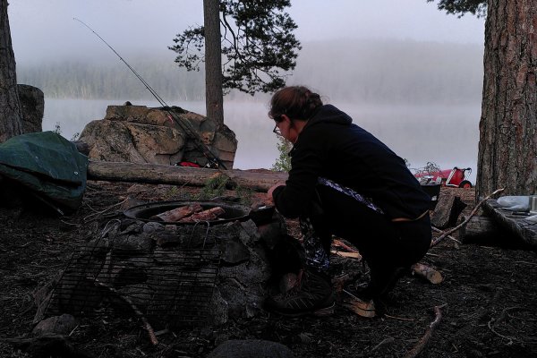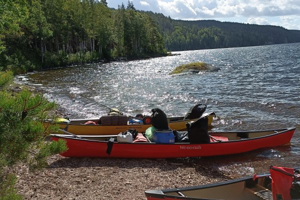 Ein vorbei schleichender Kanu-Kumpane war es der mich heute morgen weckte. Leider kein Elch auf der Suche nach Futter. Auf einer Insel, möglich. Immerhin tauchen Elche auch auf den Grund von Gewässern, um Seegras zu schnabolieren. Zum Frühstück gab es klassisch Müsli mit Milch aus Milchpulver. Wir packten und verstauten alles sicher in Kanus und brachen auf. Unser Ziel, Dano Nr. 60 oder 61. Zum Glück von Nina und mir fanden wir in den ersten Kilometern heraus wie wir am effizientesten paddeln und steuern. Die Plagerei vom Vortag hatte ein Ende. Wir überholten sogar unsere Rudermaschine Lisa. Heidelbeeren sorgten dafür das selbst der Regen Nina's Tag nicht trüben konnte - morgen zum Frühstück gibt es Pfannkuchen mit Blaubeeren… Eine freche Ente versüßte uns unser Mittagessen. Rechzeitig vor Regen Einbruch hatten wir das Lager aufgebaut und ließen den Tag über Spagetti mit Tomatensoße á la Nina ausklingen.