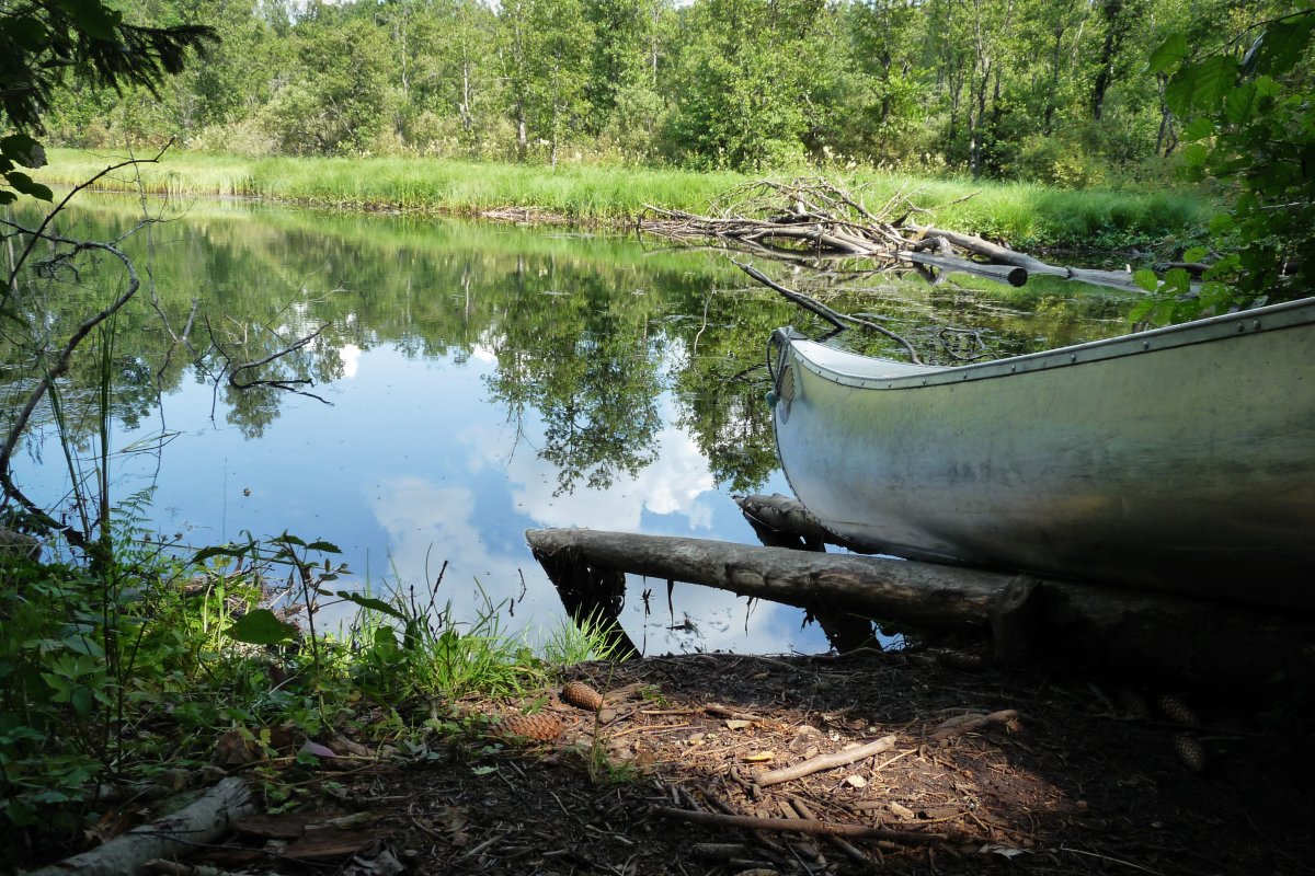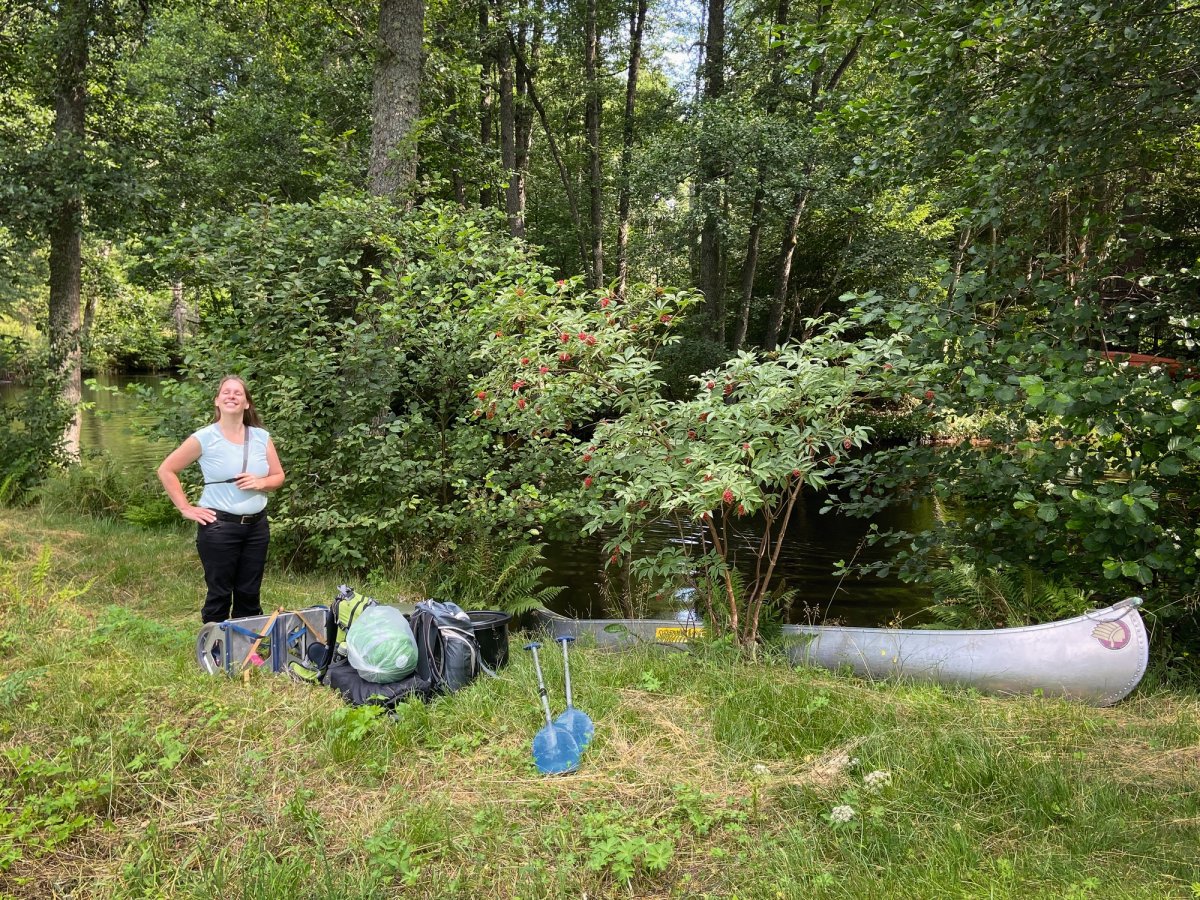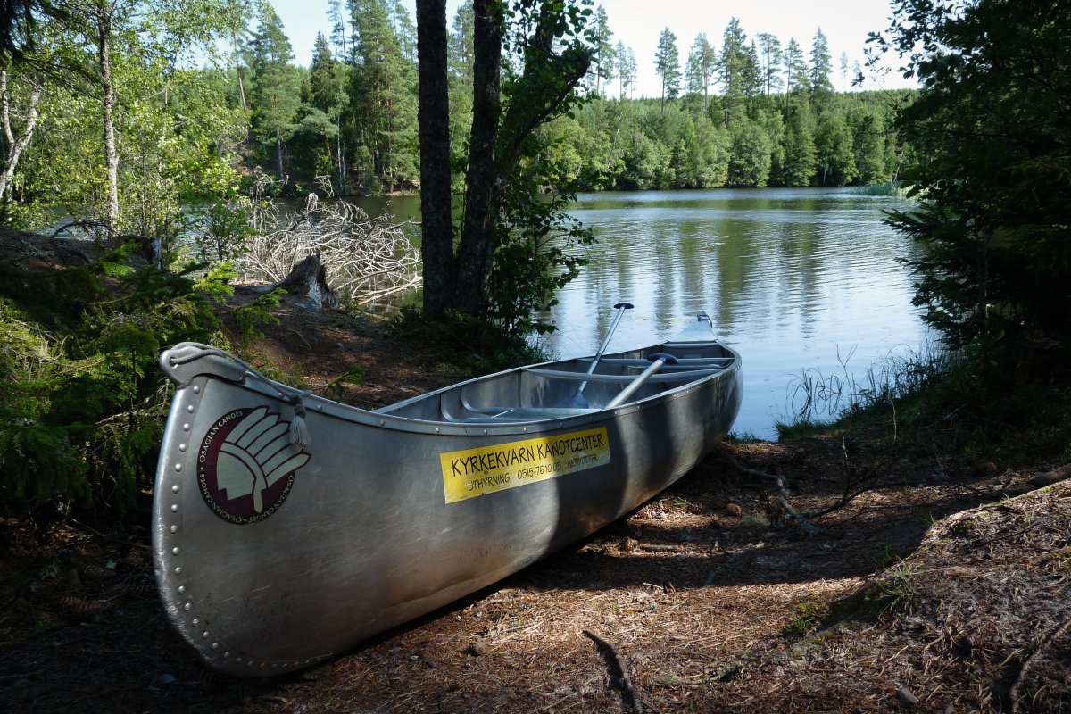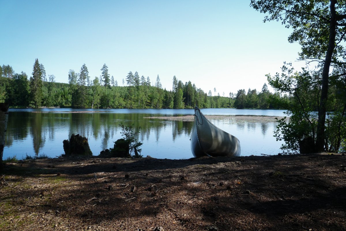 Nachdem wir uns nun einige Tage mit Kanu, Fluss und Umgebung vertraut gemacht haben soll es auf eine größere Tour mit mehreren Umtragen und Übernachtung am See Gimmesjön gehen. Wir holen das Equipment für Mehrtagetouren an der Rezeption ab (Spaten, Transportboxen und Bootswagen) und das Abenteuer kann beginnen. Nach dem Beladen des Kanus geht es dann auch schon los.