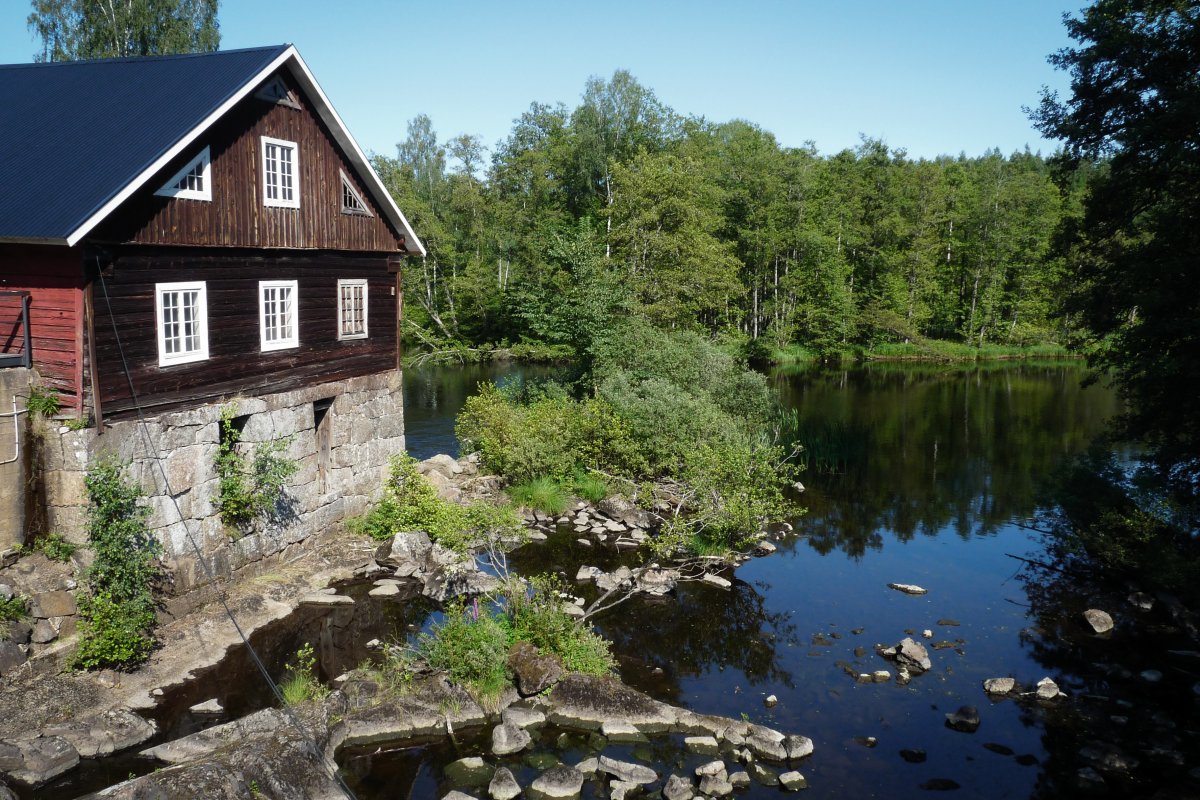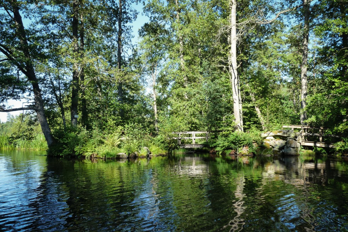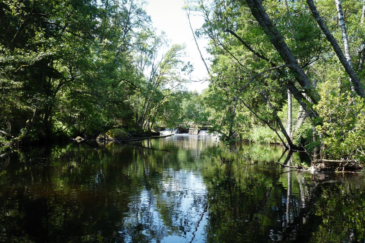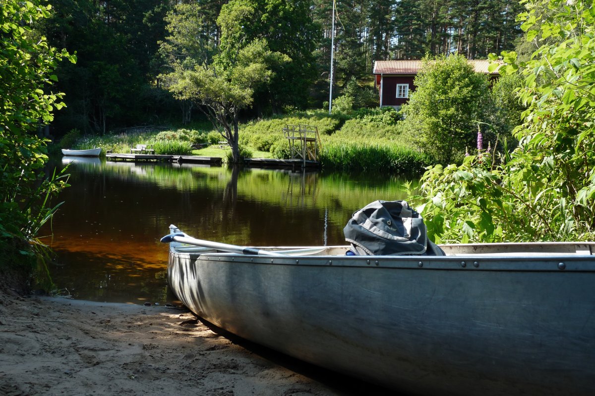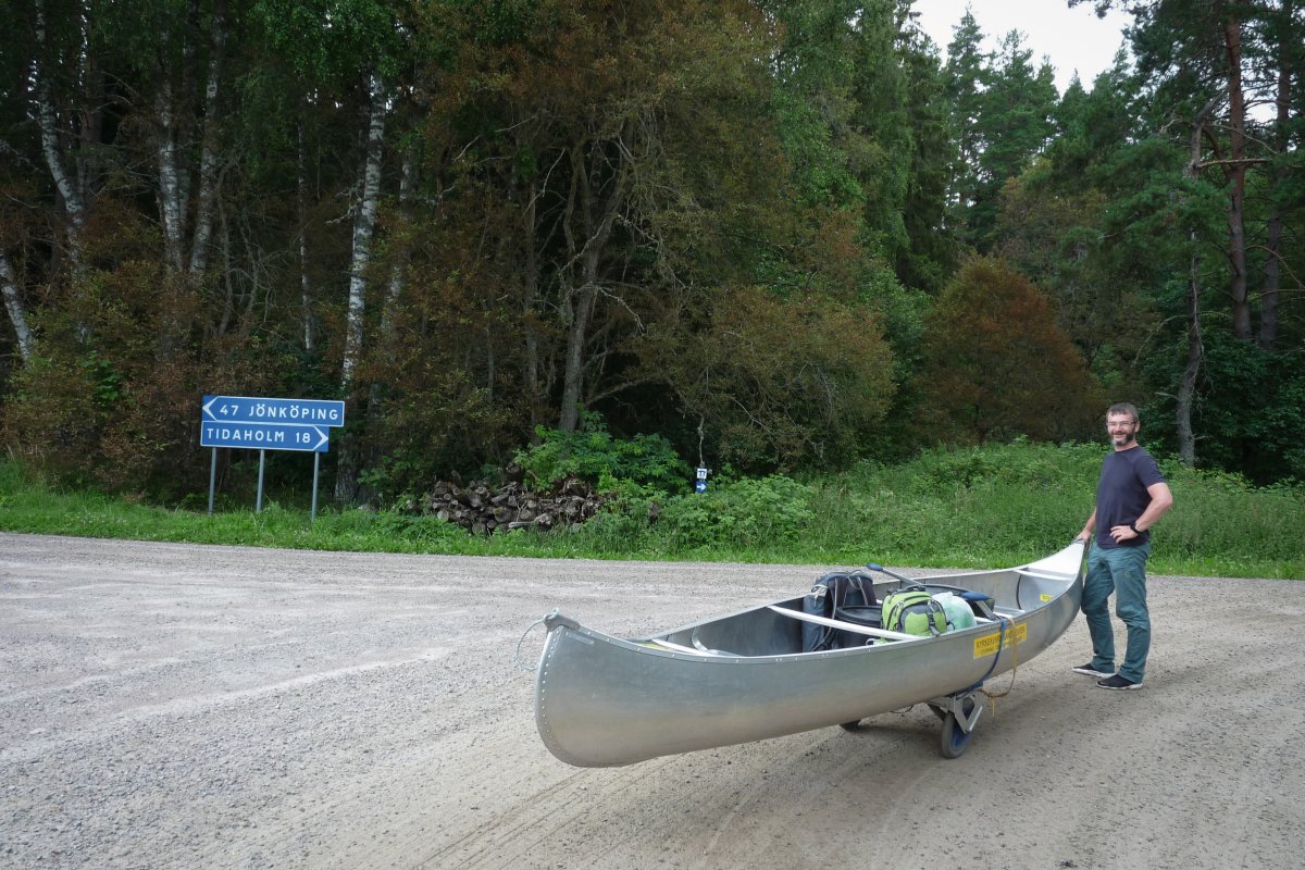 Bei Kaiserwetter startet unsere Tour durch schon bekannte Gefilde mit viel Neugier auf die bislang unbekannten Gegenden des Tidan. Das erste Umtragen an der ehemaligen Mühle – bis dahin waren wir schon gekommen - war dank Bootswagen einfacher als es das vollbepackte Kanu erwarten ließ und von nun an heißt es neue Traumlandschaften erkunden.