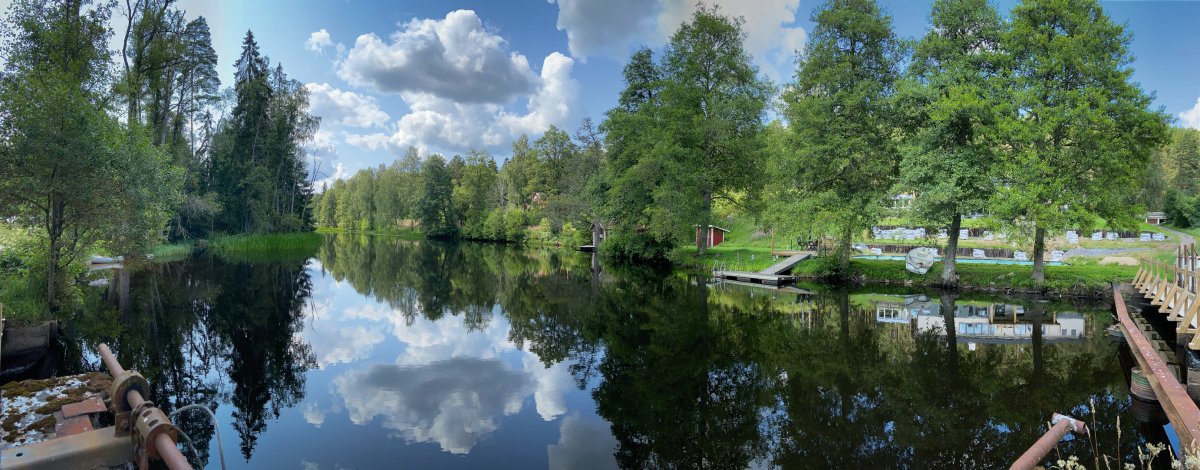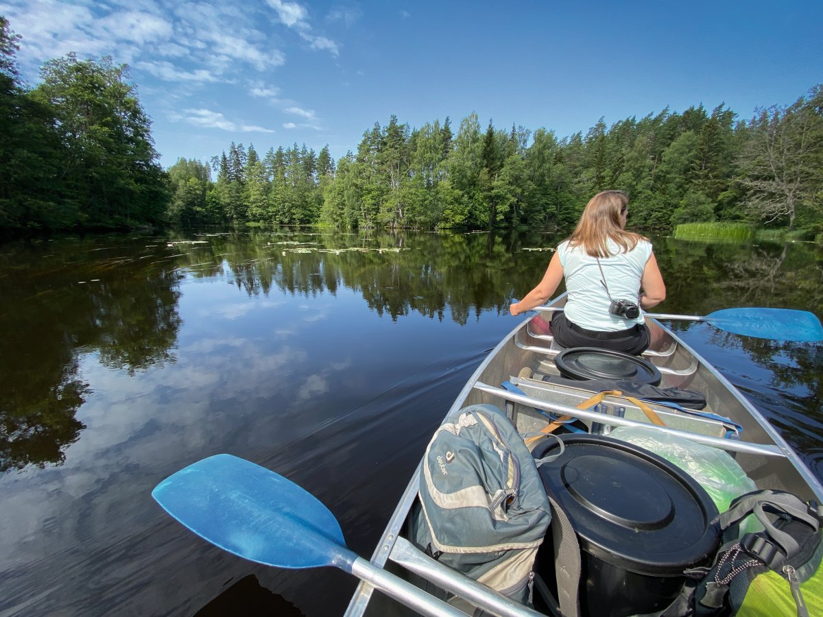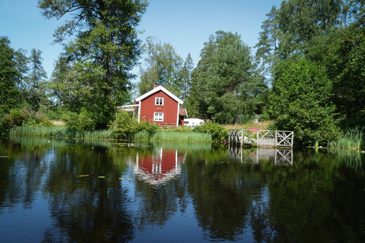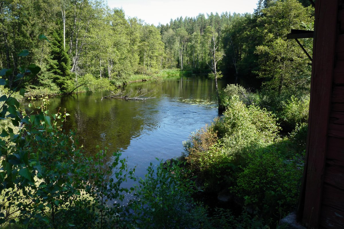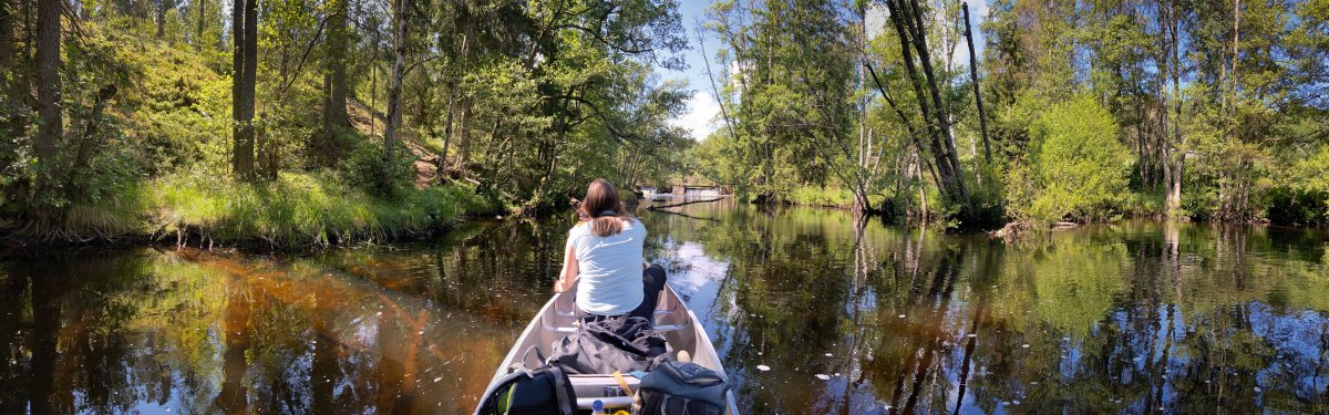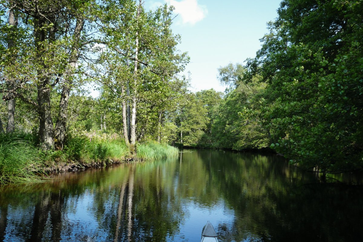 Bei Kaiserwetter startet unsere Tour durch schon bekannte Gefilde mit viel Neugier auf die bislang unbekannten Gegenden des Tidan. Das erste Umtragen an der ehemaligen Mühle – bis dahin waren wir schon gekommen - war dank Bootswagen einfacher als es das vollbepackte Kanu erwarten ließ und von nun an heißt es neue Traumlandschaften erkunden.