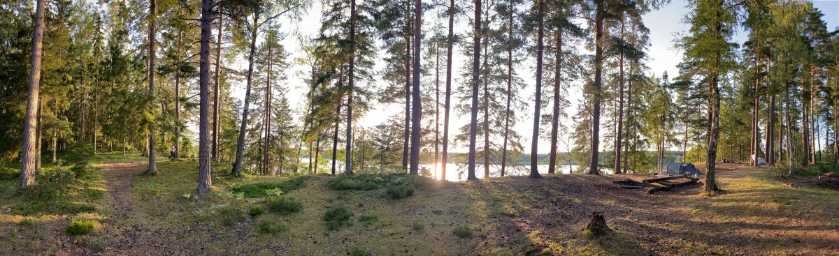 Unmittelbar an der Spitze der Landzunge finden wir die wunderschöne Übernachtungsstelle auf einer Anhöhe im lichten Wald mit einem grandiosen Blick auf den See – Urlaub pur!