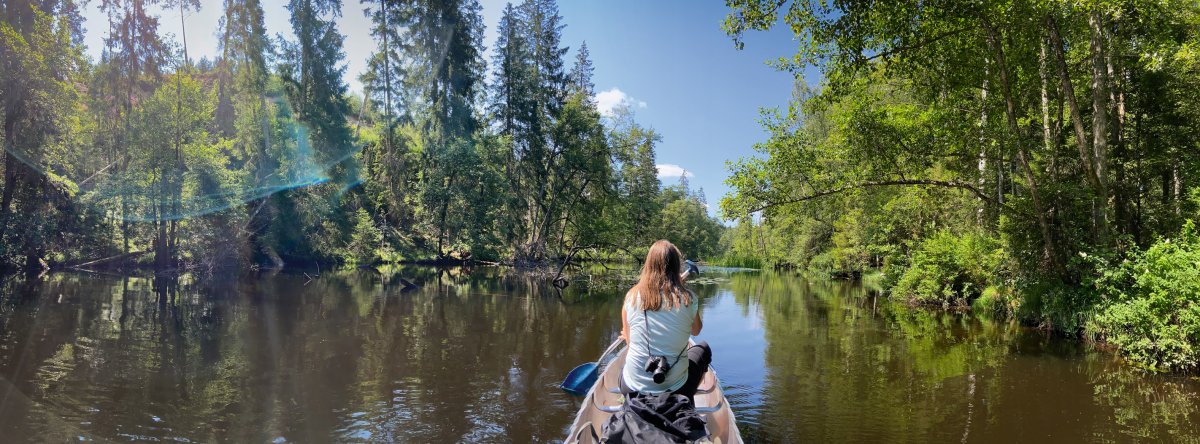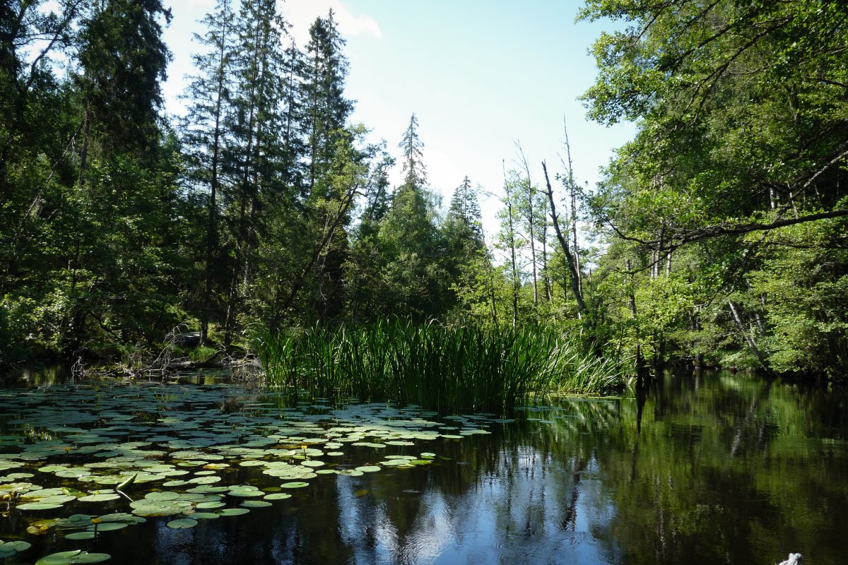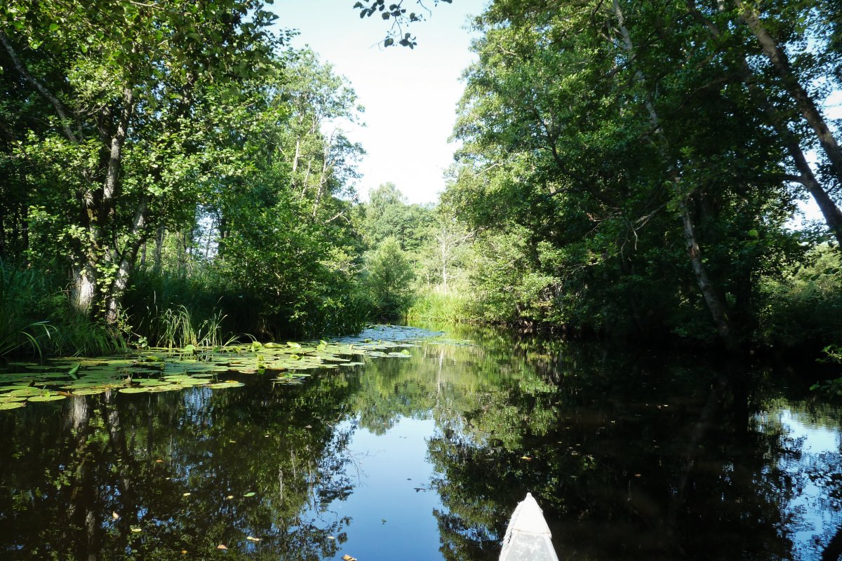 Im weiteren Verlauf mäandert der Tidan durch weitläufige Schilflandschaften. Diese werden in einigen Abschnitten von großen Seerosenteppichen durchbrochen. In anderen Abschnitten wird der Fluss deutlich schmaler und jede Menge Totholz auf und unter dem Wasser macht das Durchqueren anspruchsvoller. (Keine Angst vorm Steckenbleiben – mit etwas ruckeln, schieben und drücken kommt ihr wieder frei ;)) Unsere lautlose Fahrt wird von Enten, Vögeln, Schlangen und farbenfrohe Libellen begleitet – herrlich...