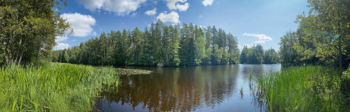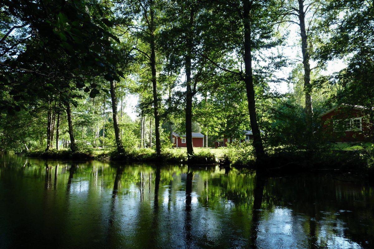 An einer wunderschönen Mühle nehmen wir das Boot erneut aus dem Wasser und machen uns auf den 800 Meter langen Weg. Auf der Straße entlang, vorbei an Himbeerfeldern und anderen Mühlen geht es zur Einsetzstelle, die von übermannshohem Rhabarber gesäumt ist. Unmittelbar nach dem Einsetzen ist die Strömung recht stark und das Manövrieren anspruchsvoll. Das kurze Teilstück ist jedoch schnell passiert und der Tidan präsentiert sich wieder von seiner wildromantischen Seite. Nach einiger Zeit weichen die Schilfgürtel zurück und der See Gimmesjön, unser heutiges Ziel, präsentiert sich in seiner Weite mit glasklarem Wasser.