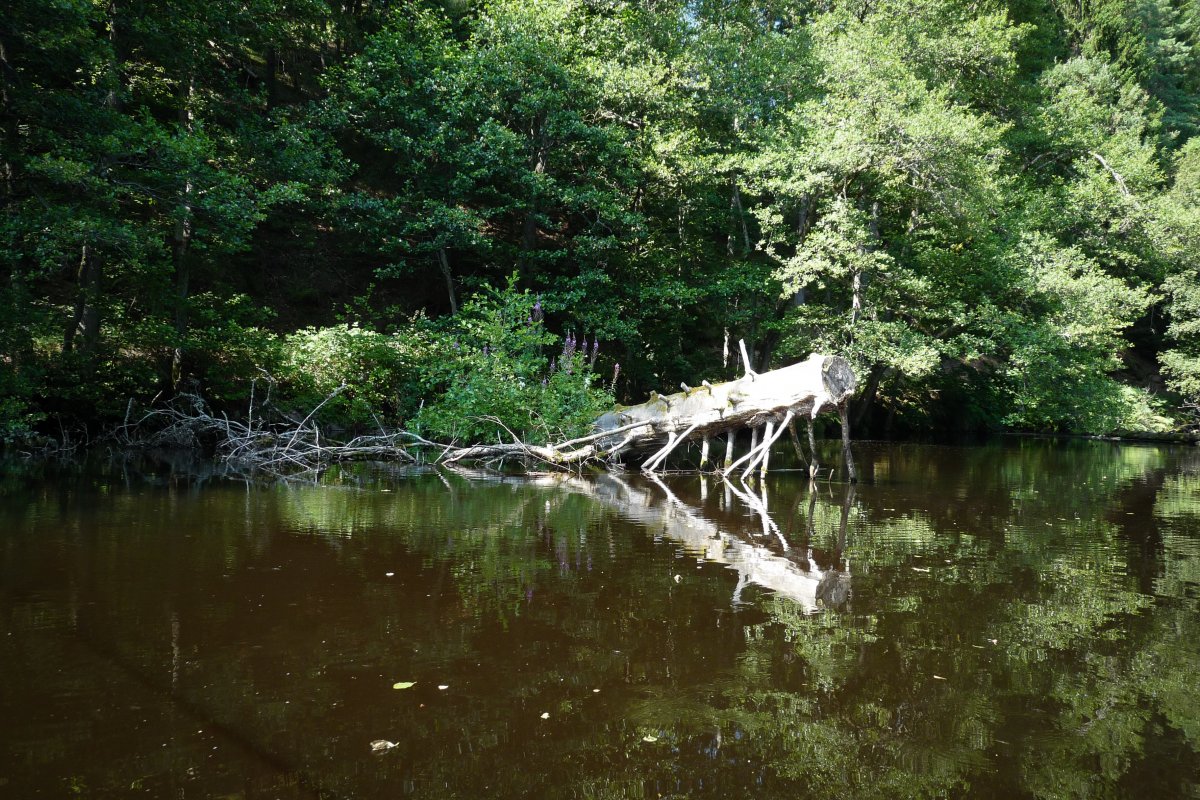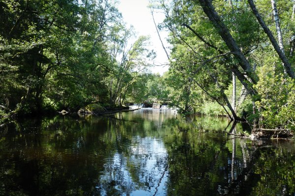 Anschließend starteten wir unsere erste Kanufahrt auf dem nördlichen Flussabschnitt bis zur ersten Umtragestelle an einem malerischen Wehr einer ehemaligen Mühle. Da wir beide noch wenig Erfahrung mit ausgedehnten Kanutouren und Umtragen hatten, wollten wir uns erst einmal einen Eindruck vom Fluss und den Umtragestellen verschaffen und etwas mehr Erfahrung mit dem Boot sammeln, bevor es auf größere Touren gehen sollte. Die Besichtigung der Umtragestelle beruhigte uns. Fluss und Umtragestellen schienen auch für Anfänger gut geeignet zu sein.
