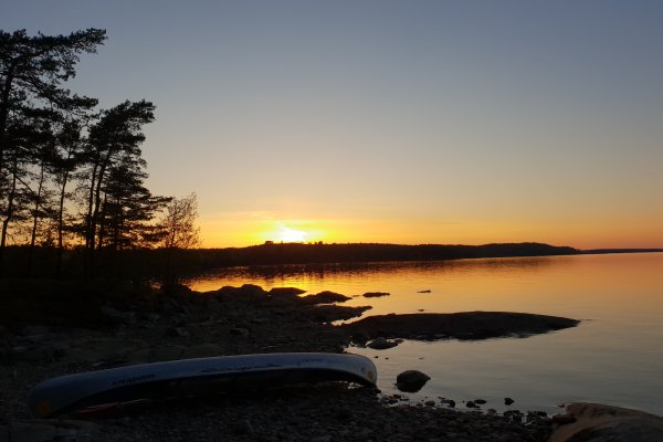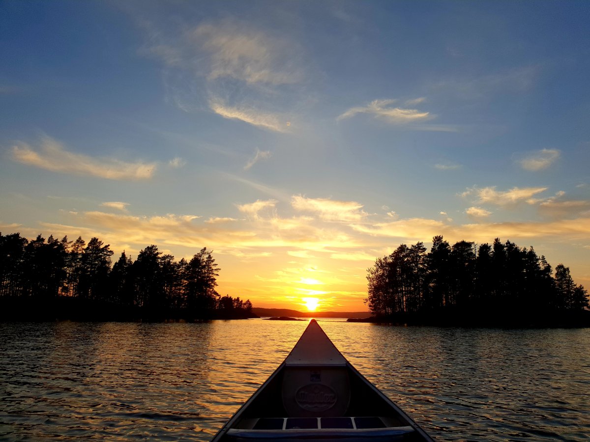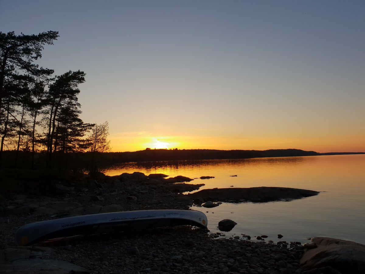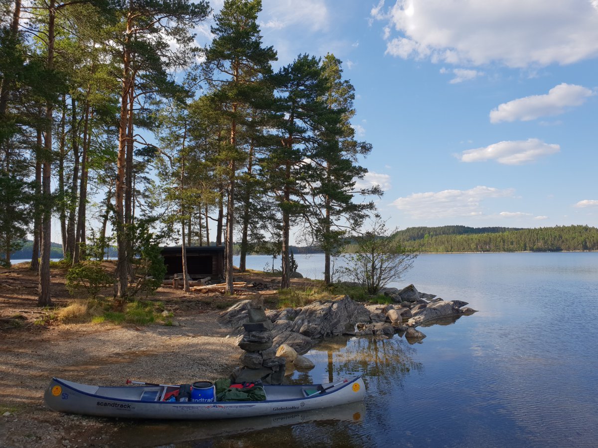 Nach einer langen und anstrengenden Anreise von Nürnberg über Leipzig, weiter mit dem Bus nach Berlin, Hamburg und weiter mit der Fähre über Dänemark nach Lennartsfors kamen wir mit etwas Verspätung im Basiscamp an. Nach einer netten und freundlichen Begrüßung gab es zur Stärkung einen Hotdog und Tee. Danach machten wir uns durch ein kleines Waldstück auf, um unsere Ausrüstung in Empfang zu nehmen. Nachdem wir alles beisammen hatten, ging es noch einige Meter runter zum See, an dem auch unser Kanu schon bereit stand. Wir beluden unser Kanu, legten die Schwimmwesten an und paddelten los. Wir steuerten an diesem Tag das Dano 17 an, da wir von der langen Reise doch sehr geschafft waren. Angekommen am Dano 17 ging es ans Ausräumen des Kanus und die Vorbereitung für den Abend und die Nacht. Wir holten etwas Holz, machten uns gleich ein gemütliches Feuer und aßen Brot mit Wurst und aufgeschnittenen Tomaten. Nach einem sehr erfrischendem Bad im See (arschkalt) ließen wir den Abend noch am offenen Feuer ausklingen und kuschelten uns in unsere Schlafsäcke, weil es in den Nächten im Mai doch noch etwas kalt ist.