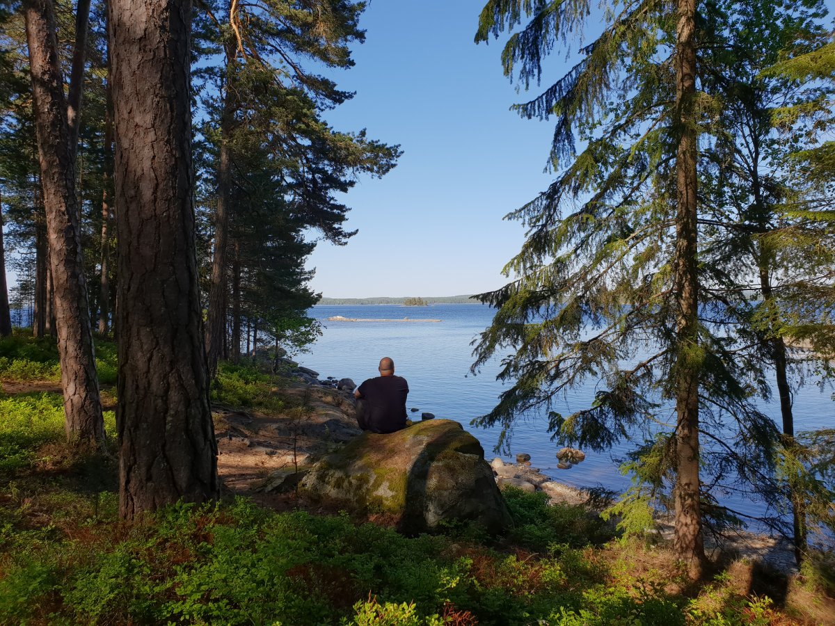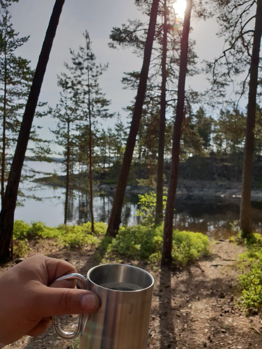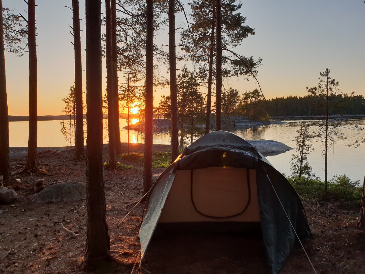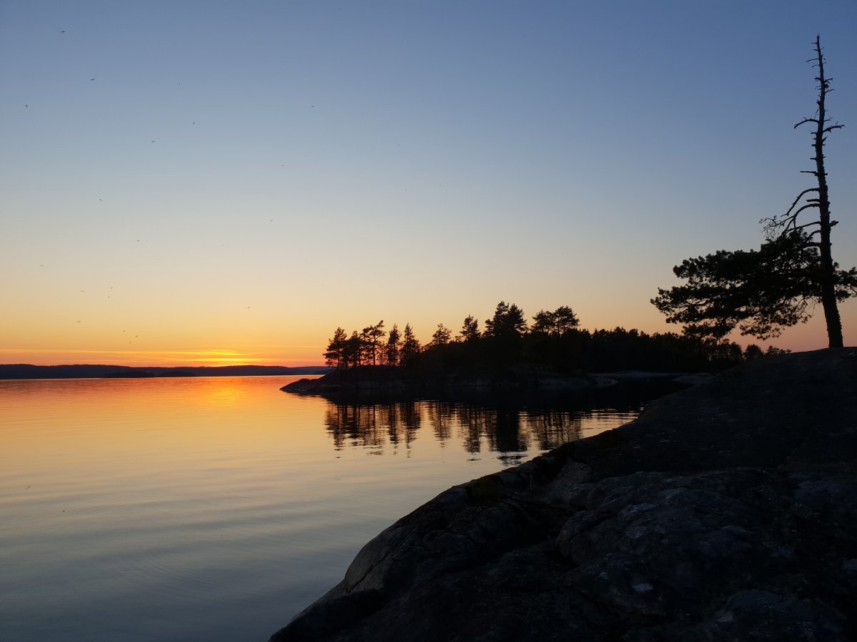Nach einer langen und anstrengenden Anreise von Nürnberg über Leipzig, weiter mit dem Bus nach Berlin, Hamburg und weiter mit der Fähre über Dänemark nach Lennartsfors kamen wir mit etwas Verspätung im Basiscamp an. Nach einer netten und freundlichen Begrüßung gab es zur Stärkung einen Hotdog und Tee. Danach machten wir uns durch ein kleines Waldstück auf, um unsere Ausrüstung in Empfang zu nehmen. Nachdem wir alles beisammen hatten, ging es noch einige Meter runter zum See, an dem auch unser Kanu schon bereit stand. Wir beluden unser Kanu, legten die Schwimmwesten an und paddelten los. Wir steuerten an diesem Tag das Dano 17 an, da wir von der langen Reise doch sehr geschafft waren. Angekommen am Dano 17 ging es ans Ausräumen des Kanus und die Vorbereitung für den Abend und die Nacht. Wir holten etwas Holz, machten uns gleich ein gemütliches Feuer und aßen Brot mit Wurst und aufgeschnittenen Tomaten. Nach einem sehr erfrischendem Bad im See (arschkalt) ließen wir den Abend noch am offenen Feuer ausklingen und kuschelten uns in unsere Schlafsäcke, weil es in den Nächten im Mai doch noch etwas kalt ist.