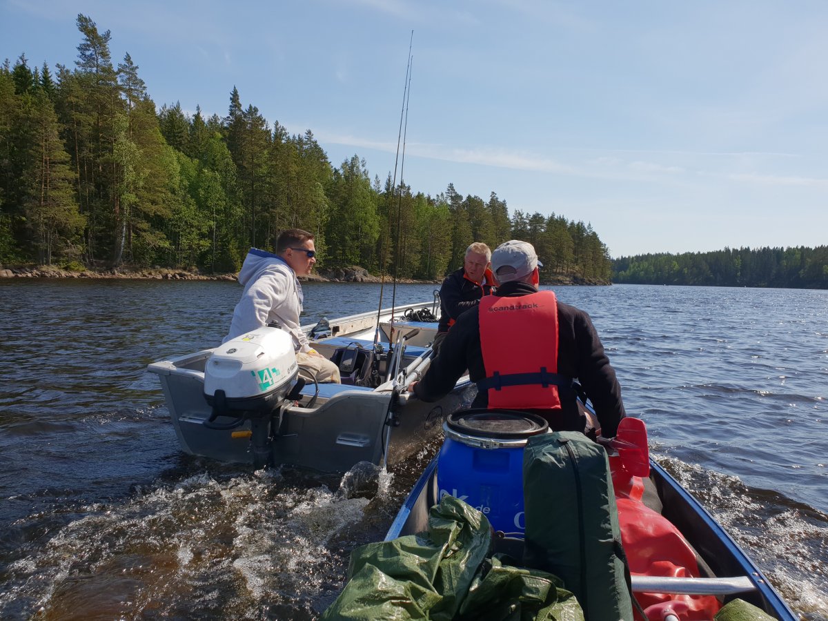 Um 7 Uhr wachten wir mit strahlendem Sonnenschein auf und machten uns daran, Kaffee zu kochen und ein Brot zu essen. Wir setzten uns gemütlich ans Ufer, tranken unseren Kaffee und stärkten uns für den kommenden Tag. Mein Kollege Chris starte an diesem Tag im Axelshirt und kurzer Hose, was er am Abend dann bereute. Da die Sonne im Mai schon sehr stark war, holte er sich einen extremen Sonnenbrand, der ihn natürlich noch ein paar Tage begleitete. Nachdem wir unser Kanu beladen hatten, machten wir uns auf vom Dano 17 quer über den See, einen Nebenarm hoch Richtung Grönnäs.