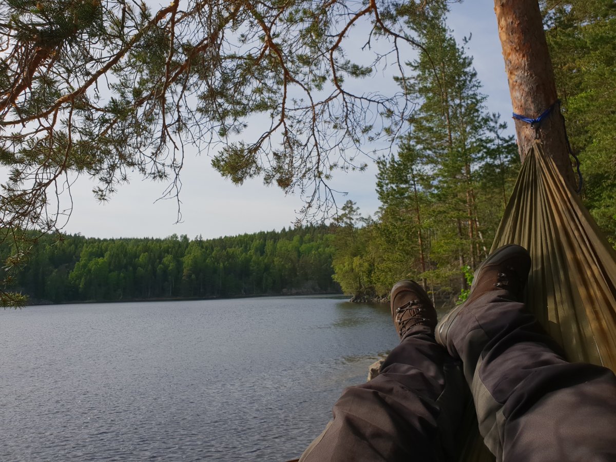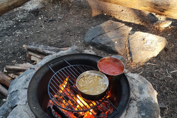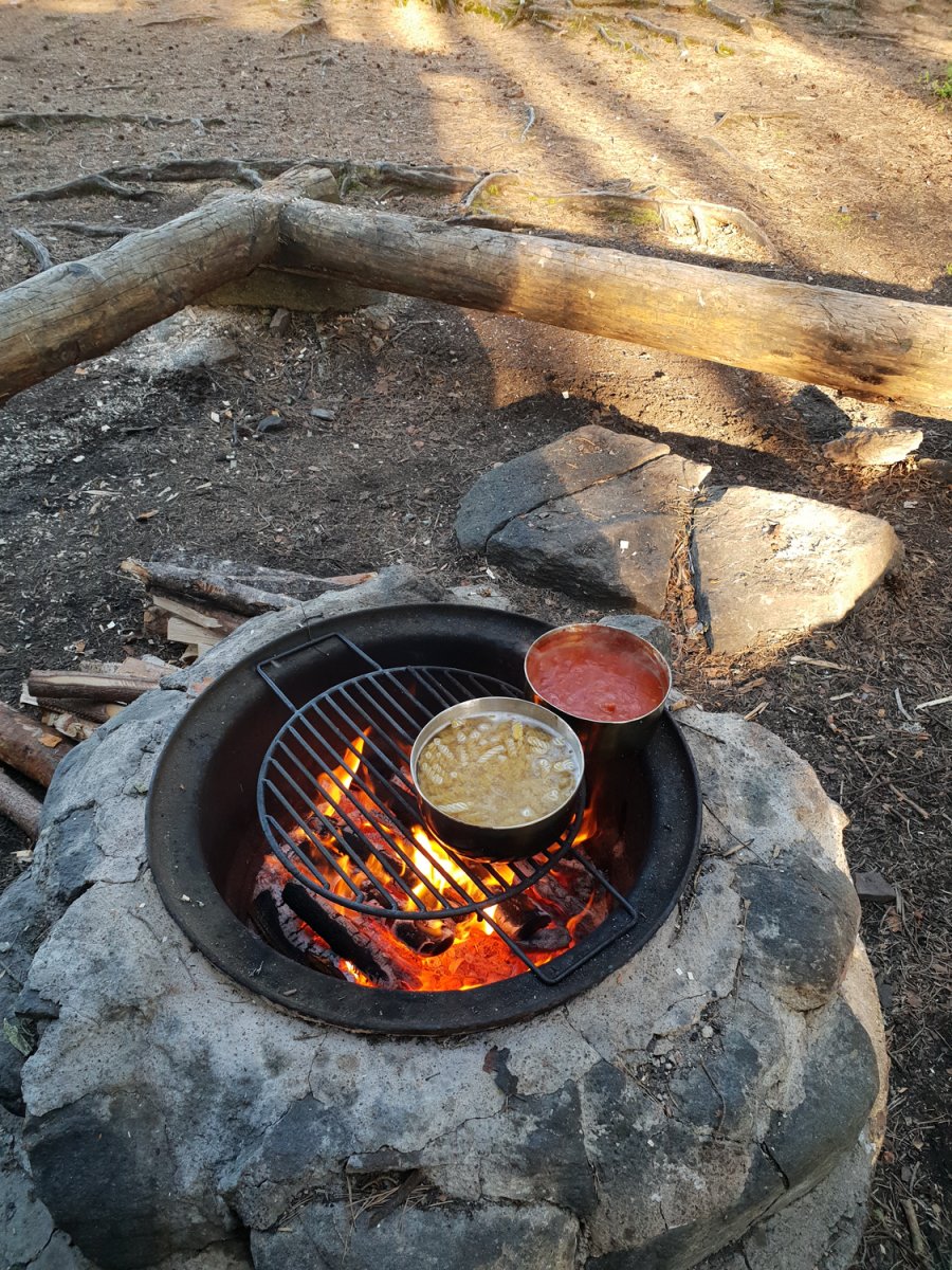 Als wir wieder am Kanu waren, machten wir uns etwas frisch und paddelten los in Richtung Dano 10. Nachdem wir an der Insel angelegt hatten, ging es wieder um Lagerbau, Holz machen und Essen kochen. Heute gab es leckere Linsensuppe frisch vom Feuer. Nach dem Essen genossen wir noch die Landschaft und das tolle Wetter und die Ruhe in der Hängematte. Nach einem erfrischenen Bad im See zogen wir uns in unsere Schlafsäcke zurück. Gute Nacht!