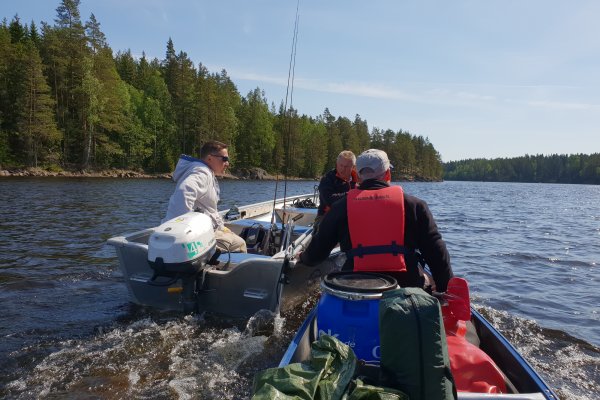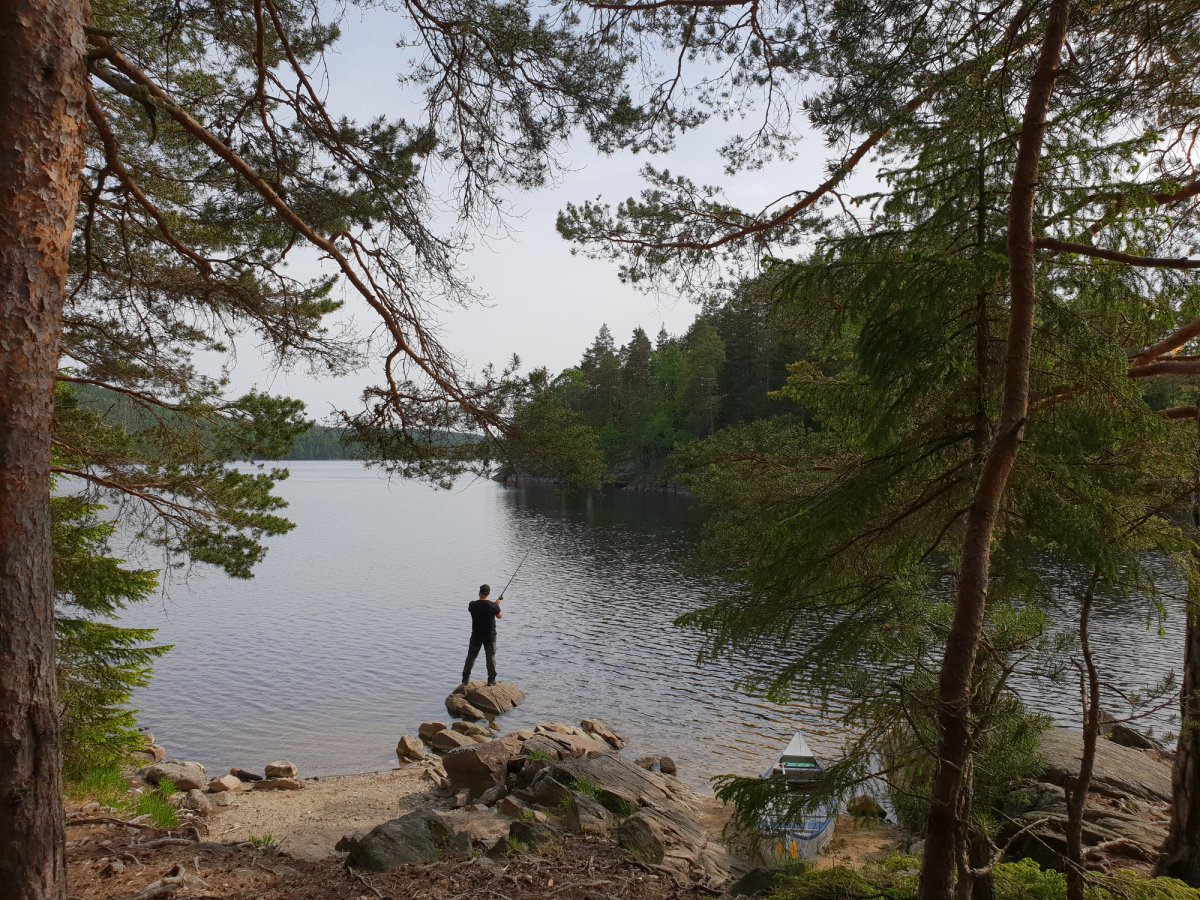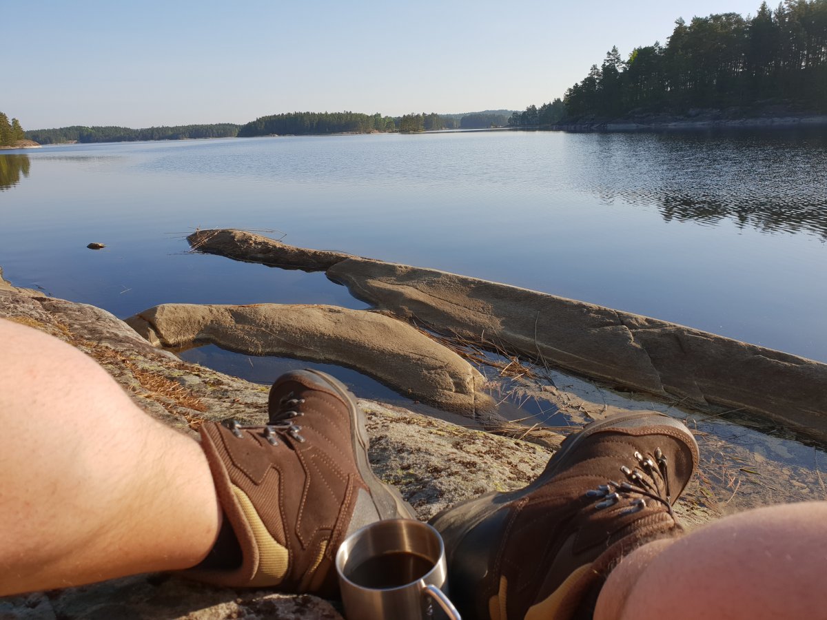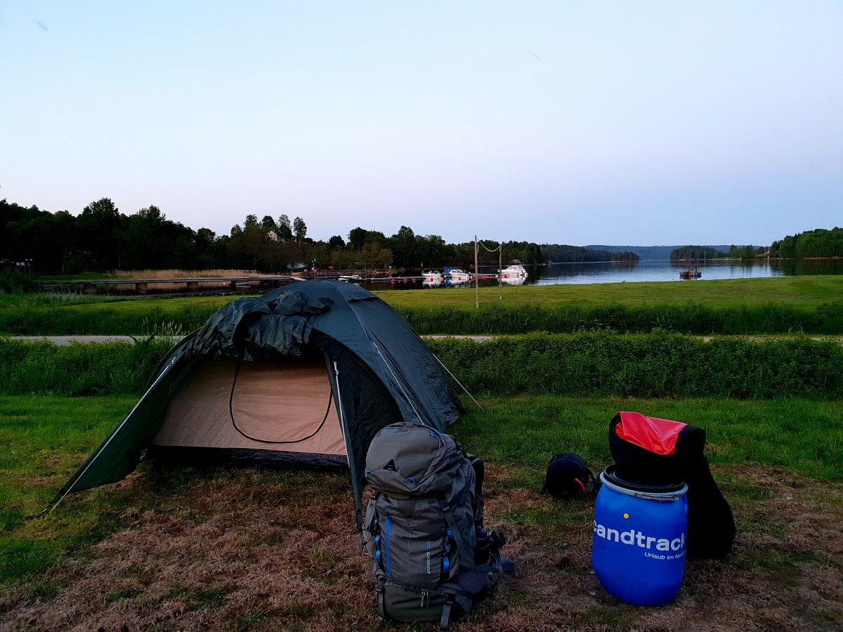 Der Morgen begann mit einen Kaffee und einer Scheibe Brot mit Nutella, einfach perfekt so am Wasser in der Natur. Wir beschlossen diesen letzten Tag hier zu verbringen und unsere persönlichen Sachen im Rucksack zu sortieren. Außerdem reinigten wir auch schonmal das Kanu und die geliehene Outdoorausrüstung, sodass wir gut vorbereitet für den nächsten Abreisetag waren. Auch in den umliegenden Danos und Zelten, die man am Vorabend so sehen konnte, sind alle geblieben um sich für den Abreisetag vorzubereiten. Man paddelte und angelte noch ein wenig auf dem See und tauschte Erfahrungen, Erlebnisse und verschiedene Routen aus. Die meisten aber hielten sich die Woche über großflächig um Lennartfors mit Angeln und Relaxen auf und schauten auch im Basiscamp vorbei. Daher kam unsere Tour und die Erlebnisse mit dem nettem Fischerboot, dem Kapitän auf der Fähre und Nössemark sehr gut bei den anderen an. Am späteren Nachmittag tauchte dann Robert mit seinen zwei Kumpels am Dano auf, die zu dritt unterwegs waren. Wir lernten uns schon 2-3 Wochen vor der Abreise über Facebook auf eurer Seite kennen und fuhren auch zusammen im Bus, da sie in Berlin zugestiegen sind. Natürlich waren sie bei uns herzlich willkommen und sie zögerten auch keine Sekunde, ihre Zelte bei uns aufzuschlagen. An diesem frühen Abend hatten wir noch jede Menge Spaß mit Baden, netten Gesprächen und gemeinsamen Abendessen. So entwickelte sich eine Freundschaft, die auch nach dem Trip noch anhält. Wir saßen noch bis spät in die Nacht zusammen am See und lachten viel, bis wir dann einer nach dem anderen langsam an der Isomatte horchten =).