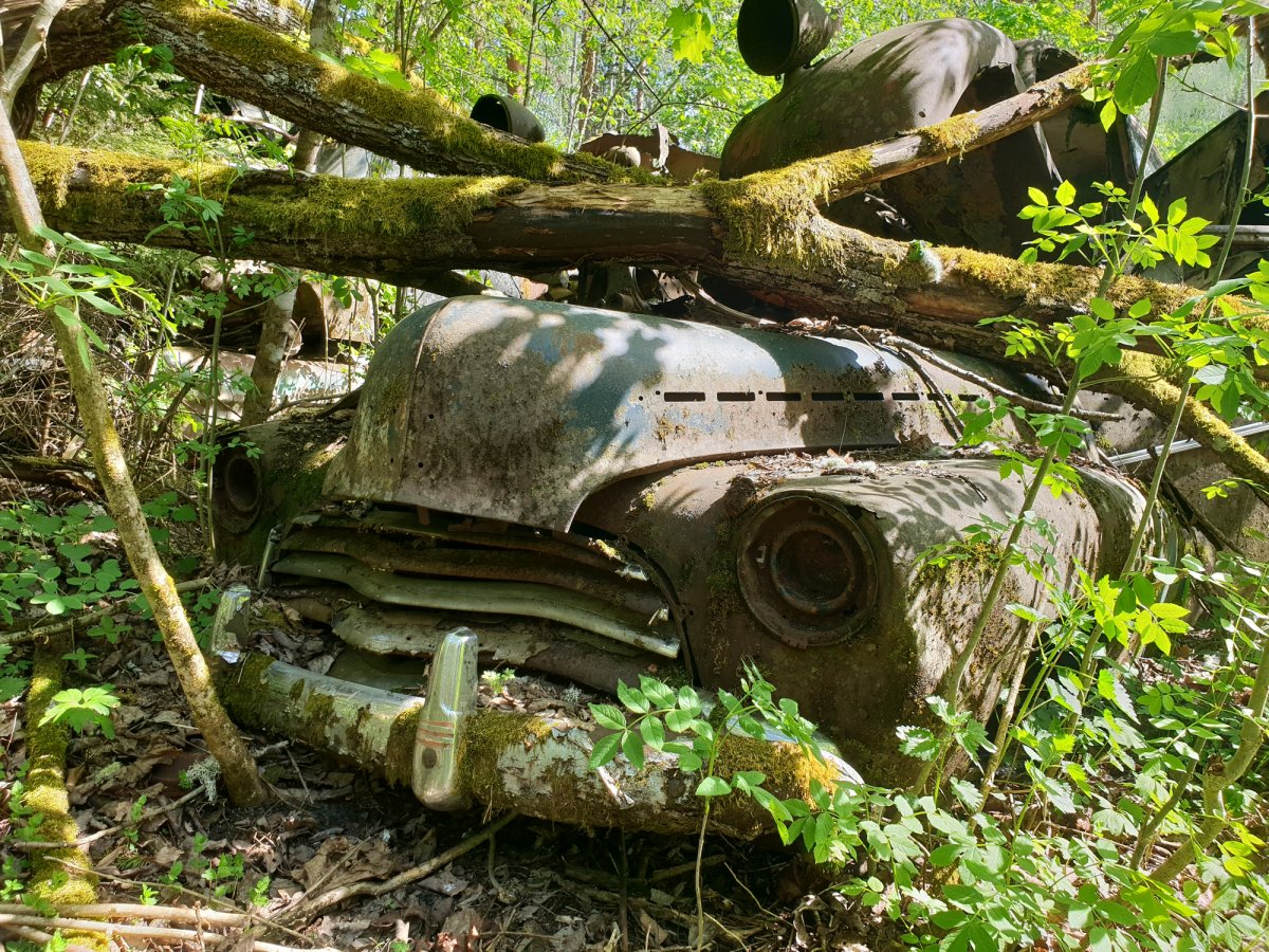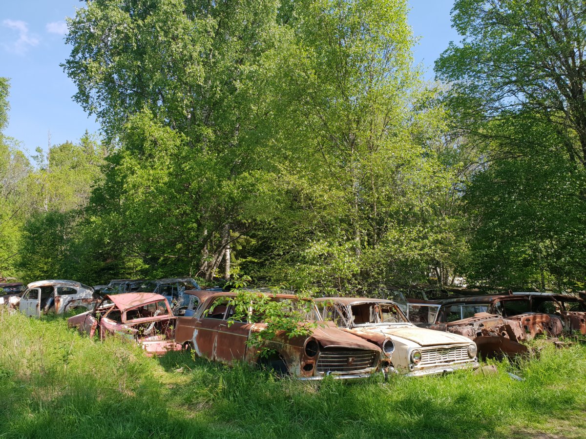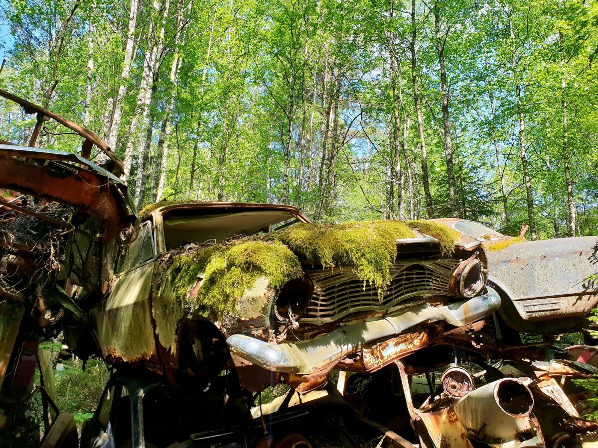 Der dritte Tag begann wie üblich mit einem Kaffee und Brot. Da wir noch einige Ziele auf unserer Reise hatten (Schrottplatz, Trollinsel, Norwegen, Nössemark), machten wir uns einen Plan für die nächsten Tage. Also ging es als Erstes los zum Schrottplatz auf der anderen Seite des Sees. Dort fanden wir einen kleinen Anlegeplatz und machten das Kanu fest. Von da aus ging es einen Schotterweg hinauf in den Wald. Ca. 600 Meter danach erblickten wir schon die ersten Fahrzeuge eingekeilt zwischen den Bäumen. Aufgrund der Vielzahl der Fahrzeuge hörte ich irgendwann auf zu zählen und genoss lieber diesen beeindruckenden Anblick. Also Autoliebhaber stimmte mich der Anblick einiger Modelle jedoch auch traurig. Selbstverständlich konnte ich bei einigen Fahrzeugen nicht widerstehen, einige tolle Fotos zu schießen.