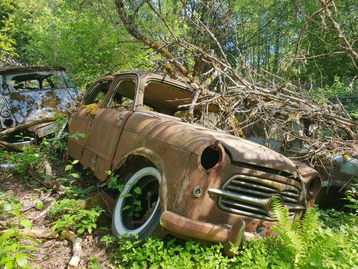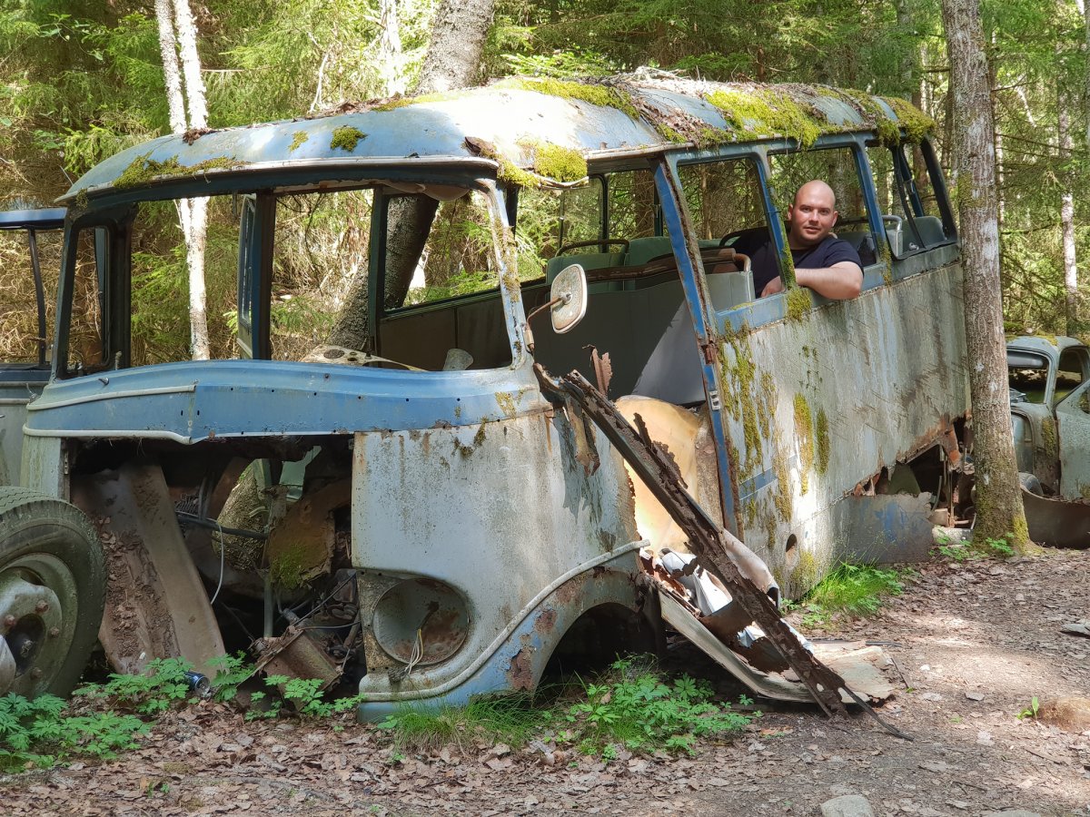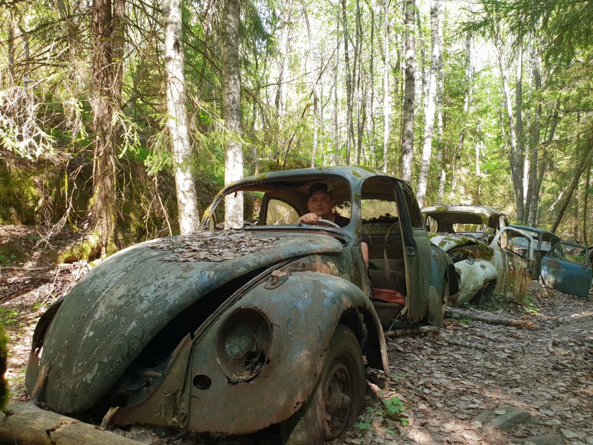 Der dritte Tag begann wie üblich mit einem Kaffee und Brot. Da wir noch einige Ziele auf unserer Reise hatten (Schrottplatz, Trollinsel, Norwegen, Nössemark), machten wir uns einen Plan für die nächsten Tage. Also ging es als Erstes los zum Schrottplatz auf der anderen Seite des Sees. Dort fanden wir einen kleinen Anlegeplatz und machten das Kanu fest. Von da aus ging es einen Schotterweg hinauf in den Wald. Ca. 600 Meter danach erblickten wir schon die ersten Fahrzeuge eingekeilt zwischen den Bäumen. Aufgrund der Vielzahl der Fahrzeuge hörte ich irgendwann auf zu zählen und genoss lieber diesen beeindruckenden Anblick. Also Autoliebhaber stimmte mich der Anblick einiger Modelle jedoch auch traurig. Selbstverständlich konnte ich bei einigen Fahrzeugen nicht widerstehen, einige tolle Fotos zu schießen.