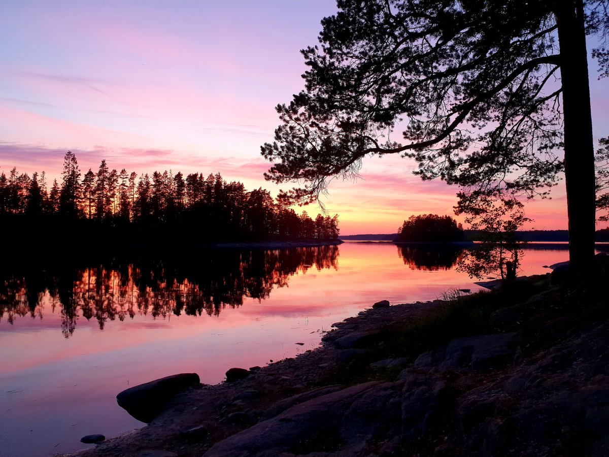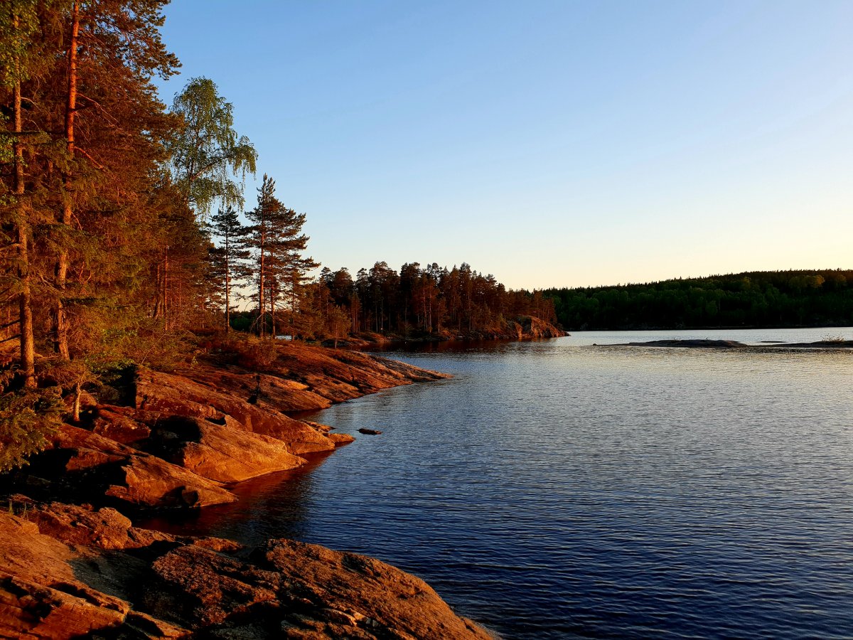 Die Landschaft mit den vereinzelten Häusern ist einfach traumhaft schön. Als wir in Grönnäs ankamen fragten wir uns "Was machen wir jetzt eigentlich?". Also ging es wieder Retour gegen den Strom. Wahnsinn! Aus der Ferne hörte ich ein Motorboot, was immer näher kam. Als es bei uns war, winkte ich Ihnen mit einem Seil vom Kanu aus zu und sie kamen näher. Zu unserem Glück konnten Sie gut englisch - sie nahmen unser Seil und zogen uns mit ihrem kleinen Fischerboot Flussabwärts bis kurz vor Beginn des Sees. Da uns auch immer noch die Anreise vom Vortag in den Knochen lag, beschlossen wir an diesem Tag an Dano 15 zu übernachten. Wir machten wieder Holz, gingen im kalten See baden und schlugen unser Nachtlager auf. Uns kam die Idee, an diesem Tag Nudeln mit Tomatensoße zu machen. Mit einem Teller Nudeln am See sitzen und den Sonnenuntergang genießen - einfach genial! Ich versuchte noch etwas zu angeln, doch leider ohne Erfolg. Also genoss ich den Abend und machte noch ein paar schöne Bilder. Gute Nacht!