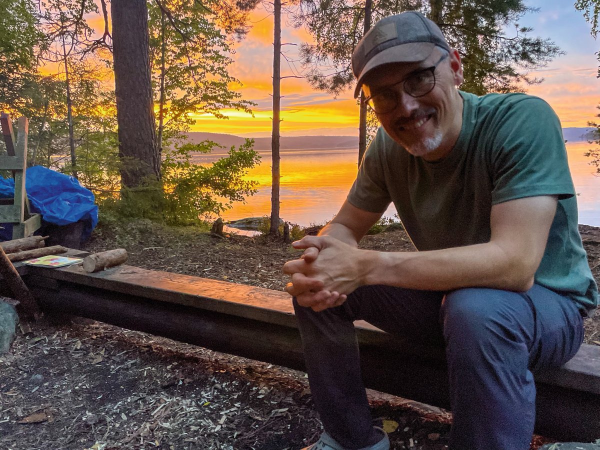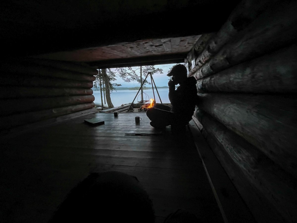 Als wir zurück ins Camp kommen, beginnt Björn ein Feuer zu machen. Nicht so einfach, da das Holz viel zu nass ist. Trotzdem gelingt es ihm ein ansprechendes Feuer zu entfachen. Wie erhofft wird der Platz rund ums Feuer zum Treffpunkt. Wir erzählen, uns was wir in der vergangenen Woche erlebt haben. Es wird ein sehr schöner Schlussabend in angenehmer Gesellschaft.