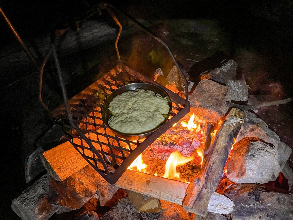 Gegen Abend wagt sich Björn an das Projekt „Brot auf dem Feuer backen“. Für den ersten Versuch klappt es ganz gut. Geschmacklich ist das Brot sehr gut, das Erscheinungsbild hat noch Verbesserungspotential.