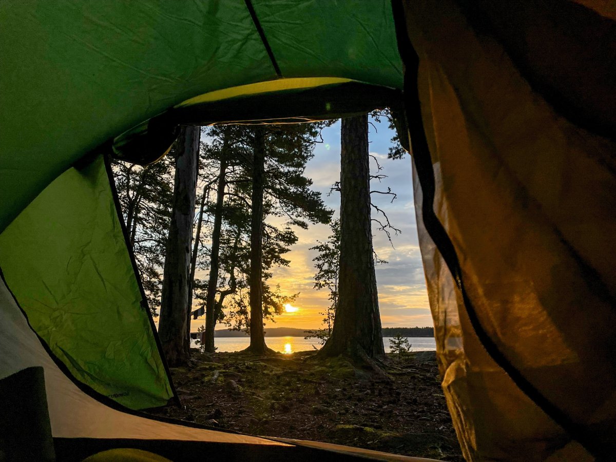 Um 13:45 geht unsere Kanutour im Stora Gla weiter. Kaum auf dem See wechselt das Wetter und es wird windig und regnerisch. Der Regen ist nie Stark und kaum haben wir ihn richtig wahrgenommen ist es schon wieder vorbei. So nehmen wir die Regentropfen kurz vor unserem vorgesehenen Rastplatz nicht wirklich ernst und werden von heftigem Regen total überrascht. Völlig durchnässt kommen wir, um 16:30 Uhr beim Rastplatz 14 an. Es ist jedoch schon eine Gruppe da. Sie sagen uns auch gleich, dass sie noch weitere Leute erwarten und ca. 6 weitere Zelte aufstellen werden. Der Rastplatz ist auf einem Felsen etwas erhöht angelegt. Der Platz ist sehr gross. So entscheiden wir uns unser Zelt etwas abseits der Feuerstelle aufzustellen. Noch immer regnet es sehr stark. Björn hat die Idee zuerst eine Blache zu spannen. So können wir das Zelt vom Regen geschützt aufstellen. Björn spannt noch zwei Wäscheleinen unter der Blache damit wir unsere tropfnassen Kleider zum trocken aufhängen können. Das Zelt richten wir mit Blick auf den See aus und haben einen super Ausblick. Wir verbringen den Abend im Zelt. Essen den Reissalat, den wir am Mittag wegen der Rast im Café Carl noch nicht gegessen haben und zum Dessert gibt es noch himmlisch feine Schokoladen Muffins mit Beeren aus dem Café Carl. Ich freue mich aufs Lesen im gemütlichen Zelt. Doch schon bald sind wir beide müde uns schlafen ein. Da wir eine solch frühe Nachtruhe nicht gewohnt sind erwachen wir beide um 00:30 Uhr wieder. Björn kontrolliert, ob die Blache noch gut gespannt ist, das Wasser sauber abläuft und auch die Wäsche noch gut befestigt ist. Denn es regnet noch immer stark. Alles ist noch in bester Ordnung. Nach ein paar Runden „Wer bin ich“ schlafen wir wieder ein.