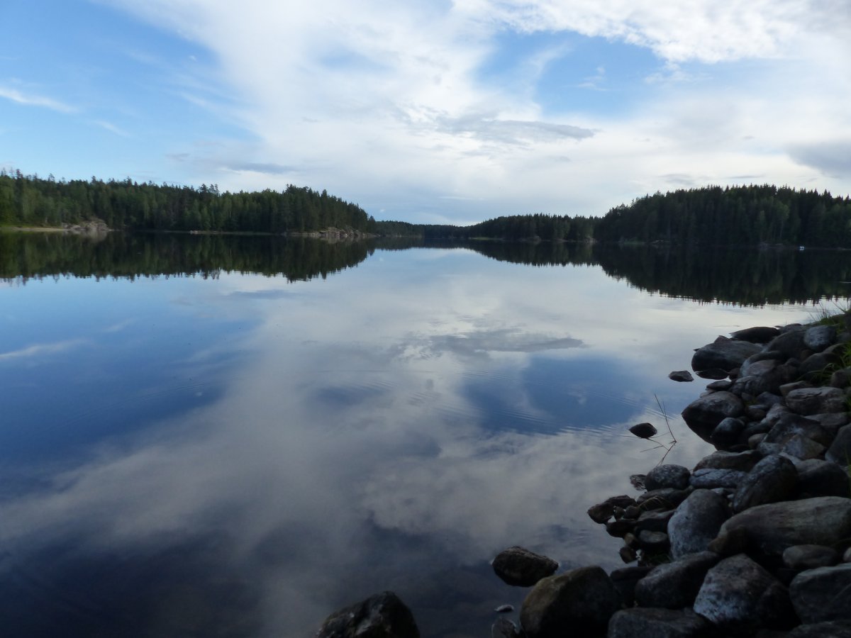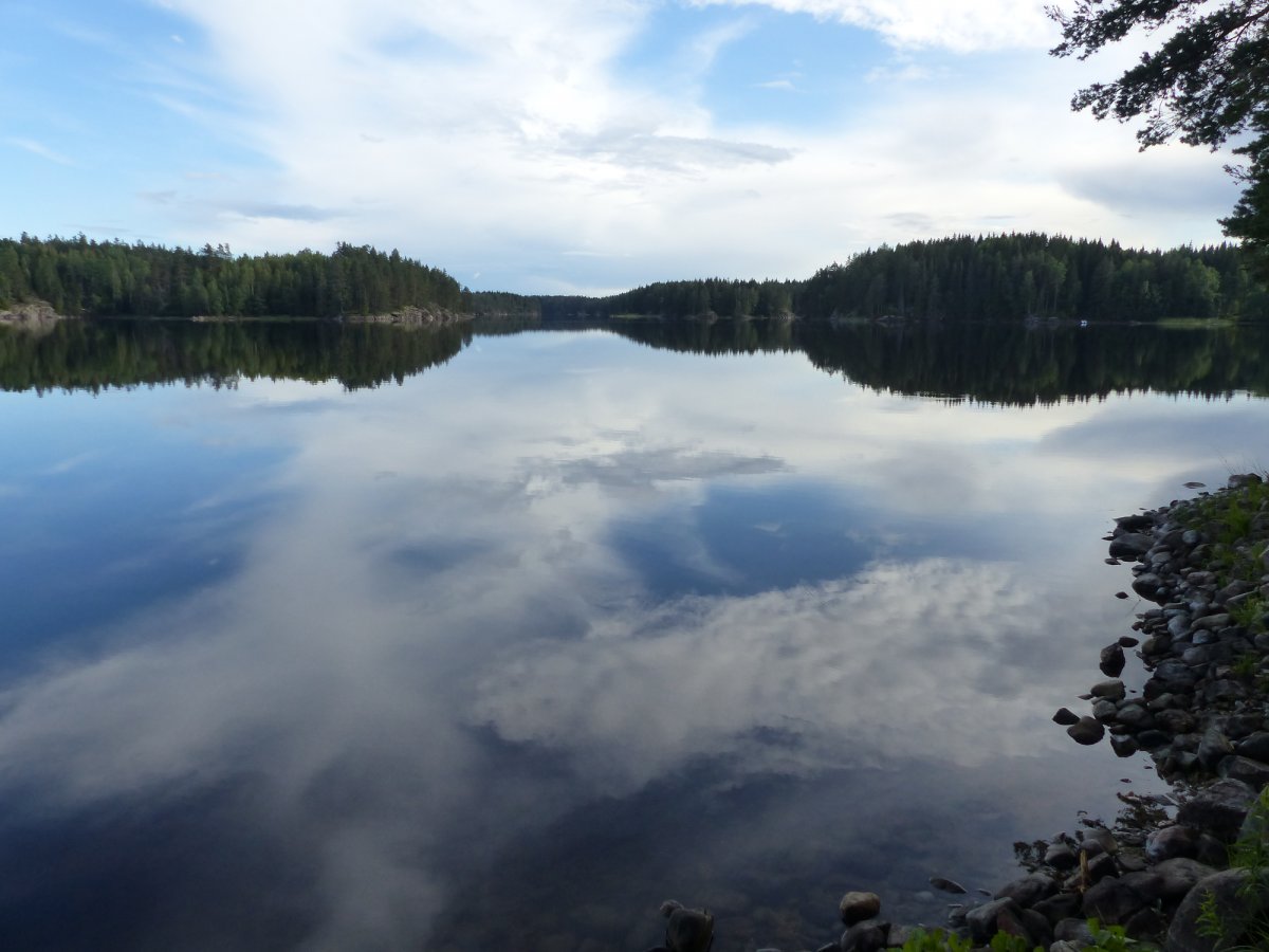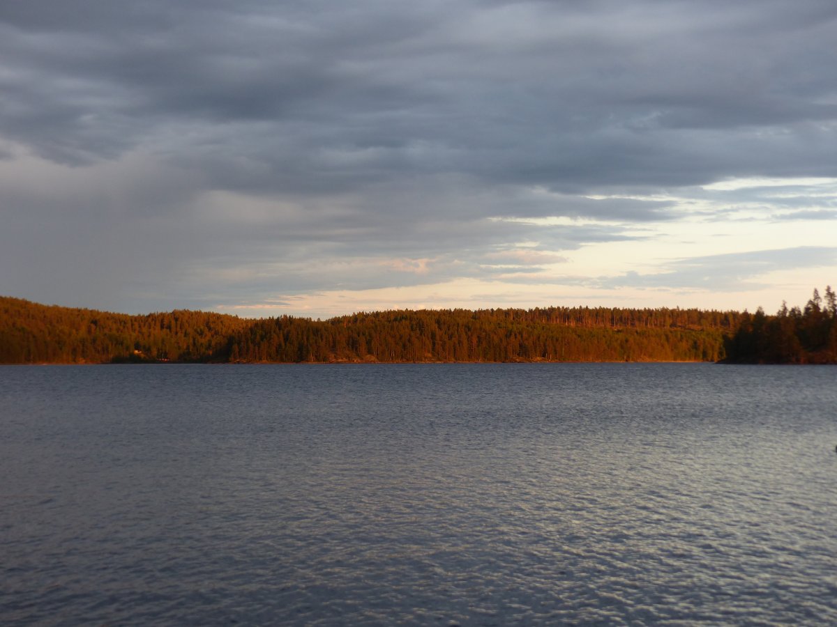 An diesem ersten Tag beschlossen wir das Thomas einen Kanadier alleine fährt und mein Sohn und ich den zweiten Kanadier fahren. So ging es dann los. Das Erste Dano das wir erreichten war Dano 12. Dieses war noch frei und wir entschieden dort unser erstes Camp zu errichten da wir von der Busfahrt doch etwas platt waren. Nach einem guten Abendessen und einer etwas windigen ersten Nacht ging es nach dem Frühstück am nächsten Tag weiter. Am Dano 41 packten bei unserer Ankunft grade zwei Pärchen ihre Sachen um weiter zu fahren. Da für diesen Tag das Wetter schlecht vorher gesagt war beschlossen wir dort unsere zweite Nacht zu verbringen. Dies erwies sich als gute Endscheidung da es an diesem Tag mehrfach stark regnete. Bei einer dieser Regenschauern Landete eine gemischte Truppe von 6 Personen bei uns an um sich unter zu stellen bis der Regen nach ließ. Die 6 kannten wir schon von der Busfahrt da sie mit uns in Köln zugestiegen waren. Im Laufe des Tages gesellten sich noch ein 19 Jähriger mit seinem 77 Jährigem Opa zu uns die die Reise mit einem 40 Jahre altem Faltboot und einem vor Ort Geliehenen Kanadier auf Eigeninitiative unternahmen. An diesem Abend haben wir Salami-Käse Pizza gebacken die einfach genial war. Wir fuhren dann nach dem Frühstück des folgenden Tags weiter zu Dano 15. Dort gesellten sich zwei Holländerrinnen zu uns die über einen Anderen Anbieter reisten. Später am Abend kam noch eine 4 Köpfige Familie die wiederrum über Scandtrack reiste dazu. Am nächsten Morgen endschieden wir zum Dano 19 weiter zu fahren. Da wir inzwischen aus unseren Booten ein Katamaran gemacht hatten der sehr stabil war kamen wir ganz gut voran bis wir auf den eigentlichen See kamen. Durch den Wind waren dort die Wellen ziemlich hoch und wir hielten uns so dicht wie möglich am Ufer. Trotzdem konnten wir es nicht vermeiden das einiges an Wasser in die Boote schwappte obwohl wir bemüht waren die Wellen frontal anzufahren.