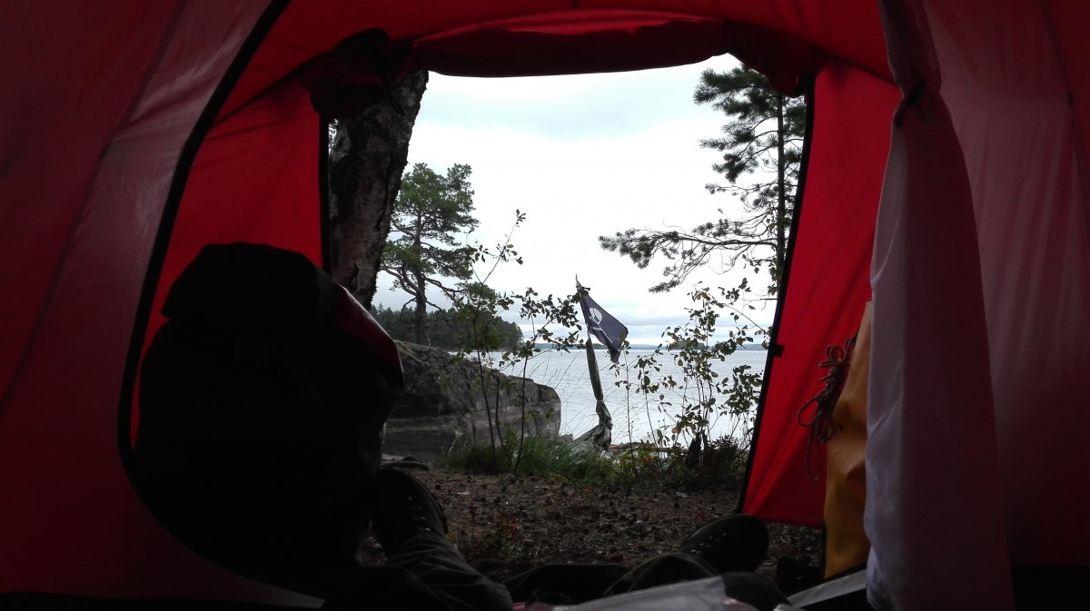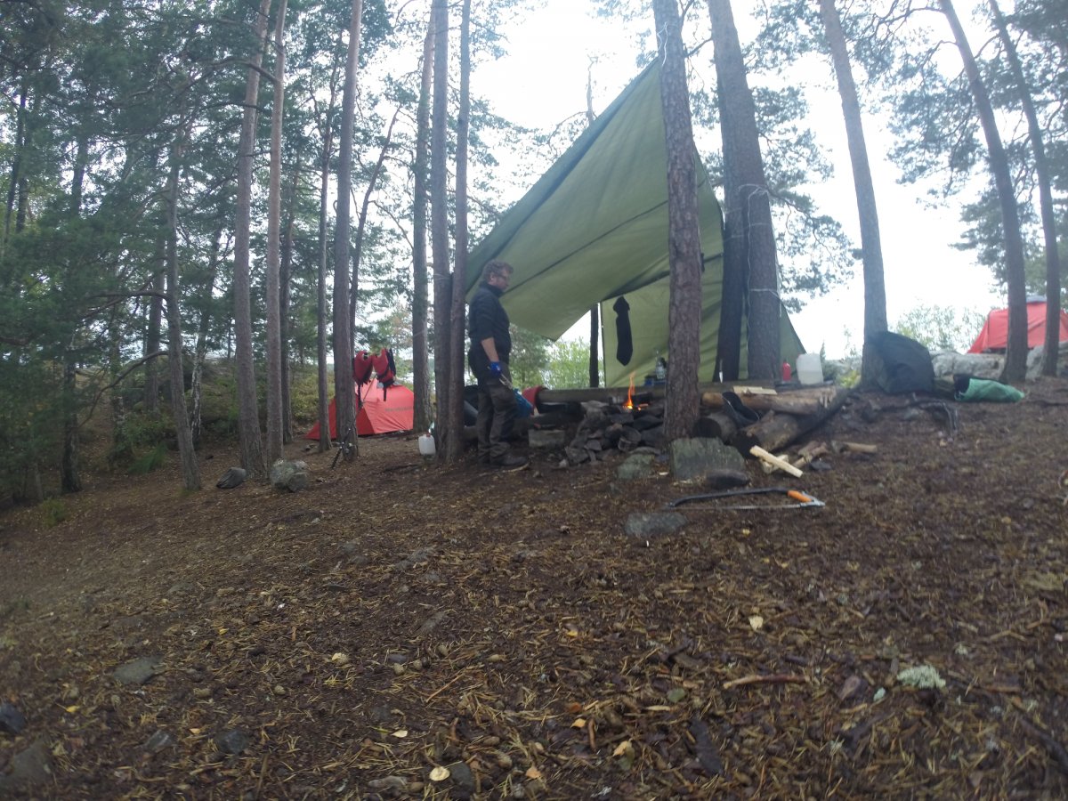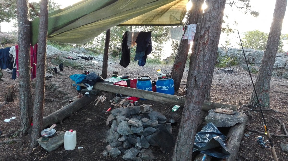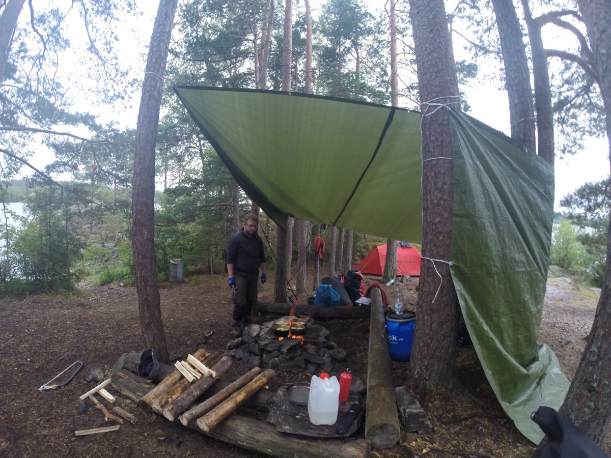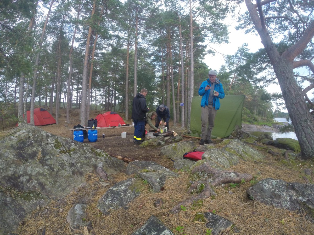 Ab jetzt ging das Survivaln los. Während unserer Reise sind wir mehrere kleinere Inseln sowie Trollön aber auch einige Stellen am Festland angefahren. Alle Plätze ob Camping ground oder nicht waren sehr natürlich und wirklich sauber. Die Zelte die dann von uns das erste Mal aufgebaut worden sind, waren gesäubert und hielten dem schwedischen Wetter stand sowohl Regen als auch starkem Wind. Wichtig ist nur, dass das Innenzelt nicht mit dem Außenzelt in Berührung kommt. Natürlich ist die eigene Insel der Hit. Man sollte nur darauf achten das eben auf den Inseln nicht immer der Platz für ein Zelt da ist, da dieser durch Bäume und deren Wurzeln sowie Felsen und Büsche begrenzt sein könnte. Die auf der von Scandtrack eingezeichneten Camping grounds müssen von Gruppen von fünf und mehr Personen benutzt werden und besitzen alle eine Biotoilette. Für Gruppen von vier und weniger Personen gilt das "Jedermanns recht" sowie das Recht der Klappspatentoilette. So durften wir uns auch in der freien Natur ein schönes Plätzchen suchen. Aber Feuer darf trotzdem nur an vorgefertigten Feuerstellen gemacht werden.