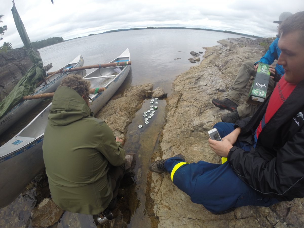 Im Camp kann man dann die Ausrüstung und Verpflegung gegen Vorlage der Ausrüstungs- und Verflegungsmarke erhalten. Das Ausrüstungspaket beinhaltet eine Kiste in der sich sowas wie Beil, Säge, Plane, Grillrost, Kochset, Brennflüssigkeit, Schnur, paar Flaschen, Draht, Messer zum Schneiden, Schneidbrett, Putzlappen etc. und ein Feuerzeug befindet. Dazu kommt noch ein Eimer. Wer will, kann diese auch da auf Schäden und Vollständigkeit kontrollieren. Hier gibt es auch einen Kiosk bei dem man dann noch eine Angelkarte oder sonstiges wie Zahnpasta erwerben kann. Richtig gut waren am Kiosk die Kisten in denen die, die fertig mit ihrem Trip waren, ihre noch übrigen und geschlossenen Lebensmittel packen konnten und diese dann für diejenigen die ihre Tour gerade beginnen zur kostenlosen Verfügung standen.