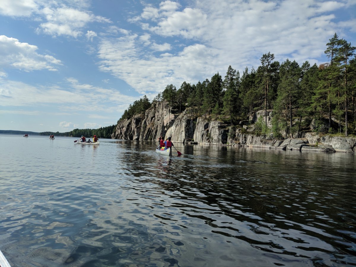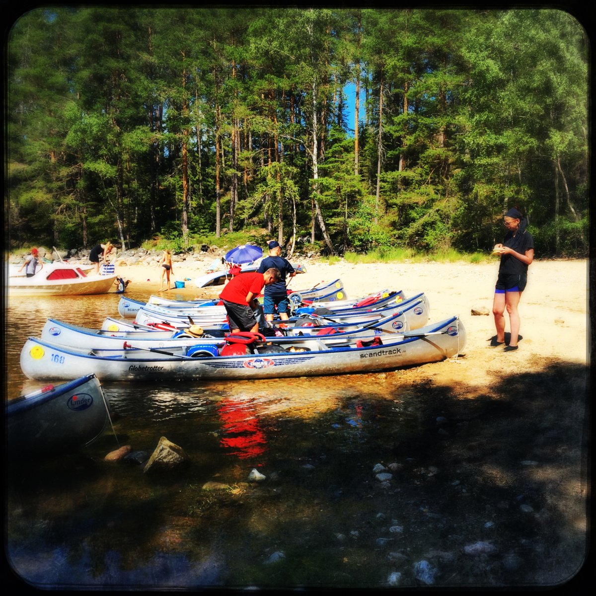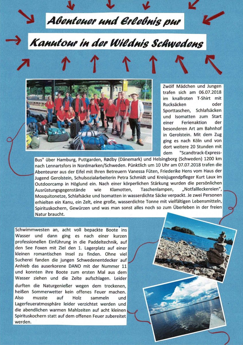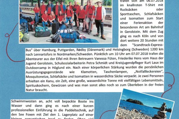 Zwölf Mädchen und Jungen trafen sich am 06.07.2018 im knallroten T-Shirt mit Rucksäcken oder Sporttaschen, Schlafsäcken und Isomatten zum Start einer Ferienaktion der besonderen Art am Bahnhof in Gerolstein. Mit dem Zug ging es nach Köln und von dort weitere 20 Stunden mit dem "Scandtrack-Express-Bus" über Hamburg, Puttgarden, Rødby (Dänemark) und Helsingborg (Schweden) 1200 km nach Lennartsfors in Nordmarken/Schweden. Pünktlich um 10 Uhr am 07.07.2018 trafen die Abenteurer aus der Eifel mit Ihren Betreuern Vanessa Füten, Friederike Hens vom Haus der Jugend Gerolstein, Schulsozialarbeiterin Petra Schmidt und Kreisjugendpfleger Kurt Laux im Outdoorcamp in Höglund ein. Nach einer körperlichen Stärkung wurden die persönlichen Ausrüstungsgegenstände wie Klamotten, Taschenlampen, „Notfallleckereien“, Mosquitonetze, Schlafsäcke und Isomatten in wasserdichte Säcke verpackt. Je zwei Personen erhielten ein Kanu, ein Zelt, eine große, wasserdichte Tonne mit vielfältigen Lebensmitteln, Spirituskochern, Gewürzen und was man sonst alles noch so zum Überleben in der freien Natur braucht.