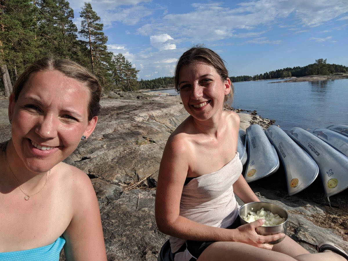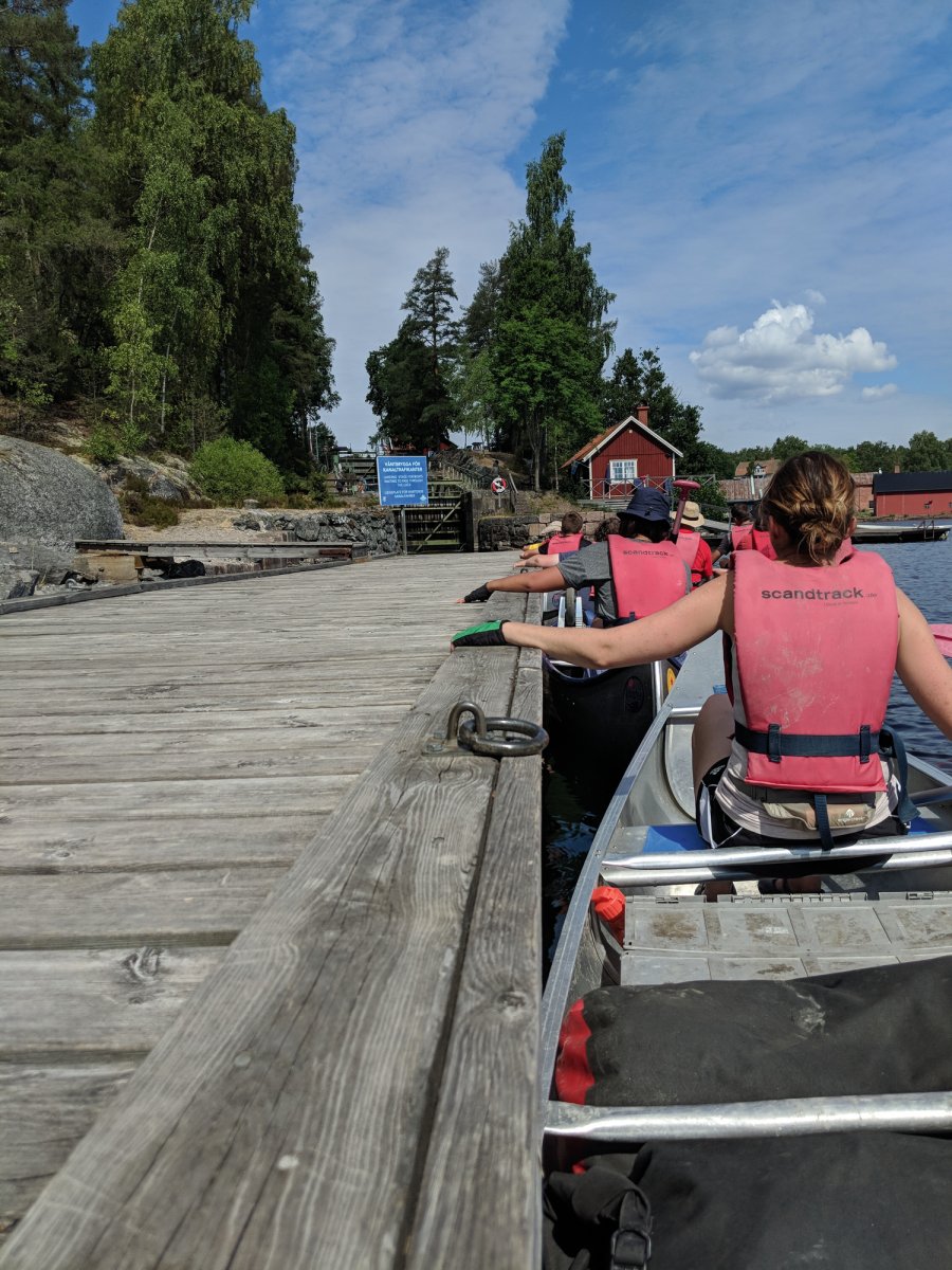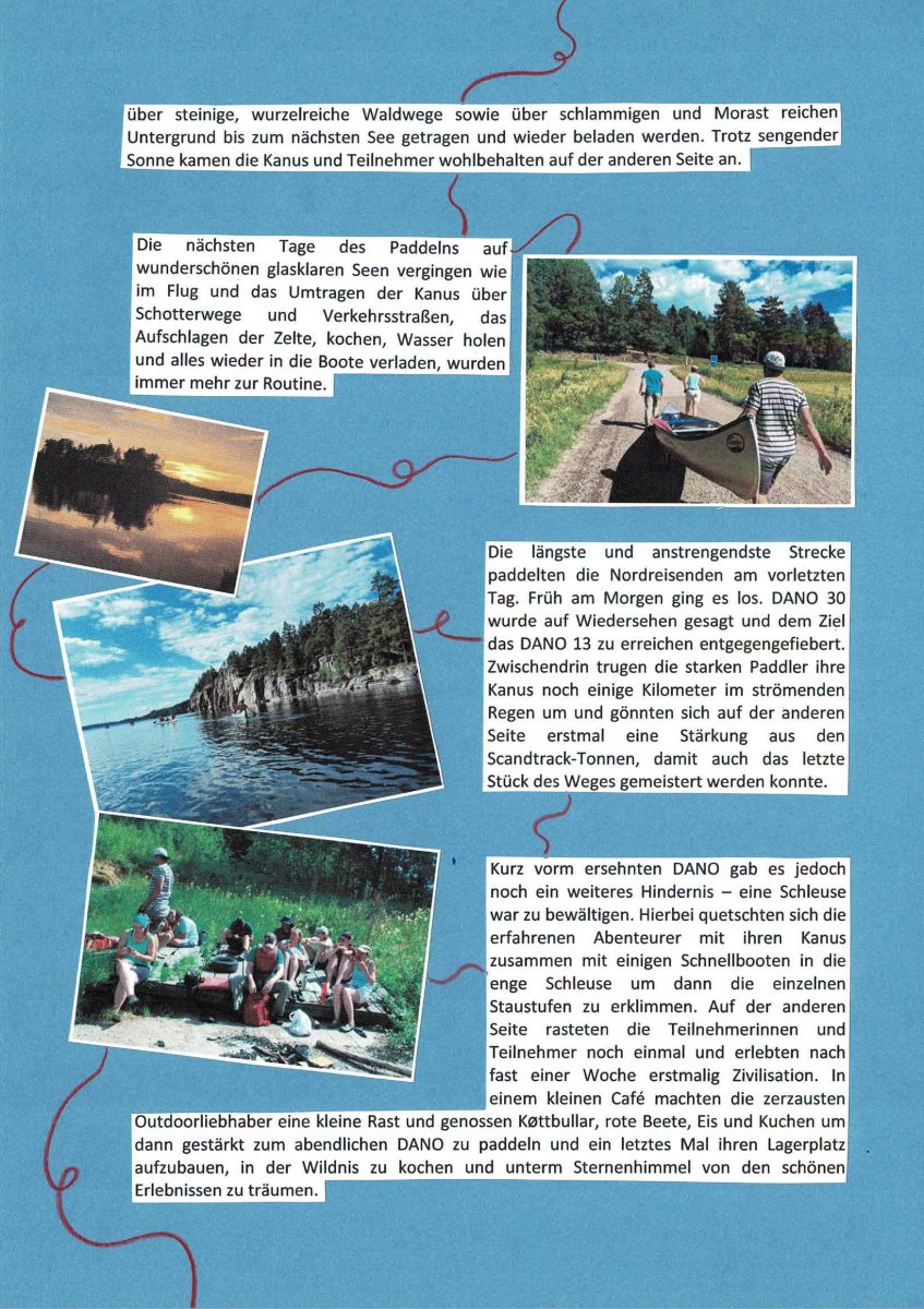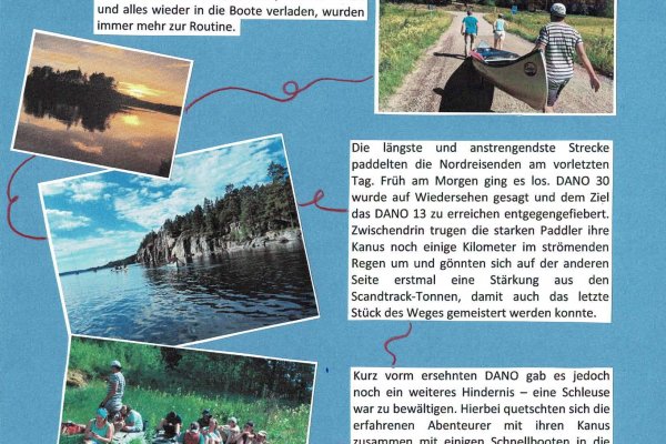 Kurz vorm ersehnten DANO gab es jedoch noch ein weiteres Hindernis – eine Schleuse war zu bewältigen. Hierbei quetschten sich die erfahrenen Abenteurer mit ihren Kanus zusammen mit einigen Schnellbooten in die enge Schleuse um dann die einzelnen Staustufen zu erklimmen. Auf der anderen Seite rasteten die Teilnehmerinnen und Teilnehmer noch einmal und erlebten nach fast einer Woche erstmalig Zivilisation. In einem kleinen Café machten die zerzausten Outdoorliebhaber eine kleine Rast und genossen Køttbullar, rote Beete, Eis und Kuchen um dann gestärkt zum abendlichen DANO zu paddeln und ein letztes Mal ihren Lagerplatz aufzubauen, in der Wildnis zu kochen und unterm Sternenhimmel von den schönen Erlebnissen zu träumen.