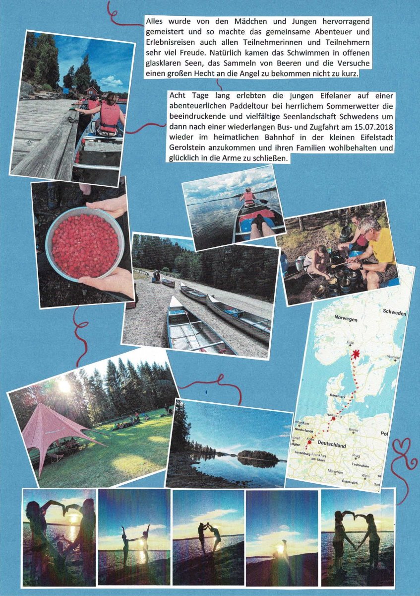 Acht Tage lang erlebten die jungen Eifelaner auf einer abenteuerlichen Paddeltour bei herrlichem Sommerwetter die beeindruckende und vielfältige Seenlandschaft Schwedens um dann nach einer wiederlangen Bus- und Zugfahrt am 15.07.2018 wieder im heimatlichen Bahnhof in der kleinen Eifelstadt Gerolstein anzukommen und ihren Familien wohlbehalten und glücklich in die Arme zu schließen.