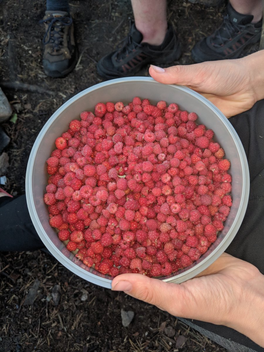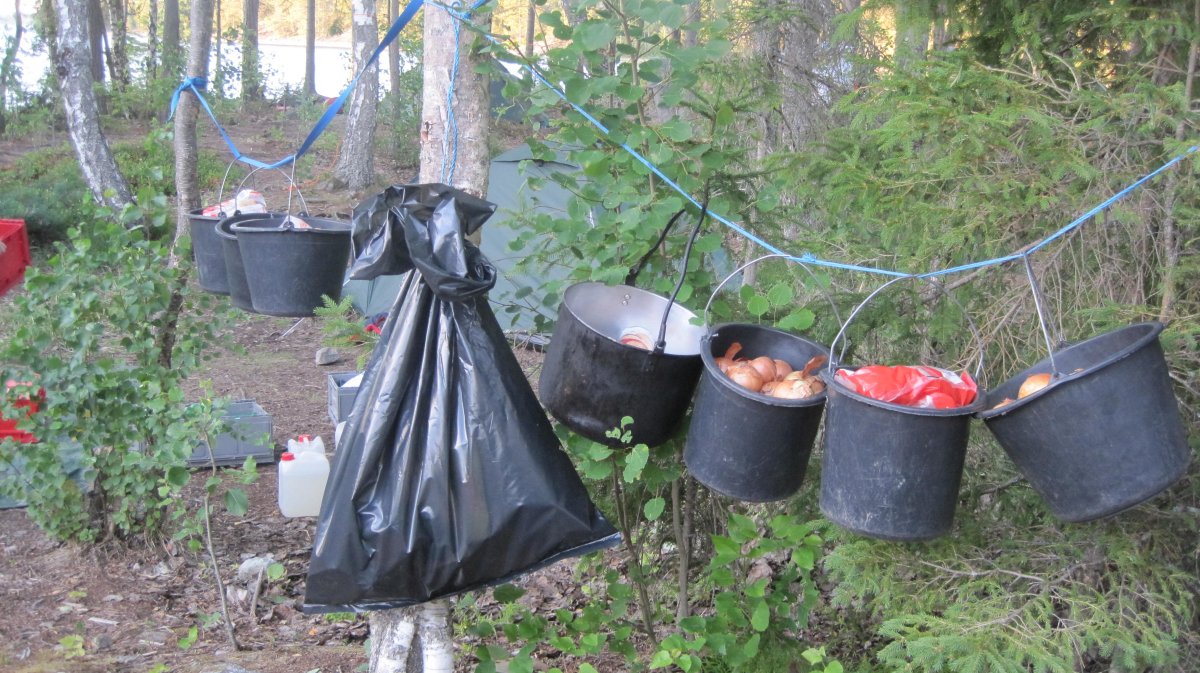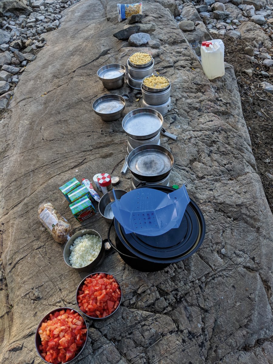 Das Kochen war überhaupt eine der täglichen spannendsten Aktionen - immer wieder feste ebene nicht brennbare Unterlagen zu finden oder herzurichten stellte die Teilnehmer immer wieder vor neue Herausforderungen. Mit spartanischen Küchenutensilien Tomaten, Zwiebeln und Kartoffeln schnippeln und die ganze Masse in 16 kleinen Töpfchen und Pfännchen zubereiten und in einem großen Topf, bis zum gemeinsamen Verzehr, aufzubewahren. Wasser musste jeden Abend und Morgen vom See geholt, in die verschiedenen Töpfchen des Spirituskochers verteilt, abgekocht und danach umgefüllt werden, damit genug Frischwasser für den nächsten Tag bereit stand.