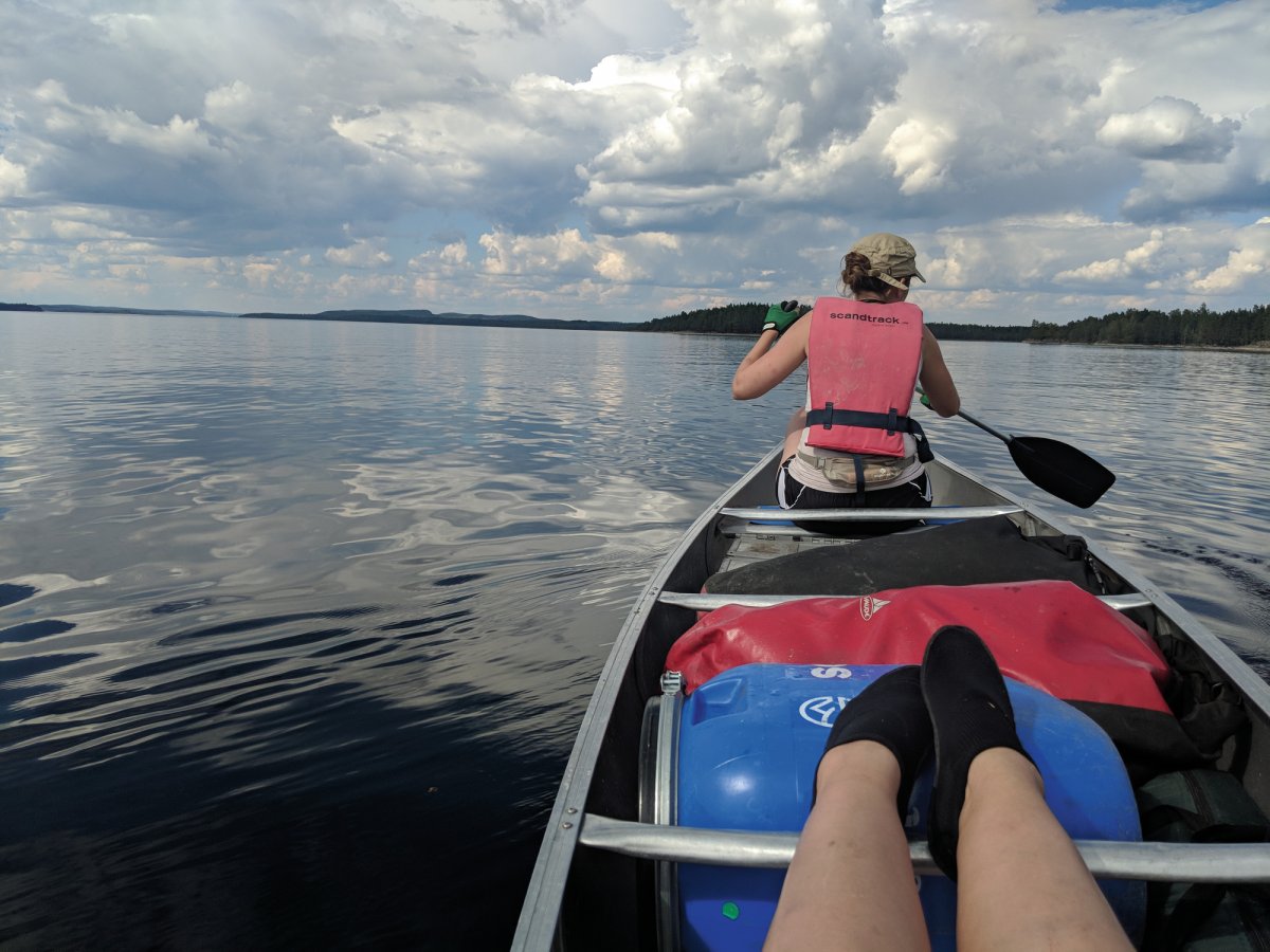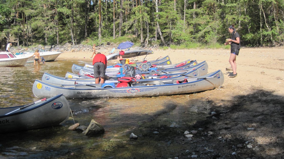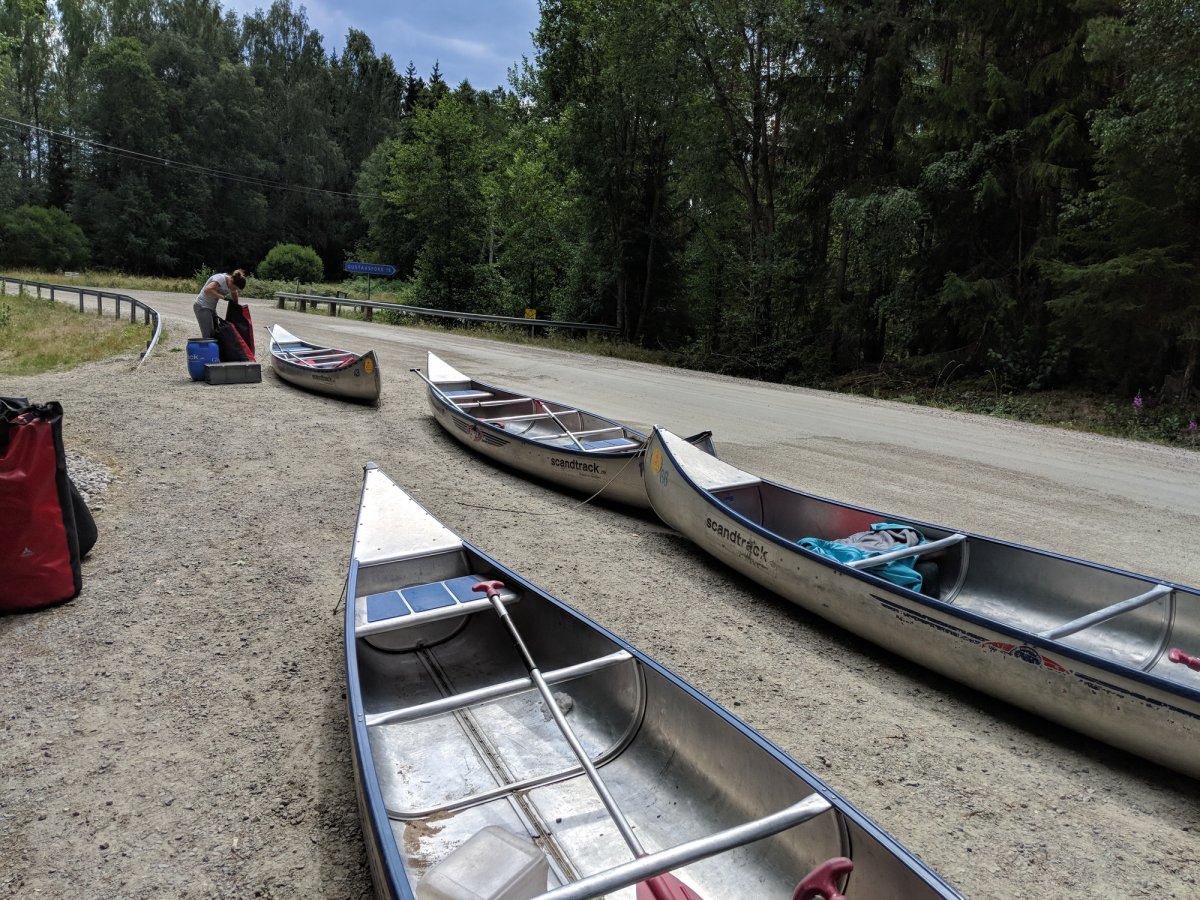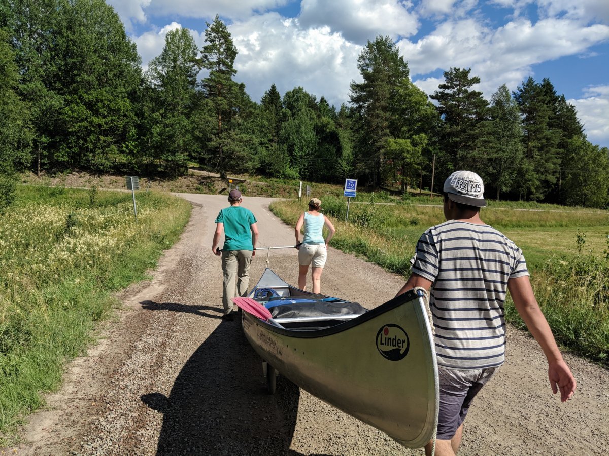 Am nächsten Morgen wurden die gepackten Tonnen, Kisten und Säcke per Ameisenstraße in die Kanus verladen und losgepaddelt. Gegen 13 Uhr kam eine weitere Herausforderung auf die Schwedenentdecker zu. Boote mussten nun Entladen, auf die Kanuwagen geschnallt, über steinige, wurzelreiche Waldwege sowie über schlammigen und Morast reichen Untergrund bis zum nächsten See getragen und wieder beladen werden. Trotz sengender Sonne kamen die Kanus und Teilnehmer wohlbehalten auf der anderen Seite an.