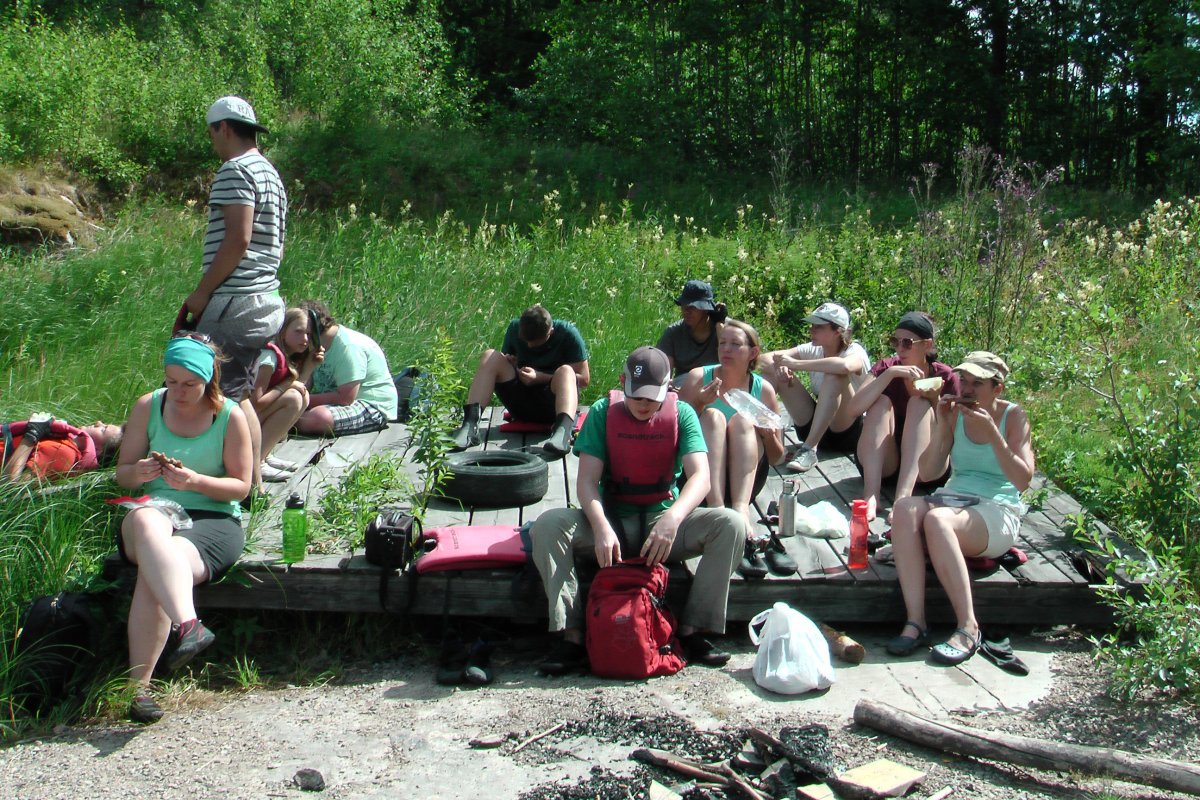 Schon am Mittag erreichten unsere Abenteurer einen Platz um ihre selbstgeschmierten Brote zu verzehren um dann gestärkt weiter Richtung Norden zu paddeln. Nach kurzem Zweifeln und erneutem konsultieren der Karte wurde den Navigatoren jedoch langsam klar, dass sie die 8 Kanus zu weit nach Norden gelotst hatten und mussten mit bedauern den Mitpaddlern sagen, dass die Insel, die sie zur Mittagszeit besucht hatten das auserkorene DANO war. Also hieß es: Umkehren und nochmal zurück.