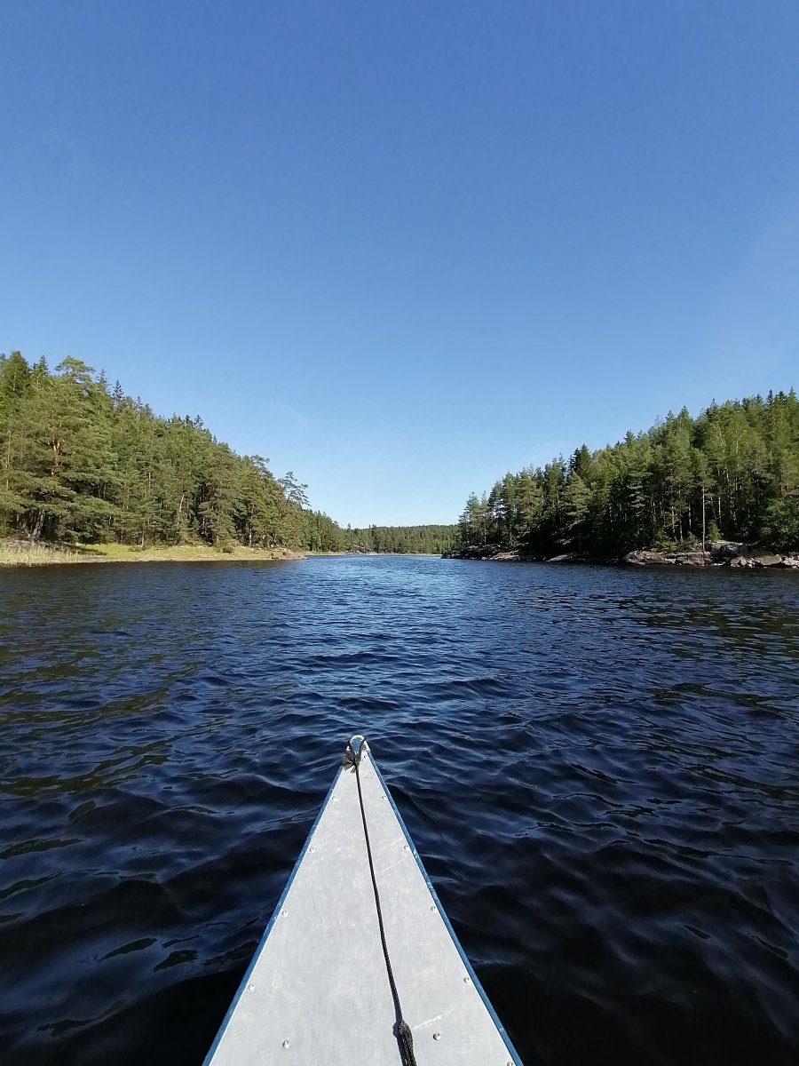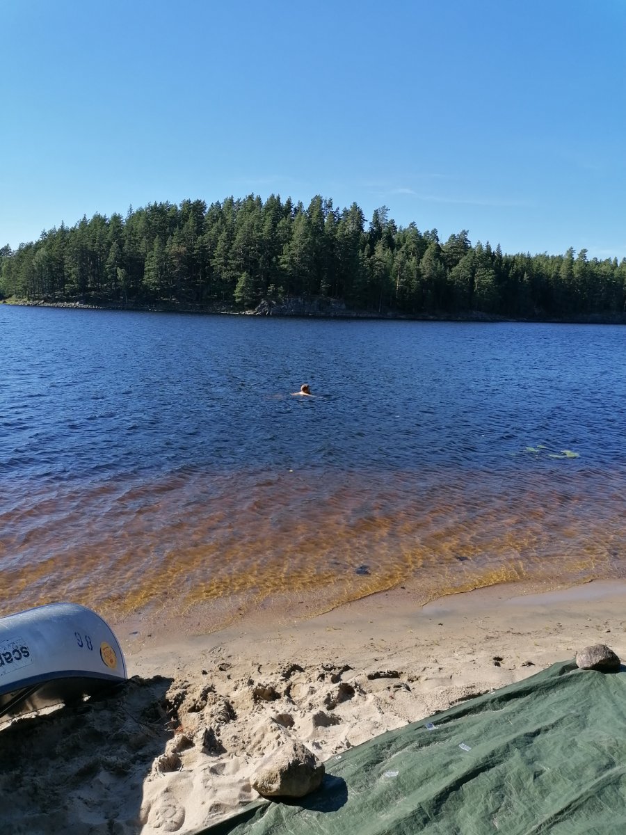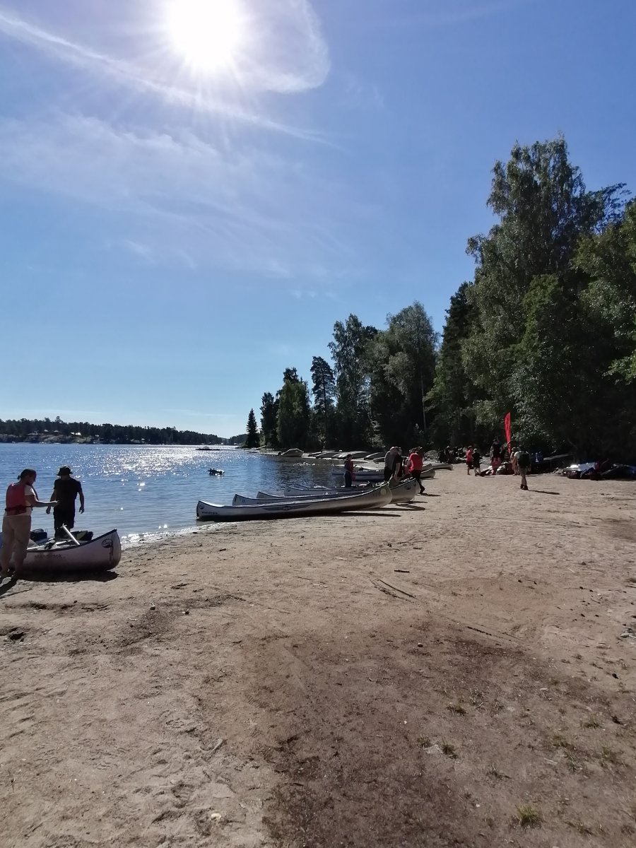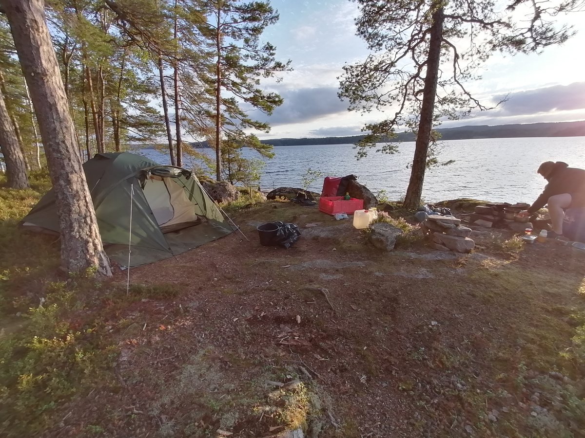 Alles begann mit Bestem Wetter für eine Kanutour. Sonne, ein leichtes Lüftchen und angenehme Temperaturen machten noch mehr Lust drauf, den ganzen Tag auf dem Kanu im Wasser zu verbringen. Vorab hatten wir uns natürlich schon Gedanken gemacht, wo wir mindestens mal hinfahren wollen, und so steuerten wir zielgerichtet auf den ersten kleinen Seitenarm zu und paddelten recht weit rein. An den Ufern konnte man hin und wieder Leute sehen, die bereits Ihr Lager aufgeschlagen hatten, also fingen wir auch an nach einer geeigneten Stelle zu suchen. Dies fiel uns am ersten Tag gar nicht mal so leicht. Schließlicht entschieden wir uns dann an einem kleinen Strand halt zu machen und dort ein Lager aufzubauen. Da der Platz dort recht begrenzt war überlegten wir uns, ob wir die Nacht ohne Zelt unterm Sternenhimmel verbringen sollten, doch viel wichtiger war es uns dann in dem Moment nach der langen Busfahrt und bei dem schönen Wetter einmal in den See zu springen und uns zu erfrischen. Als wir dann auch gedanklich endlich angekommen waren entschieden wir uns abends nochmal loszuziehen und einen besseren Schlafplatz zu finden, also fuhren wir den Seitenarm wieder runter und fanden schließlich die für uns perfekte Stelle für die erste Übernachtung. An diesem Platz haben wir auch das erste und letzte Mal versucht einen Fisch zu angeln, wobei wir als komplett unerfahrene Angler recht schnell wieder aufgegeben haben und uns lieber dem Dosenfisch aus der Futtertonne gewidmet haben. Da jedoch auch die ein oder andere Mücke übers Wasser flog konnte man hin und wieder Fische aus dem Wasser springen sehen was für uns jedoch hieß, dass wir uns gut mit „Antimückenspray“ einsprühen sollten. So ging dann schließlich der erste Tag vorbei. Am ersten Morgen fiel uns dann während des Frühstücks auf, dass wir das Outdoor-Kochbuch von Scandtrack in unserer Handgepäck-Tasche im Camp vergessen hatten. Nach Rücksprache mit dem Scandtrack-Team konnten wir zurück paddeln und uns das Buch noch holen. Somit waren die kommenden Kochsessions auch gerettet.