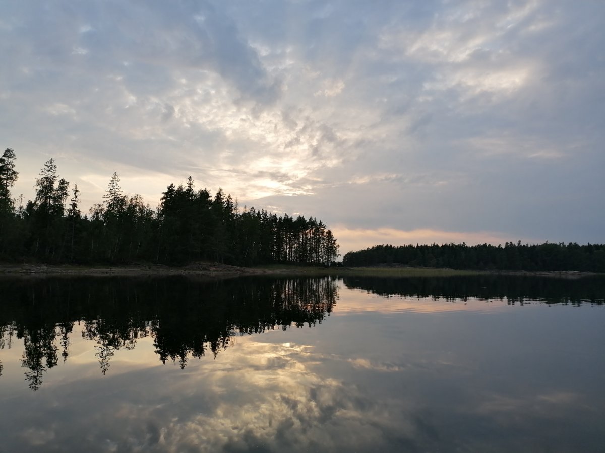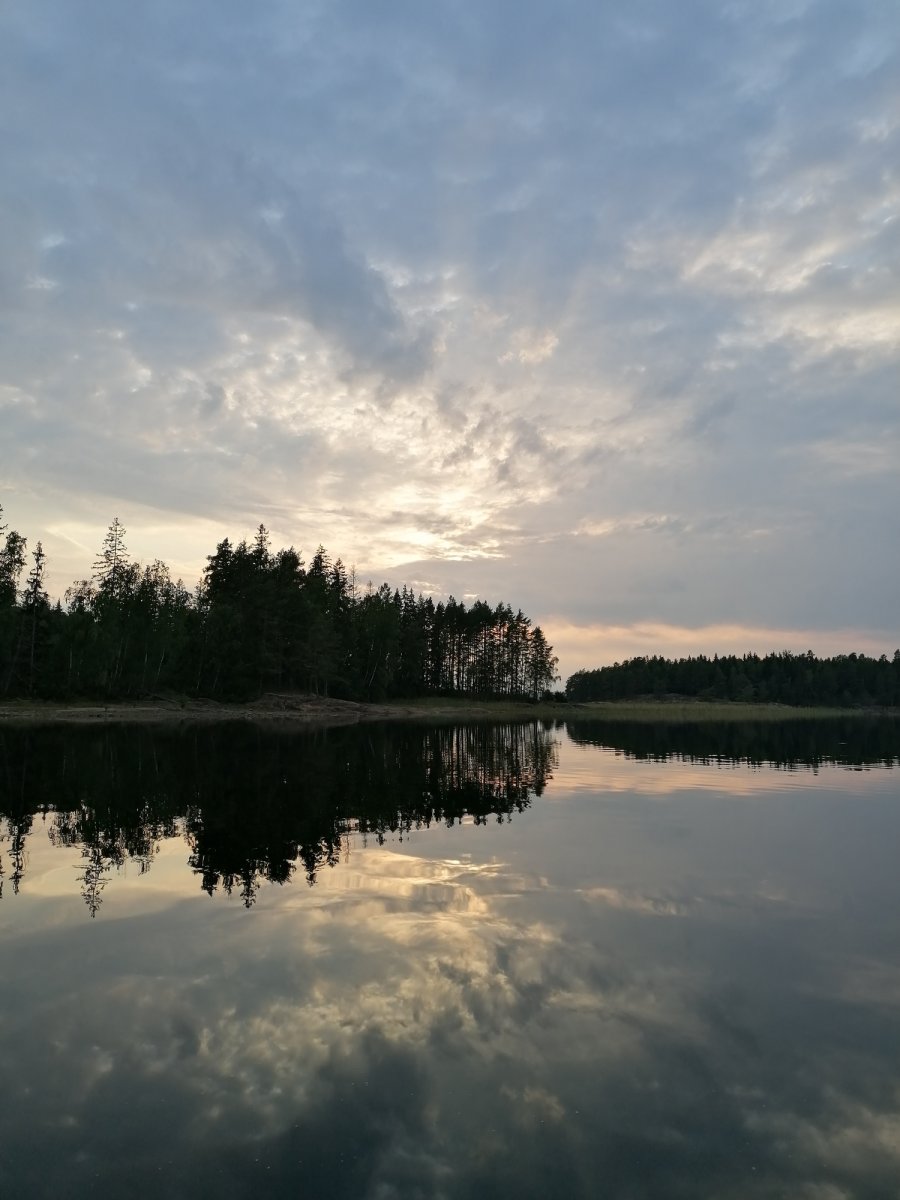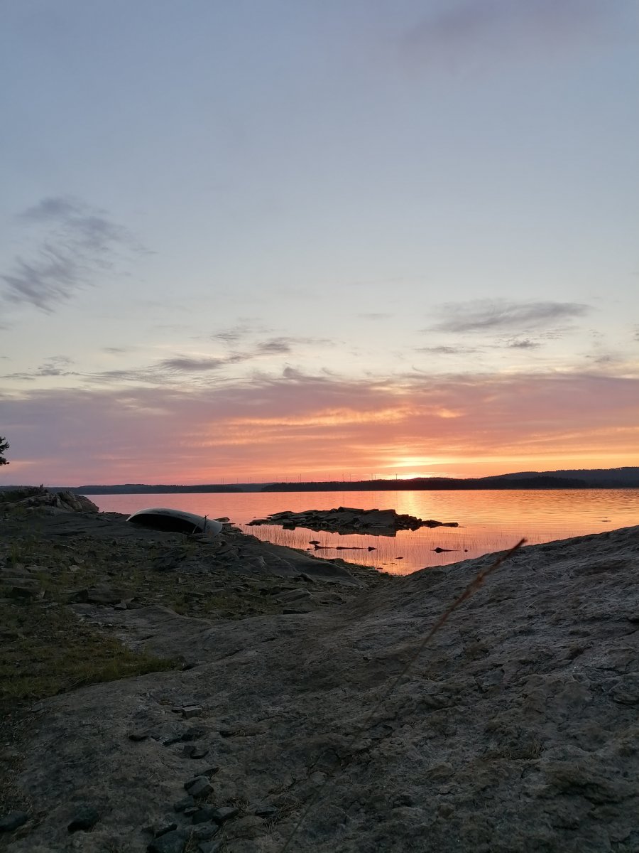 Als wir dann zum Autofriedhof aufbrachen konnten wir unser Kanu mit allen Sachen drin komplett am Ufer stehen lassen (wir waren nicht die einzigen) und später einfach wieder abfahren. Nach langer Fahrt auf ruhigem Wasser waren wir dann an der Insel, die sich zur Hälfte in Schweden und zur Hälfte in Norwegen befindet, angekommen. Wir waren jedoch nicht die einzigen, die die Idee hatten dort hinzufahren, somit entschieden wir uns unser Lager nicht dort aufzuschlagen, sondern wieder zurückzufahren. Nach weiteren Stunden auf dem Wasser fing es leicht an zu regnen, weshalb wir dann doch den nächstbesten Platz anfuhren, um schnell das Zelt aufzubauen. An Tag 4 konnten wir unser Lager leider nicht wechseln, da wir Gewitter, Donner und Starkregen hatten. An Land sind diese Wetterbedingungen kein Problem und es war auch sehr schön mal einen Tag im Zelt auszuruhen. Ausgerüstet mit gutem Tarp und Zelt trotzten wir an diesem Tag jeglichen Wetterlaunen und konnten neben Blaubeeren und Preiselbeeren auch jegliche Pilze finden (die wir nur bestaunt haben, da wir uns mit den Arten nicht genau auskennen). Am nächsten Tag fuhren wir nach dem morgendlichen Bad im See hoch in den Norden. Auf dem Weg machten wir halt auf einer Insel, auf der wir vom Wasser aus eine kleine Steinhütte entdeckten, die wir uns näher angucken wollten. In der Hütte lag ein Gästebuch (in dem wir uns ebenfalls verewigt haben) und Bilder von der Entstehung der Hütte im Jahr 1985. Als wir weiter fuhren nahm der Wind immer mehr zu, bis wir schließlich so Starke Böen hatten, dass wir für eine Unterbrechung ans Ufer fahren mussten, um nicht von einer Welle erfasst zu werden. An diesem Tag nahm der Wind nicht mehr ab und so entschieden wir uns an Ort und Stelle unser Nachtlager aufzuschlagen. Auch für die letzten Tage waren Sturm und Gewitter angesagt, also fuhren wir so früh es ging am nächsten Morgen los Richtung Basislager, da wir kein Risiko eingehen wollten. Zu unserem Glück hatte sich die Wettervorhersage mit Gewitter nicht mehr bewahrheitet und so konnten wir die letzten zwei Tage gemütlich bei gutem Wetter in Richtung des Basislagers paddeln und wunderschöne Sonnenuntergänge genießen. Neben Fischen, Enten und Kühen haben wir an den letzten beiden Tagen noch einen Fuchs und einen Krebs zu Gesicht bekommen.
