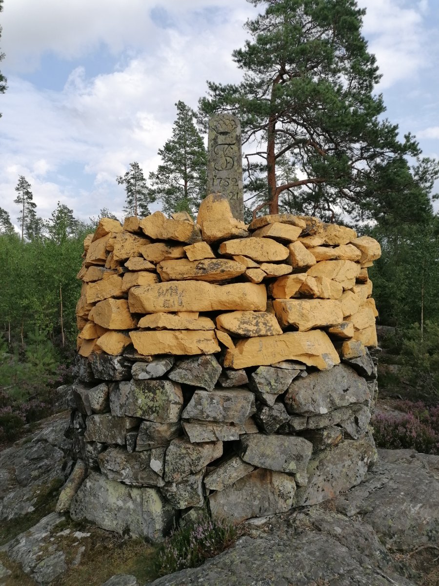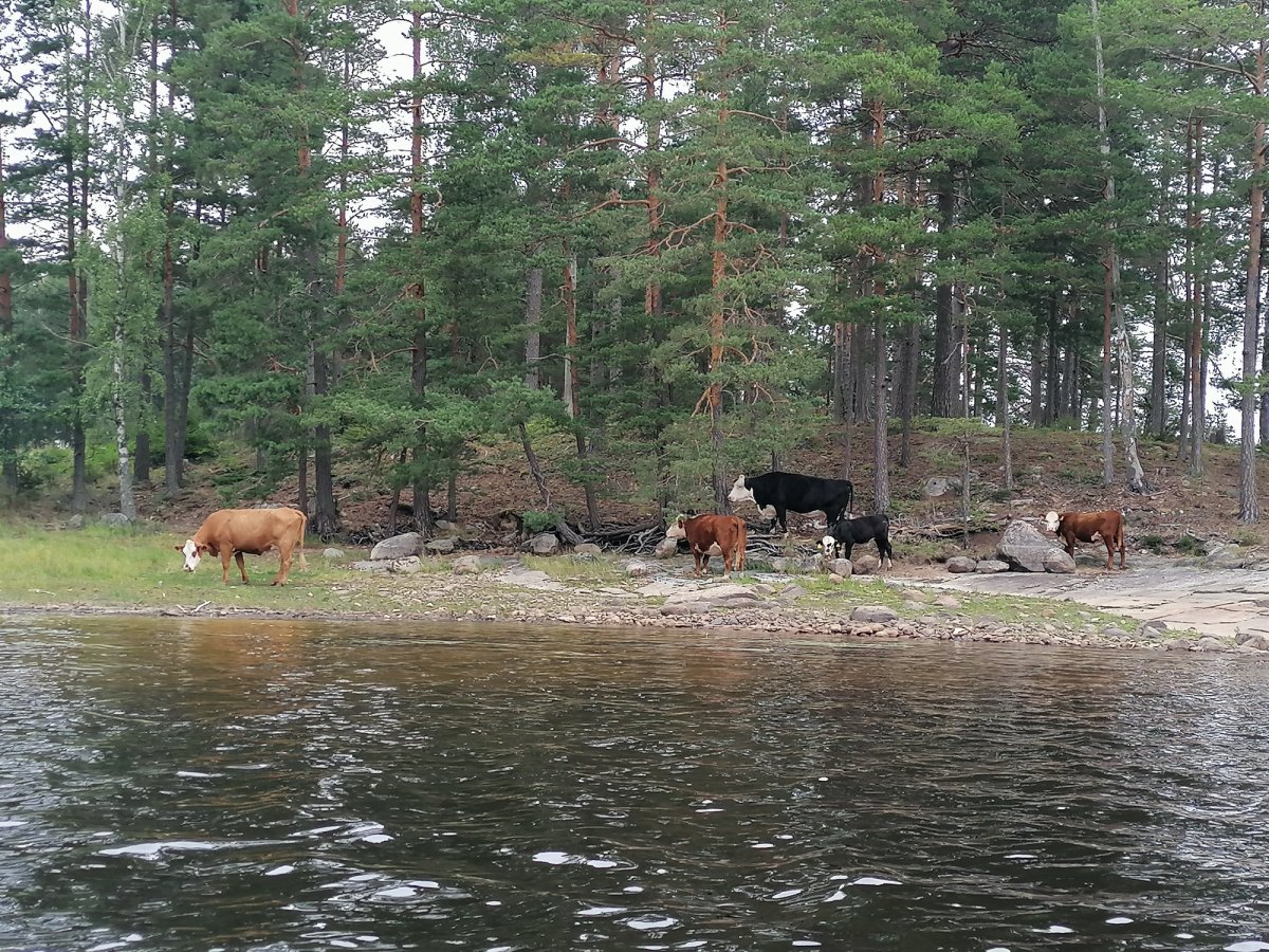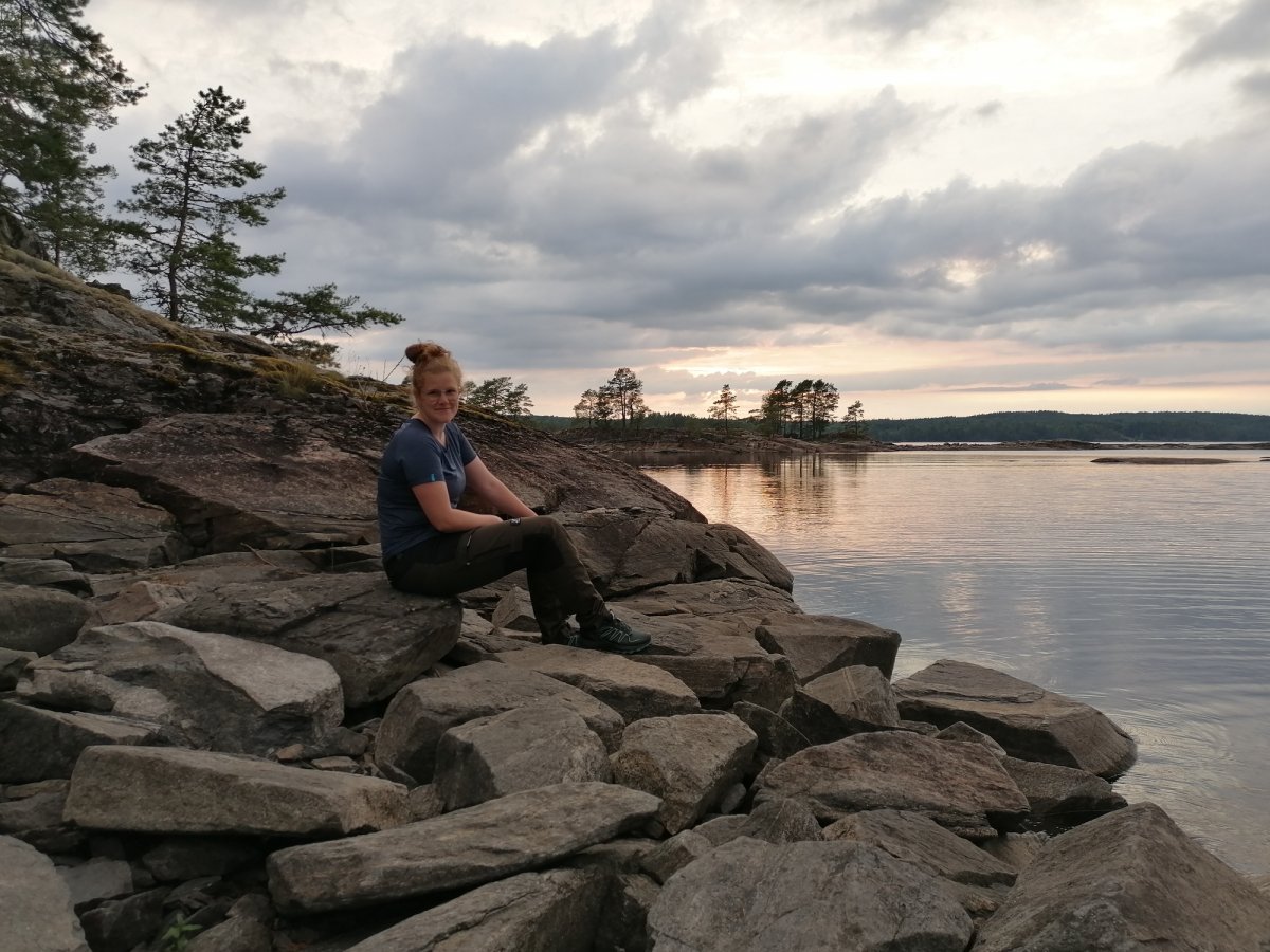 Als wir dann zum Autofriedhof aufbrachen konnten wir unser Kanu mit allen Sachen drin komplett am Ufer stehen lassen (wir waren nicht die einzigen) und später einfach wieder abfahren. Nach langer Fahrt auf ruhigem Wasser waren wir dann an der Insel, die sich zur Hälfte in Schweden und zur Hälfte in Norwegen befindet, angekommen. Wir waren jedoch nicht die einzigen, die die Idee hatten dort hinzufahren, somit entschieden wir uns unser Lager nicht dort aufzuschlagen, sondern wieder zurückzufahren. Nach weiteren Stunden auf dem Wasser fing es leicht an zu regnen, weshalb wir dann doch den nächstbesten Platz anfuhren, um schnell das Zelt aufzubauen. An Tag 4 konnten wir unser Lager leider nicht wechseln, da wir Gewitter, Donner und Starkregen hatten. An Land sind diese Wetterbedingungen kein Problem und es war auch sehr schön mal einen Tag im Zelt auszuruhen. Ausgerüstet mit gutem Tarp und Zelt trotzten wir an diesem Tag jeglichen Wetterlaunen und konnten neben Blaubeeren und Preiselbeeren auch jegliche Pilze finden (die wir nur bestaunt haben, da wir uns mit den Arten nicht genau auskennen). Am nächsten Tag fuhren wir nach dem morgendlichen Bad im See hoch in den Norden. Auf dem Weg machten wir halt auf einer Insel, auf der wir vom Wasser aus eine kleine Steinhütte entdeckten, die wir uns näher angucken wollten. In der Hütte lag ein Gästebuch (in dem wir uns ebenfalls verewigt haben) und Bilder von der Entstehung der Hütte im Jahr 1985. Als wir weiter fuhren nahm der Wind immer mehr zu, bis wir schließlich so Starke Böen hatten, dass wir für eine Unterbrechung ans Ufer fahren mussten, um nicht von einer Welle erfasst zu werden. An diesem Tag nahm der Wind nicht mehr ab und so entschieden wir uns an Ort und Stelle unser Nachtlager aufzuschlagen. Auch für die letzten Tage waren Sturm und Gewitter angesagt, also fuhren wir so früh es ging am nächsten Morgen los Richtung Basislager, da wir kein Risiko eingehen wollten. Zu unserem Glück hatte sich die Wettervorhersage mit Gewitter nicht mehr bewahrheitet und so konnten wir die letzten zwei Tage gemütlich bei gutem Wetter in Richtung des Basislagers paddeln und wunderschöne Sonnenuntergänge genießen. Neben Fischen, Enten und Kühen haben wir an den letzten beiden Tagen noch einen Fuchs und einen Krebs zu Gesicht bekommen.