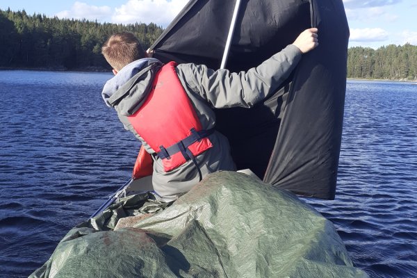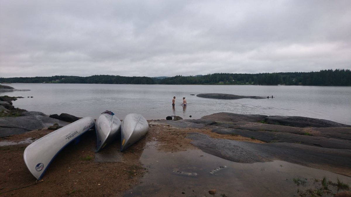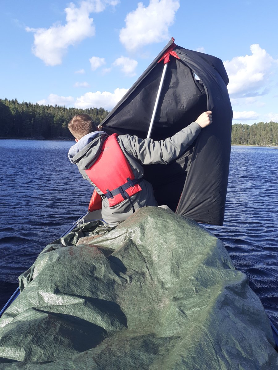 Ankunft im Basiscamp Lennartsfors gegen Mittag im Regenwetter. Im Regenschutz schlonkerten wir Kaffee und Wurstbrötchen. Gestärkt ging es dann zum Ausrüstungsverleih, wo wir wasserdichte Packsäcke, ein Zelt, Ruder und Küchenequipment erhielten. Nachdem das Boot beladen war, ging es nun auf See.